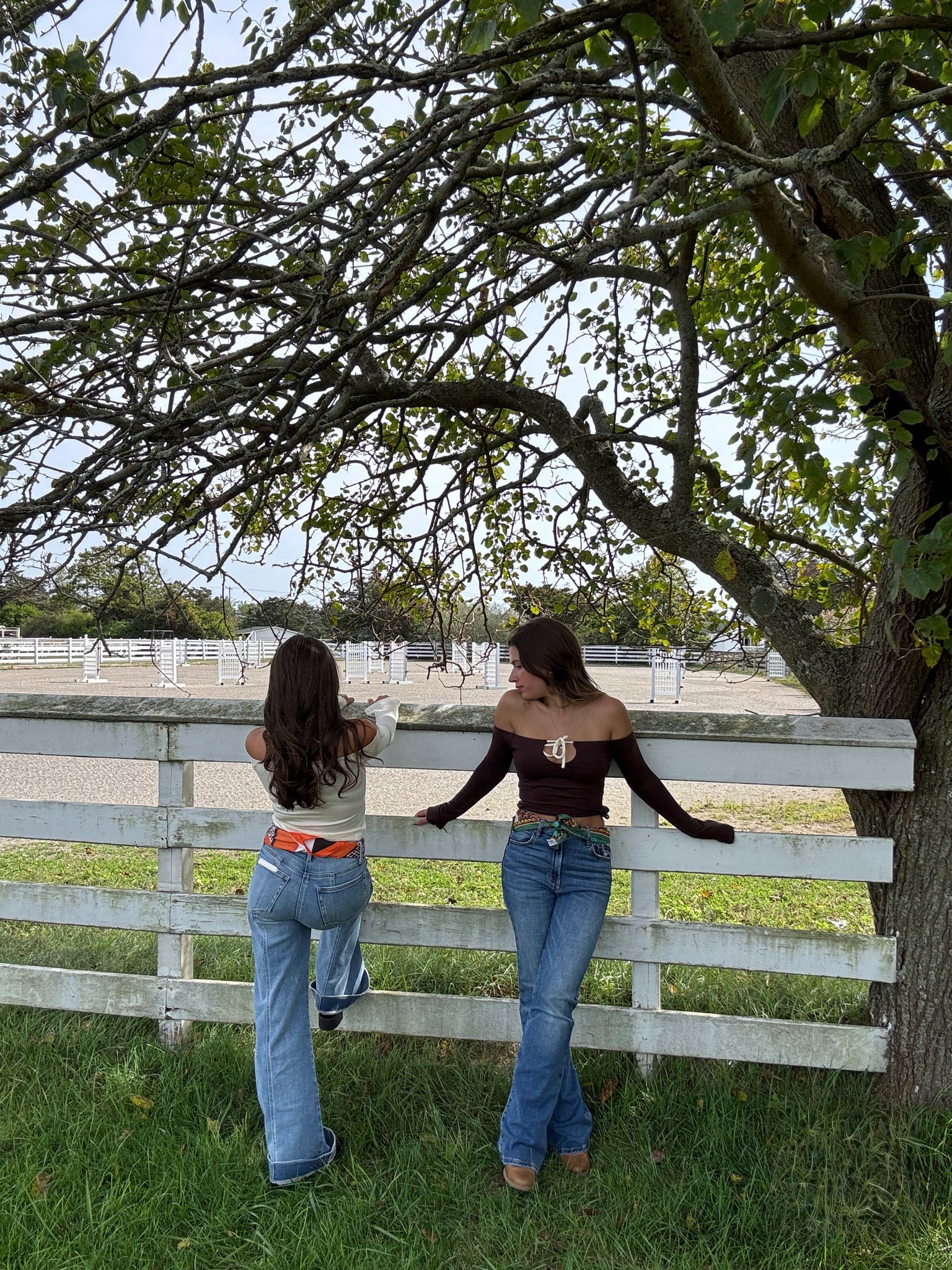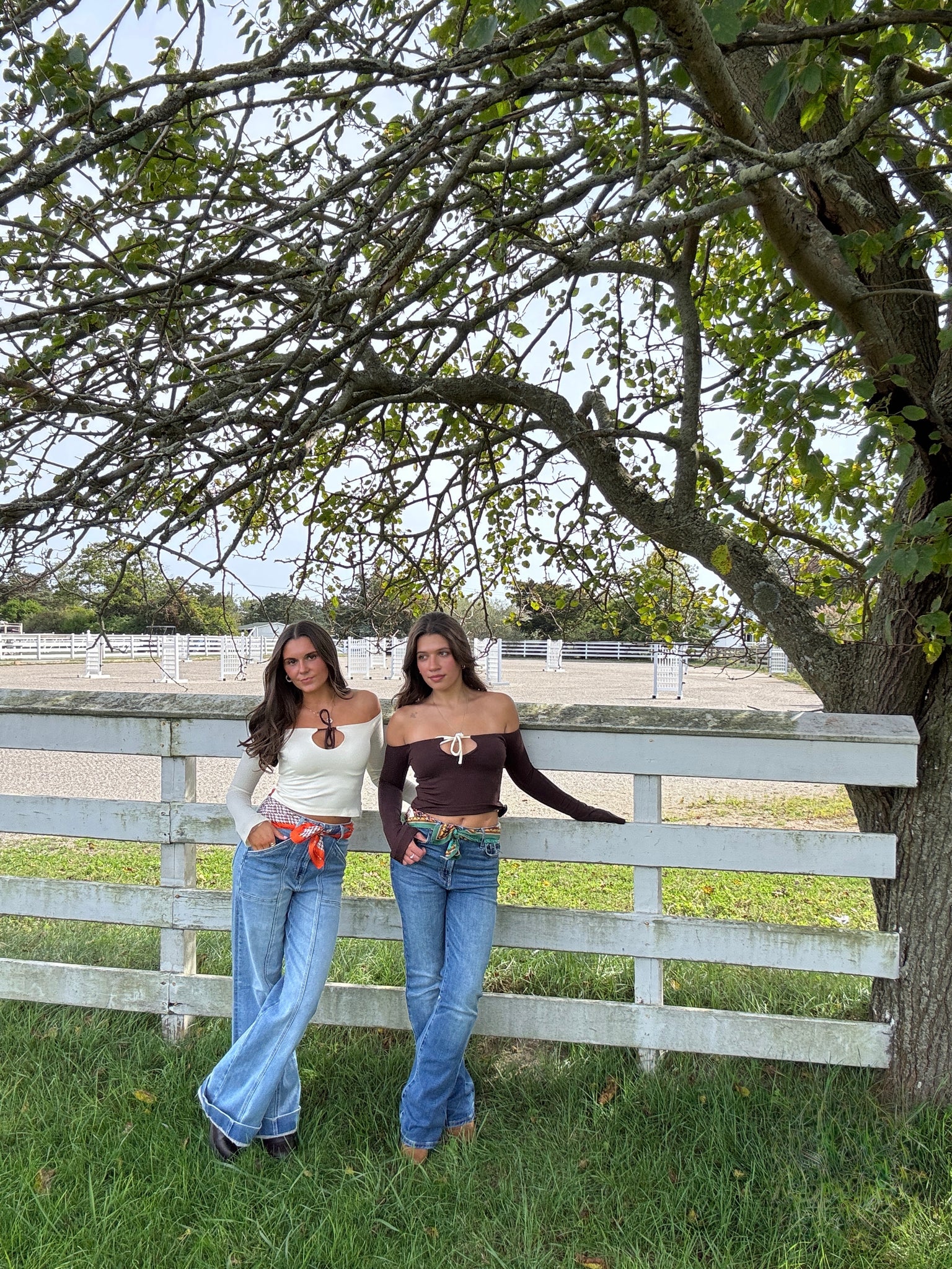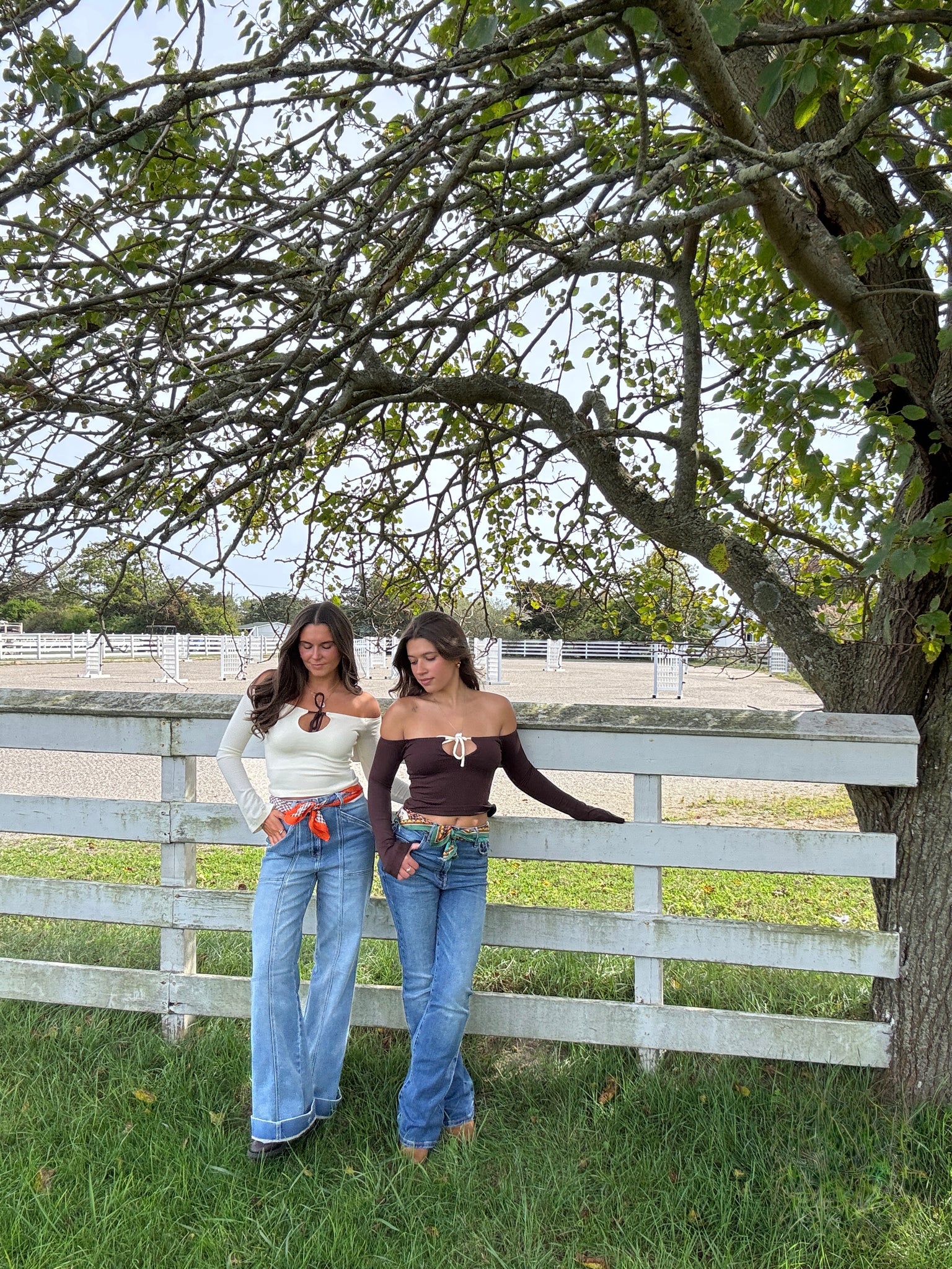 Ribbon Knit Top features a round neckline and a flare sleeve.