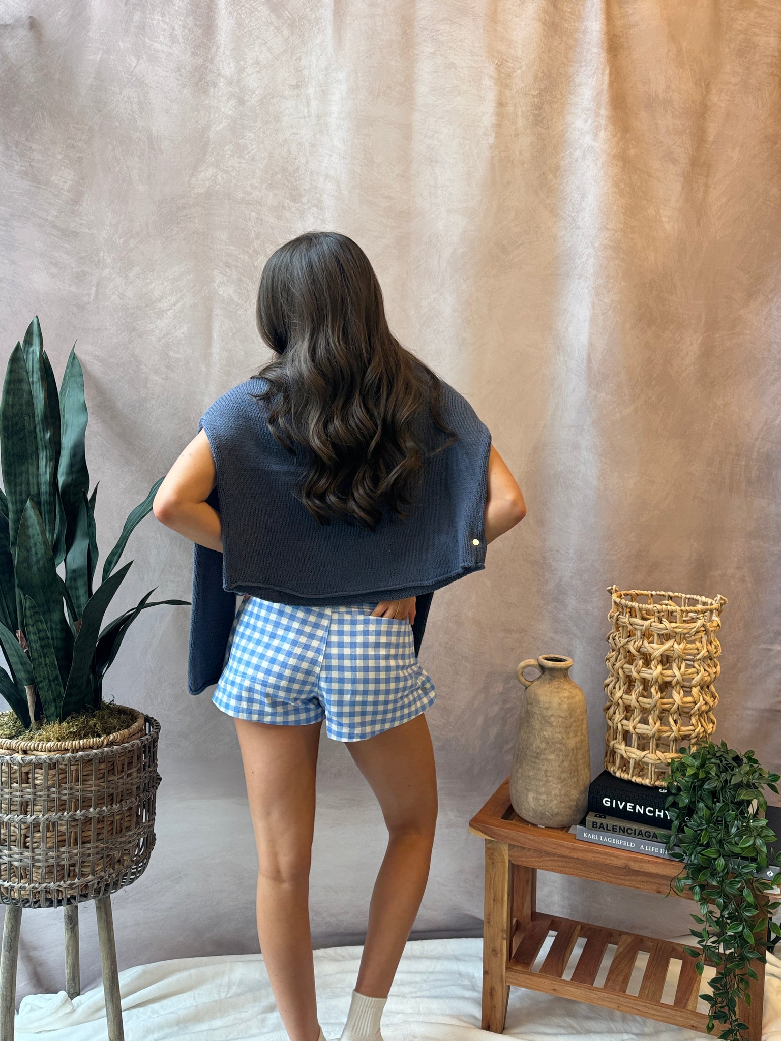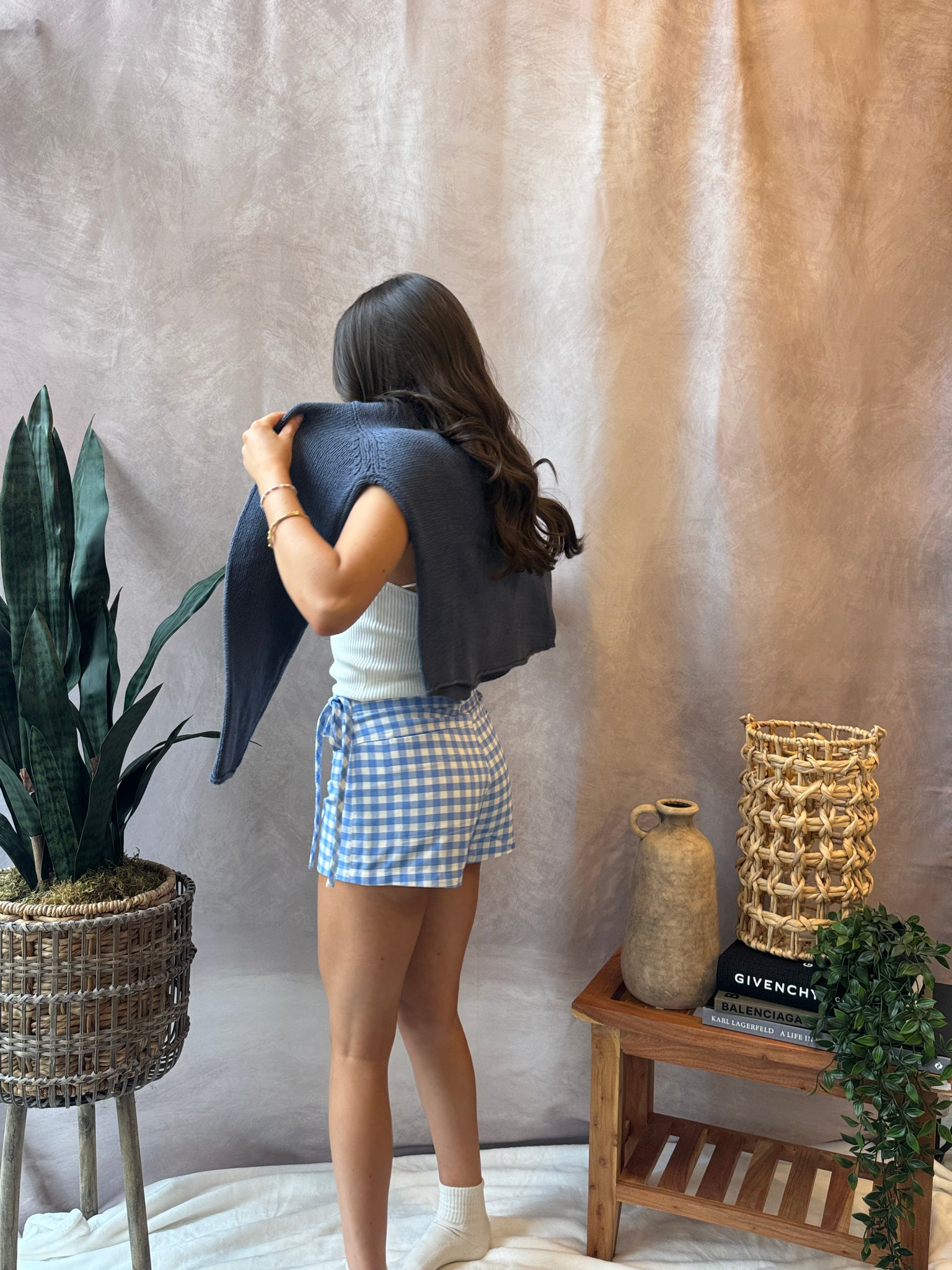 Wrap Skort features a wrap front design with built in shorts and zipper closure underneath, and a cotton gingham fabric with a high waisted fit for a classic look.