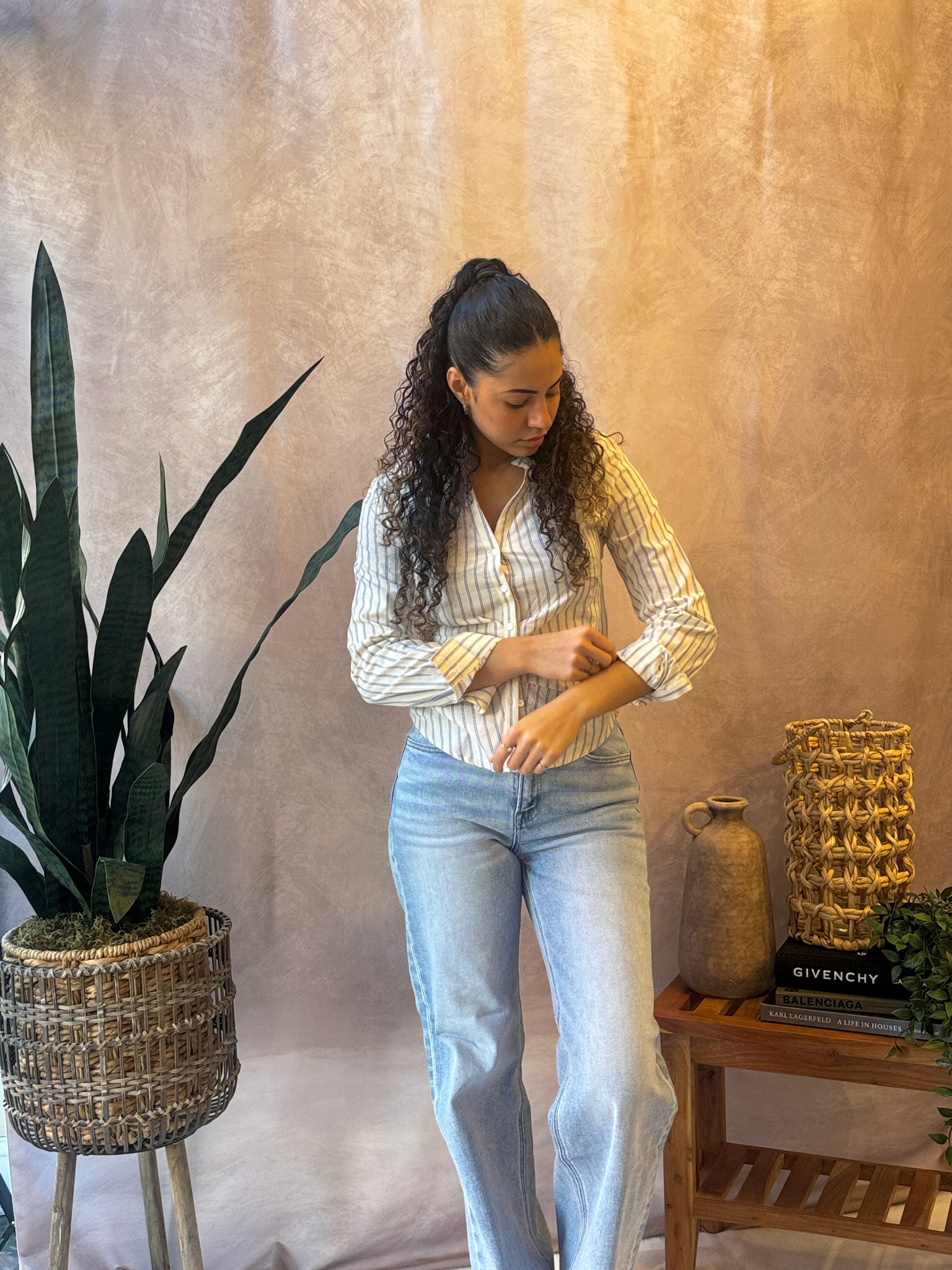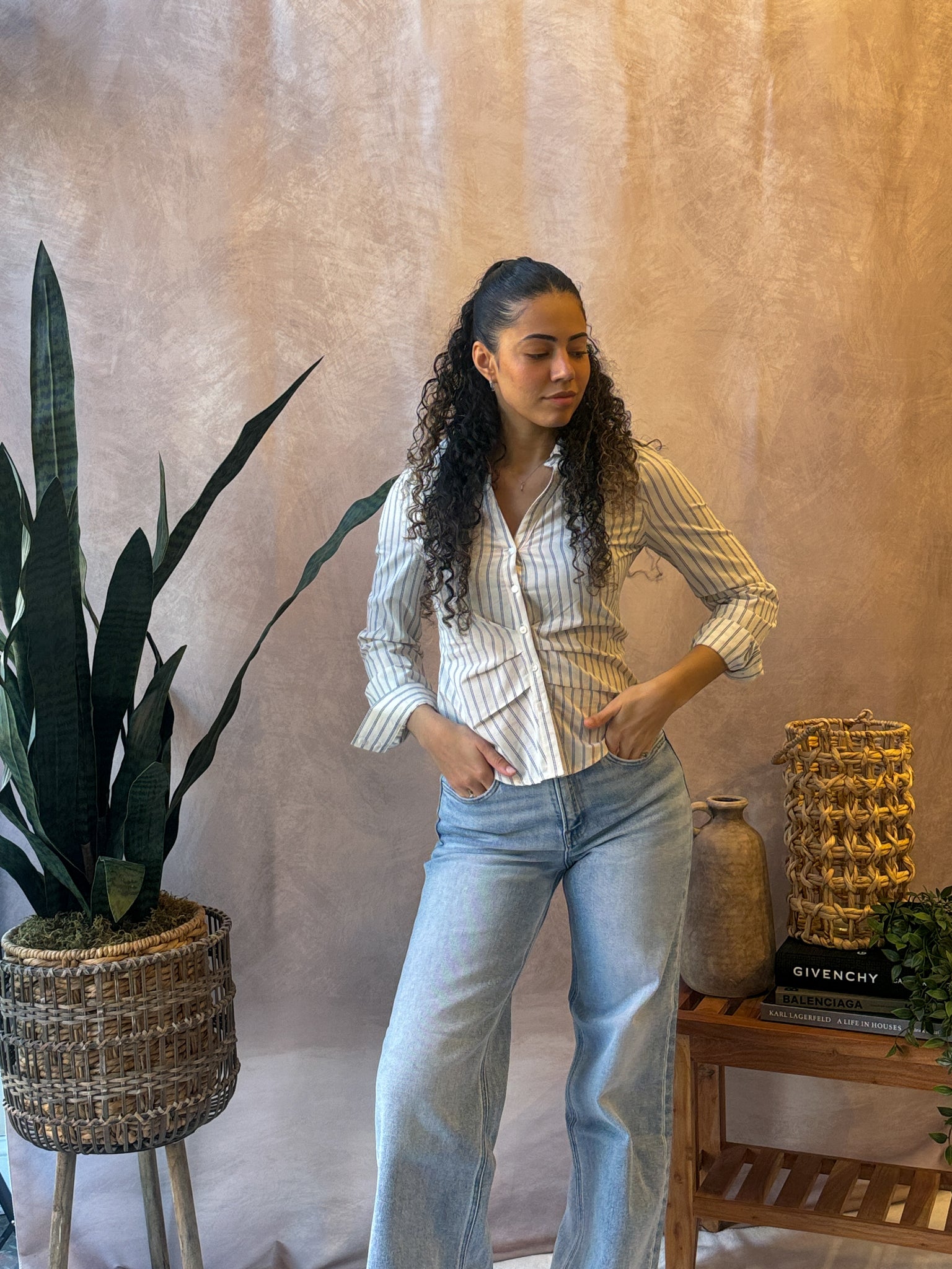 Striped Fitted Shirt features a tailored silhouette with a contoured seam detailing for a slim fit and a classic pointed collar with vertical multicolor pinstripes throughout.
