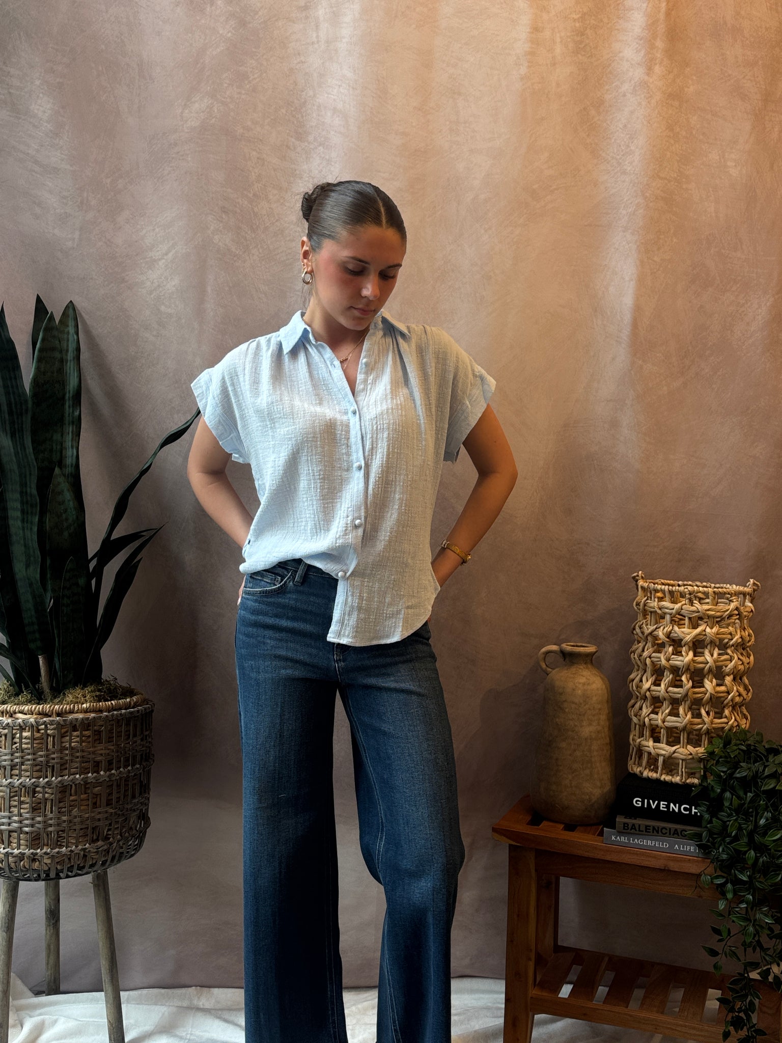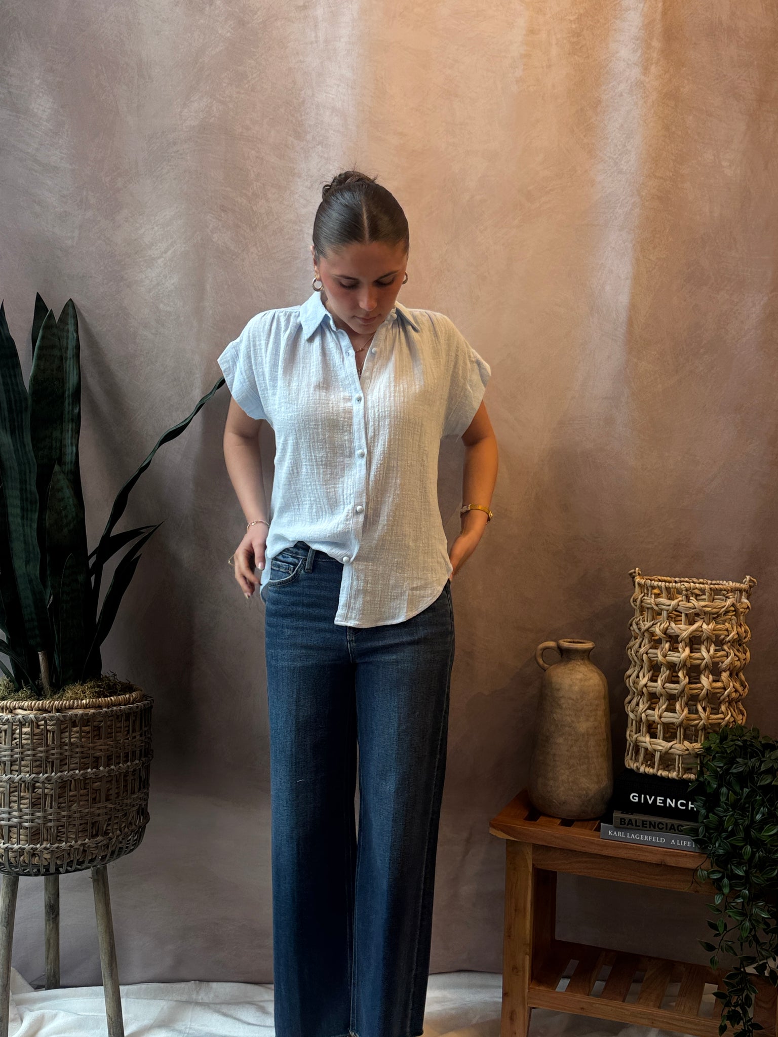 Our Hazel Short Sleeve Button-Front Blouse features a button front design with a relaxed collar, and a lightweight woven fabric with a subtle high-low hem and back yoke pleat for a breathable silhouette.