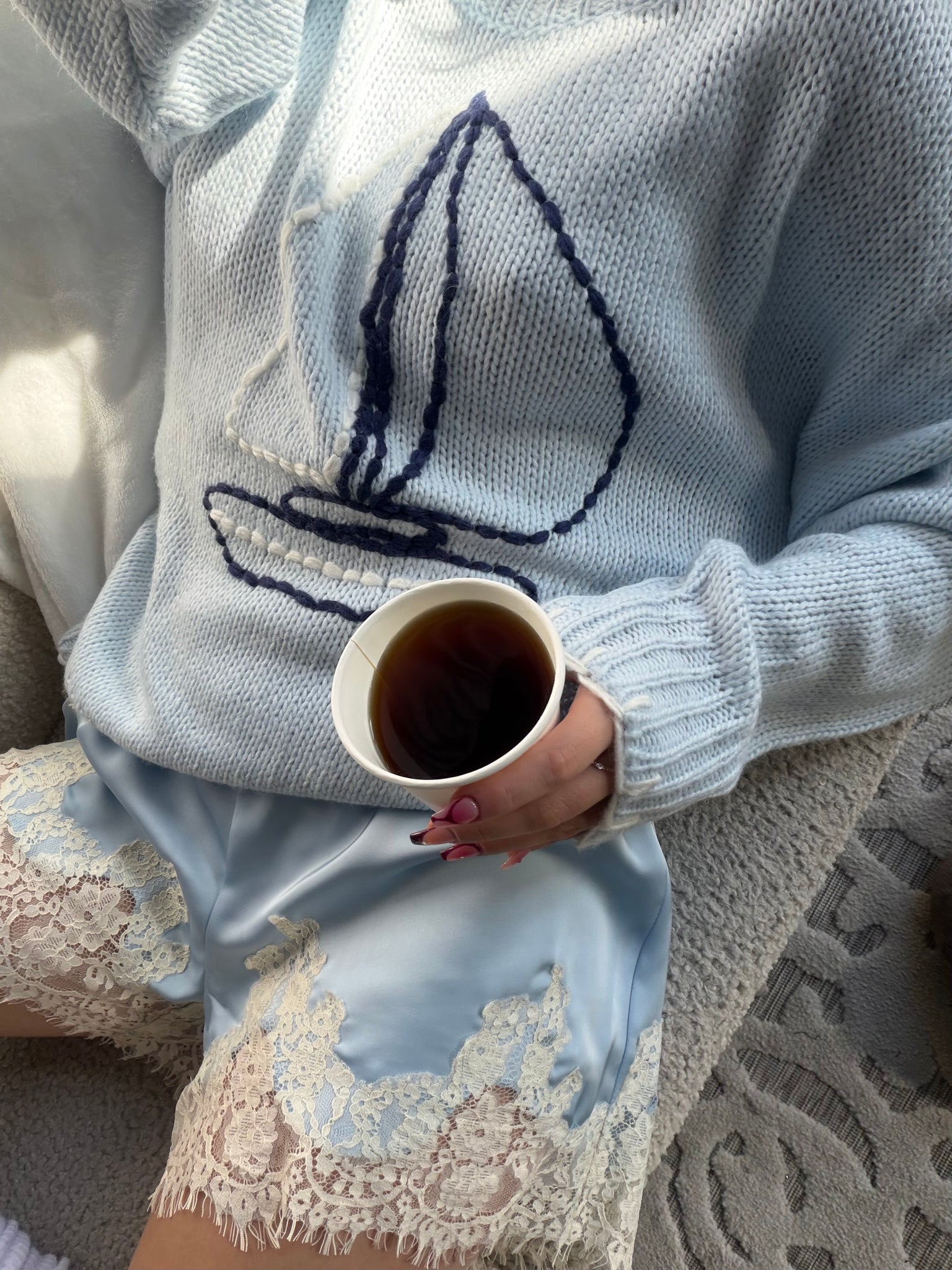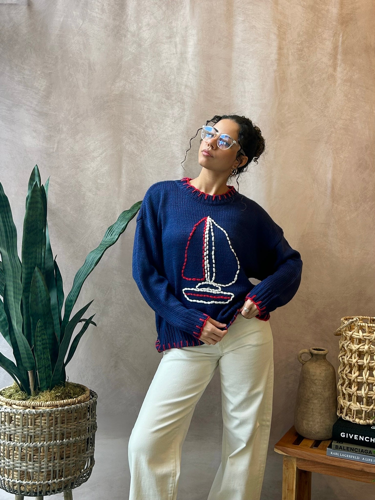 Slightly oversized sweater with blanket hem stitching and stitched sailboat graphic