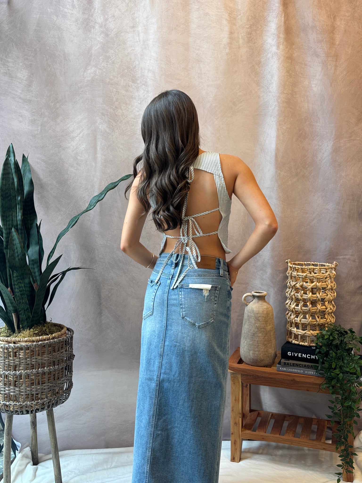 high neck top with open back featuring tie detailing and pinstripe pattern