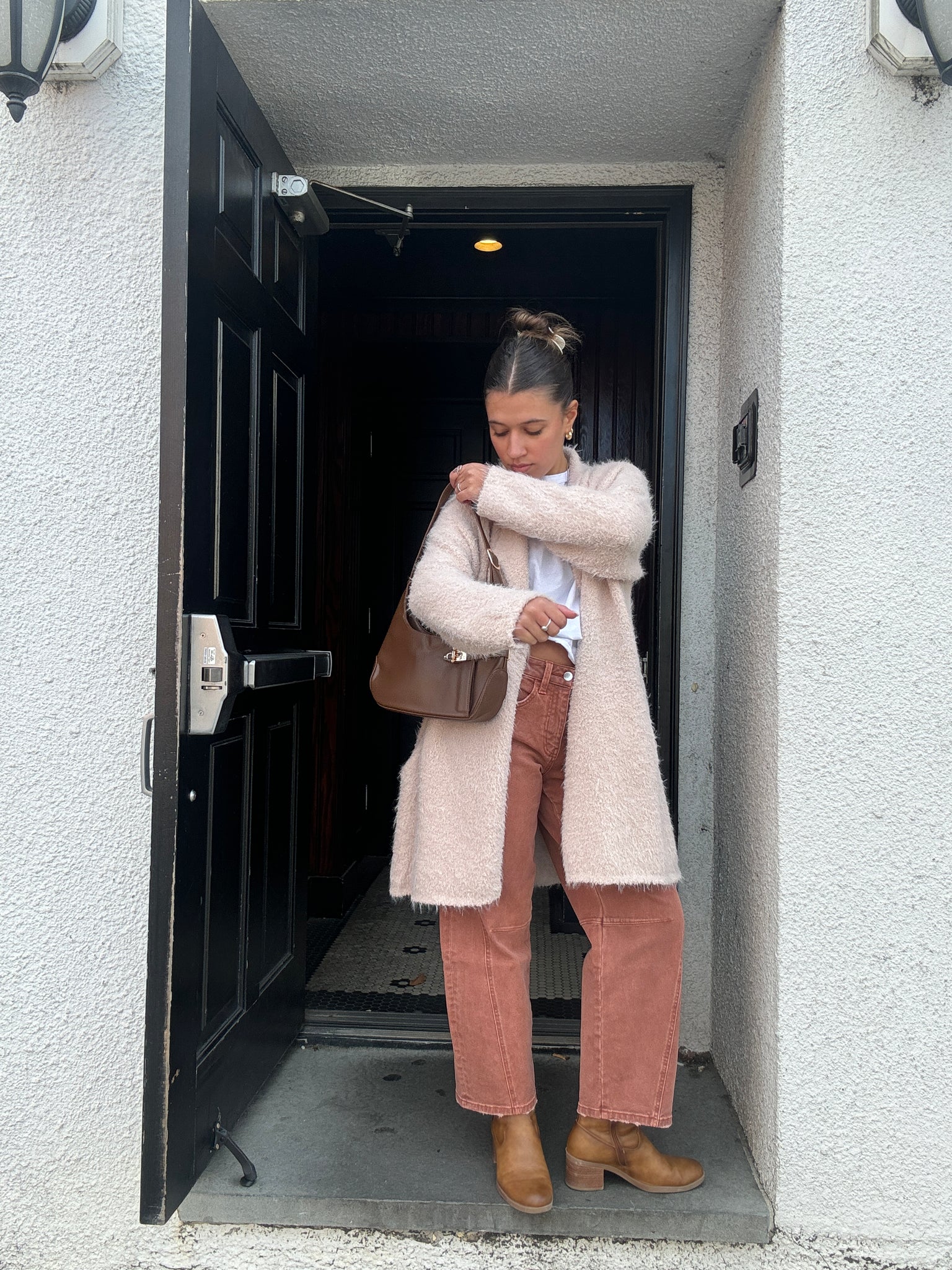 Fuzzy knit sweater cardigan features a draped collar, dolman long sleeves, side pockets, and an effortless oversized fit, extra soft and luxurious feel.