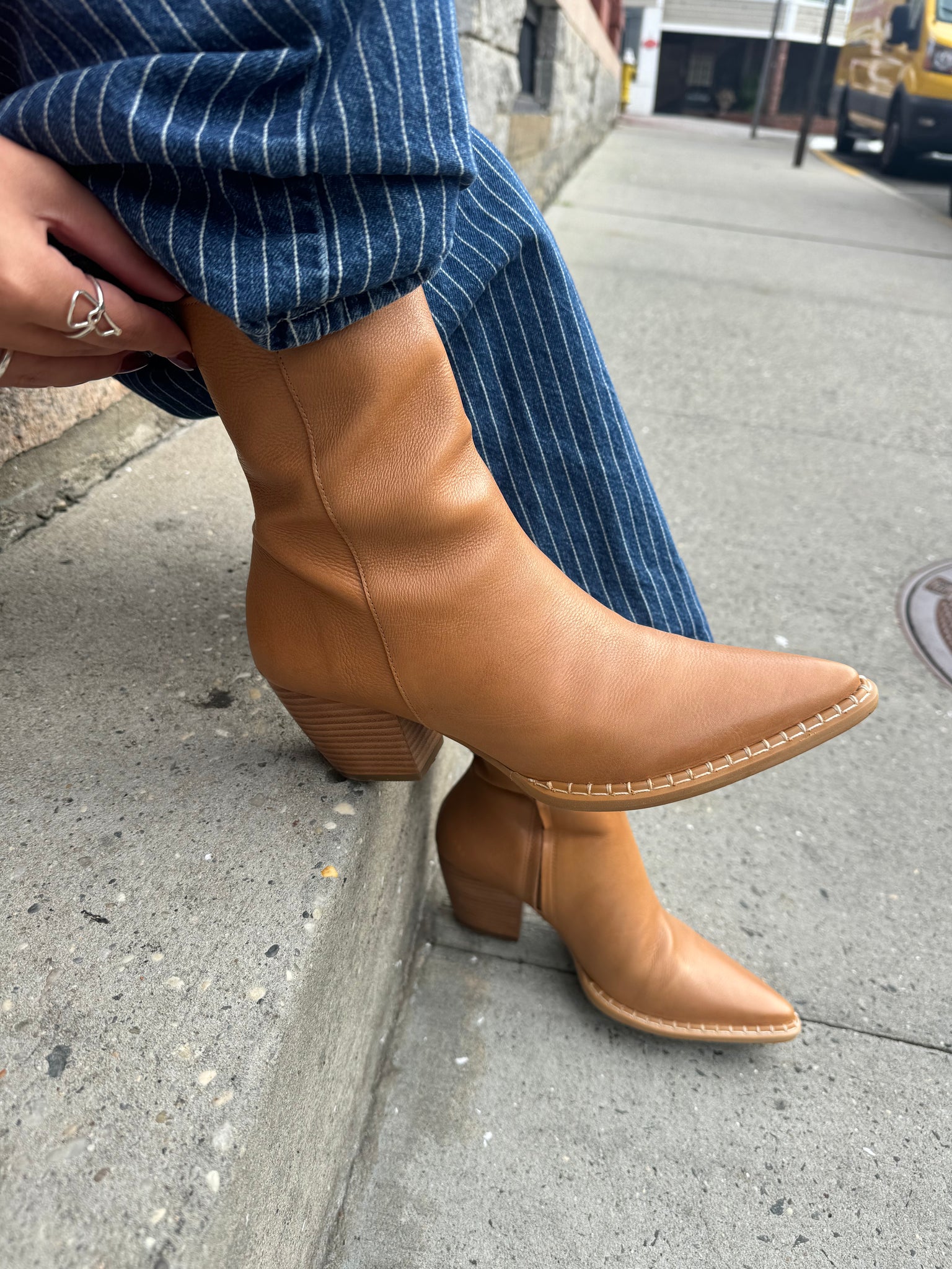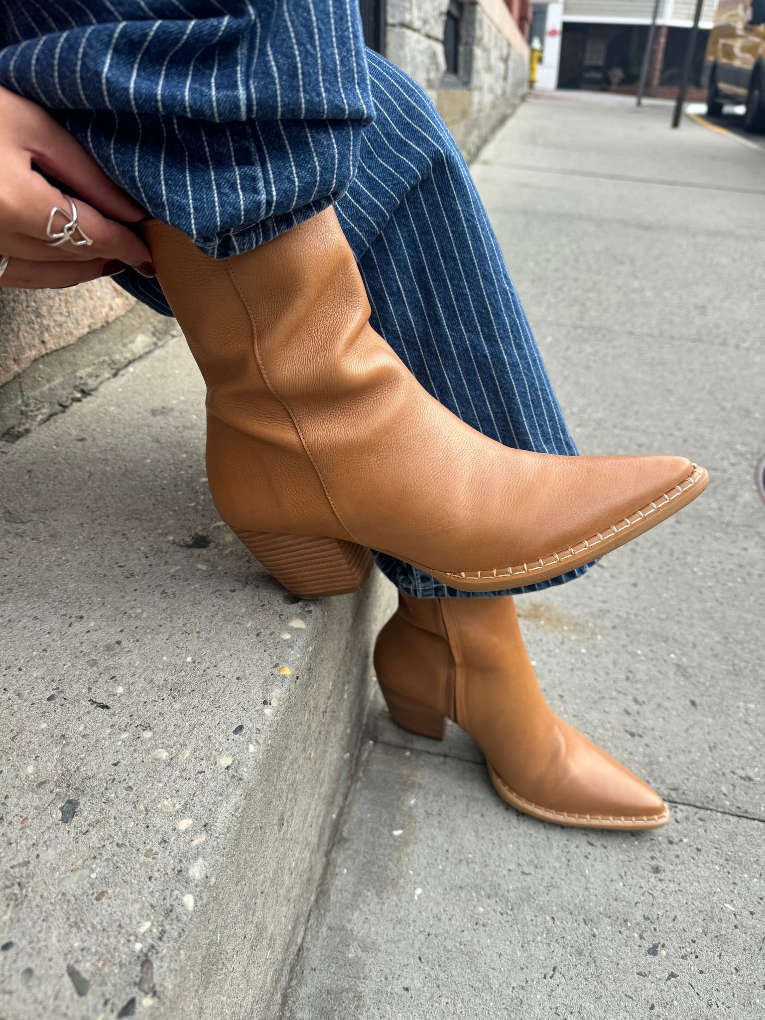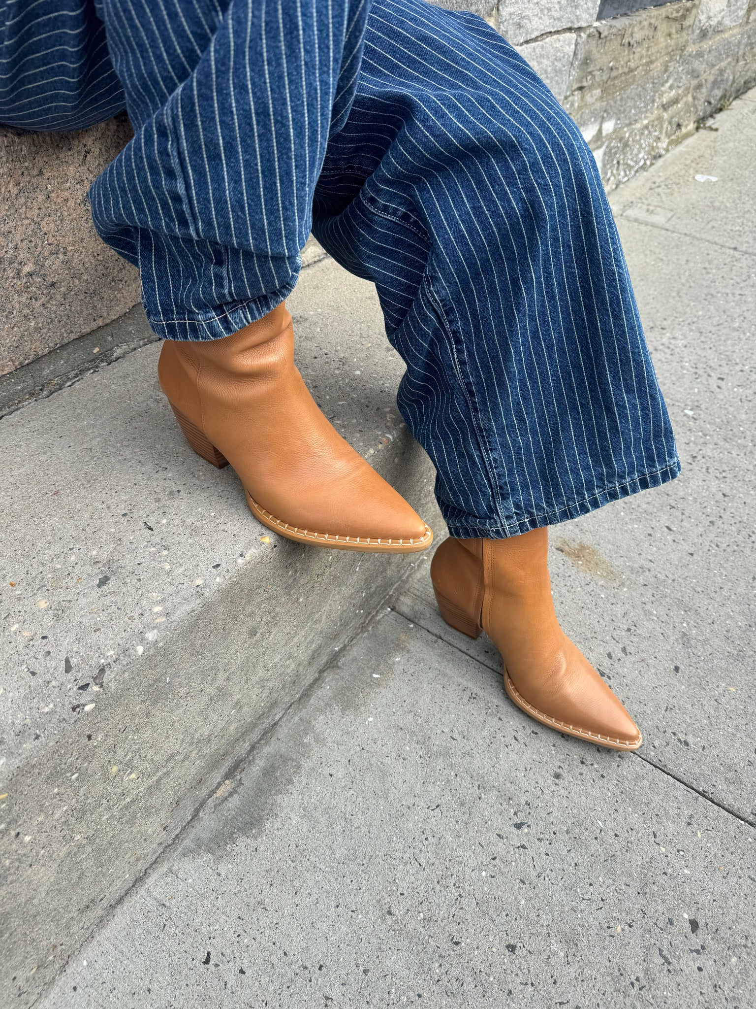 A versatile ankle boot featuring a sleek pointed toe, stacked block heel, and minimalist silhouette.