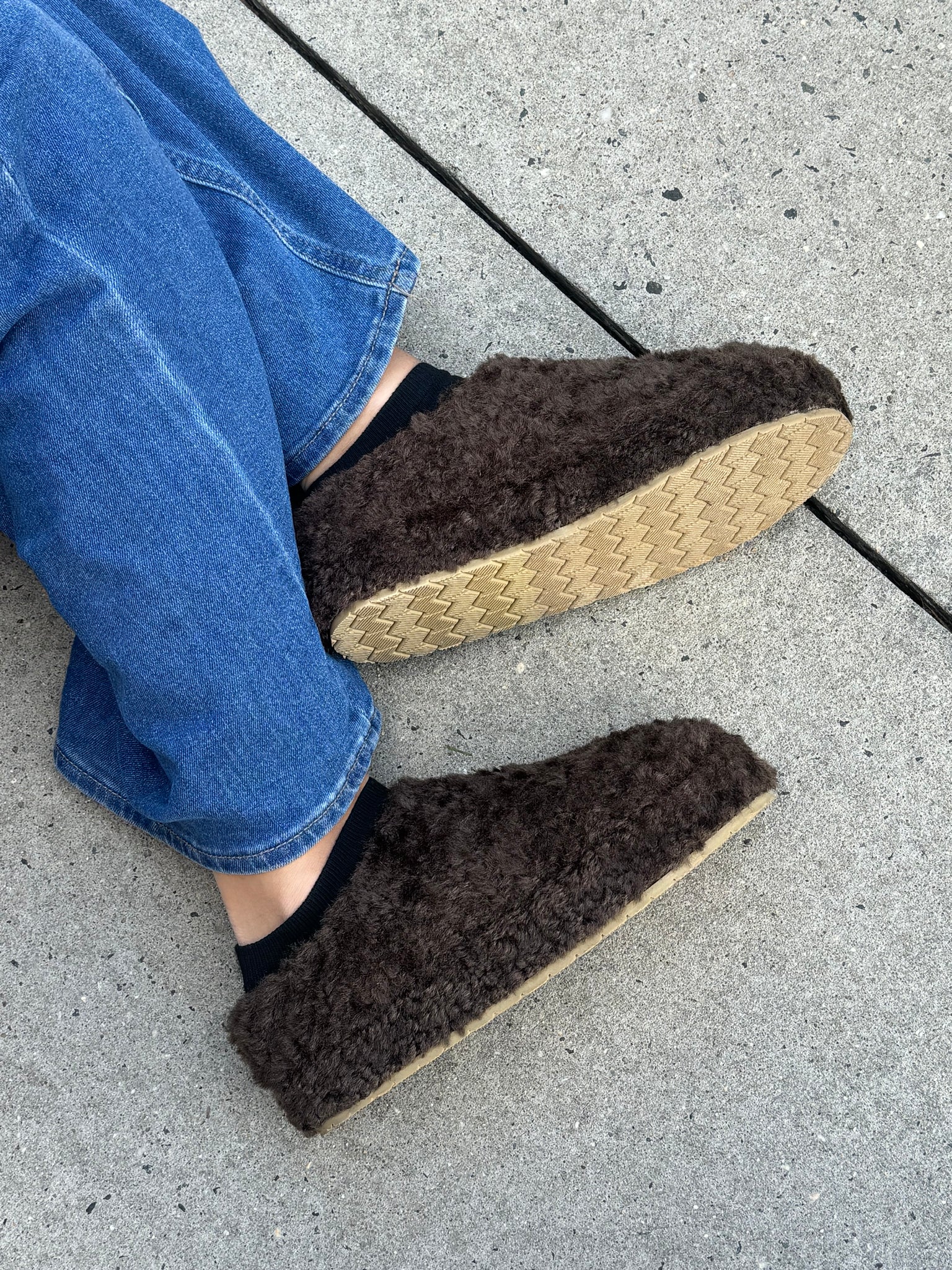 Vegan faux shearling slip-on mule with rounded toe and soft textured finish. slide on cushion comfy indoor+outdoor shoe