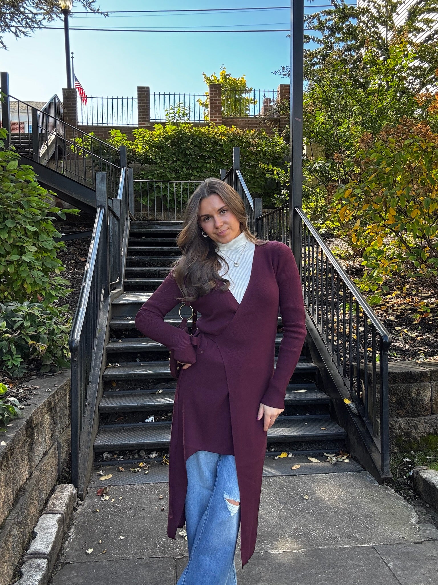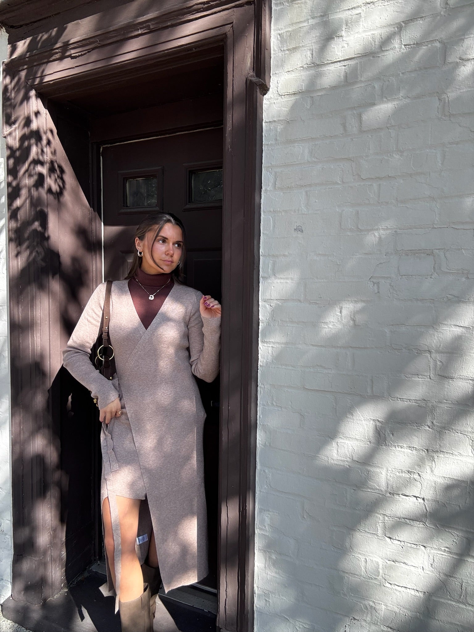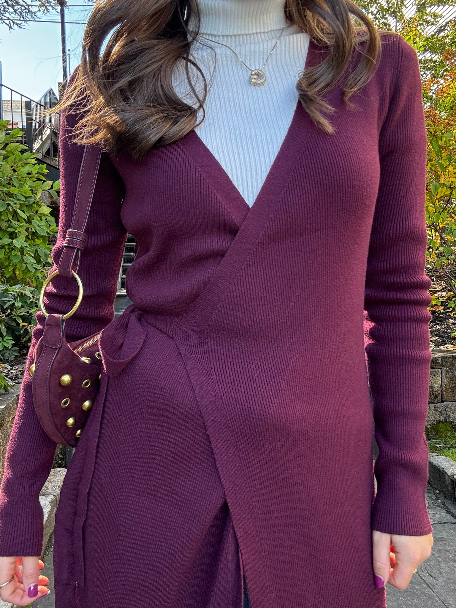 This sophisticated and cozy long-sleeve sweater dress is crafted from a soft, ribbed knit. It features a flattering wrap silhouette that creates a classic V-neckline and is cinched at the waist with a matching self-tie belt, defining the figure beautifully. The dress falls to an elegant midi length, while a high side slit introduces a touch of modern allure and ensures comfortable movement, making it a perfect blend of comfort and chic style.