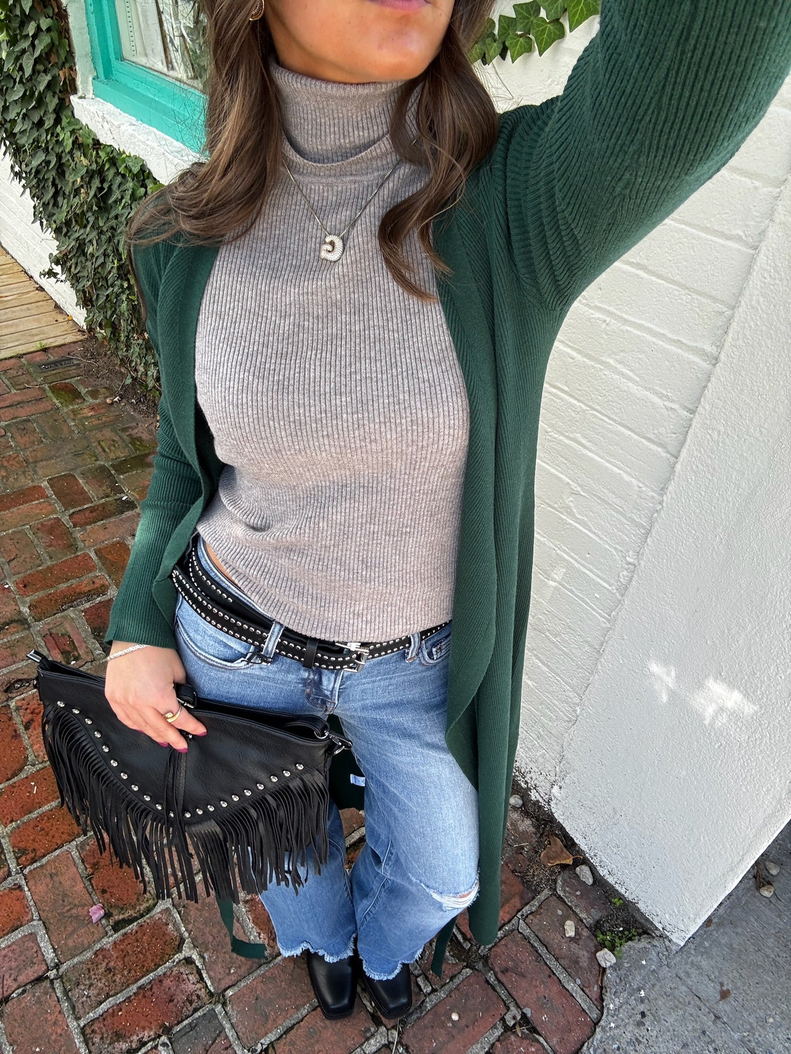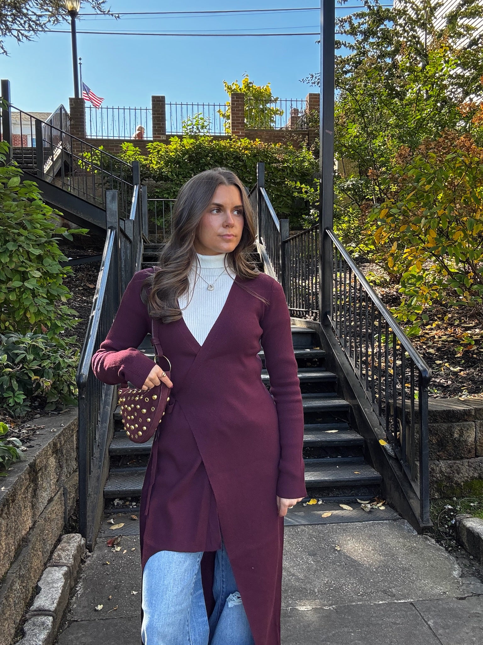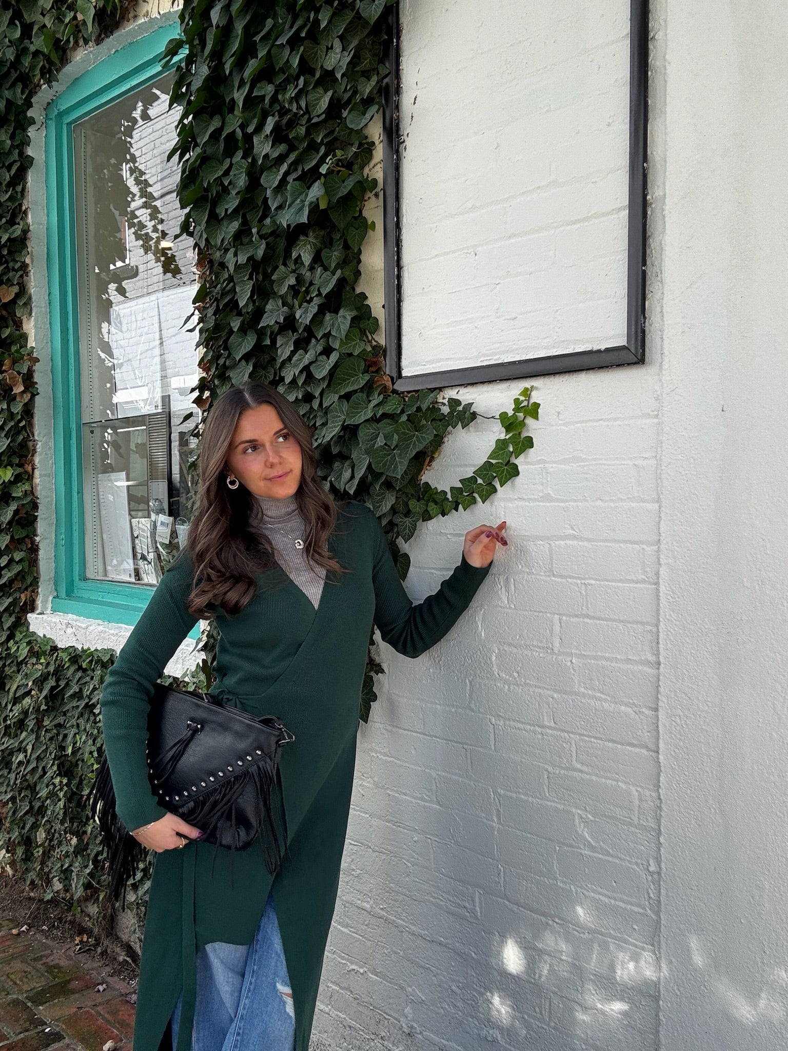 This sophisticated and cozy long-sleeve sweater dress is crafted from a soft, ribbed knit. It features a flattering wrap silhouette that creates a classic V-neckline and is cinched at the waist with a matching self-tie belt, defining the figure beautifully. The dress falls to an elegant midi length, while a high side slit introduces a touch of modern allure and ensures comfortable movement, making it a perfect blend of comfort and chic style.
