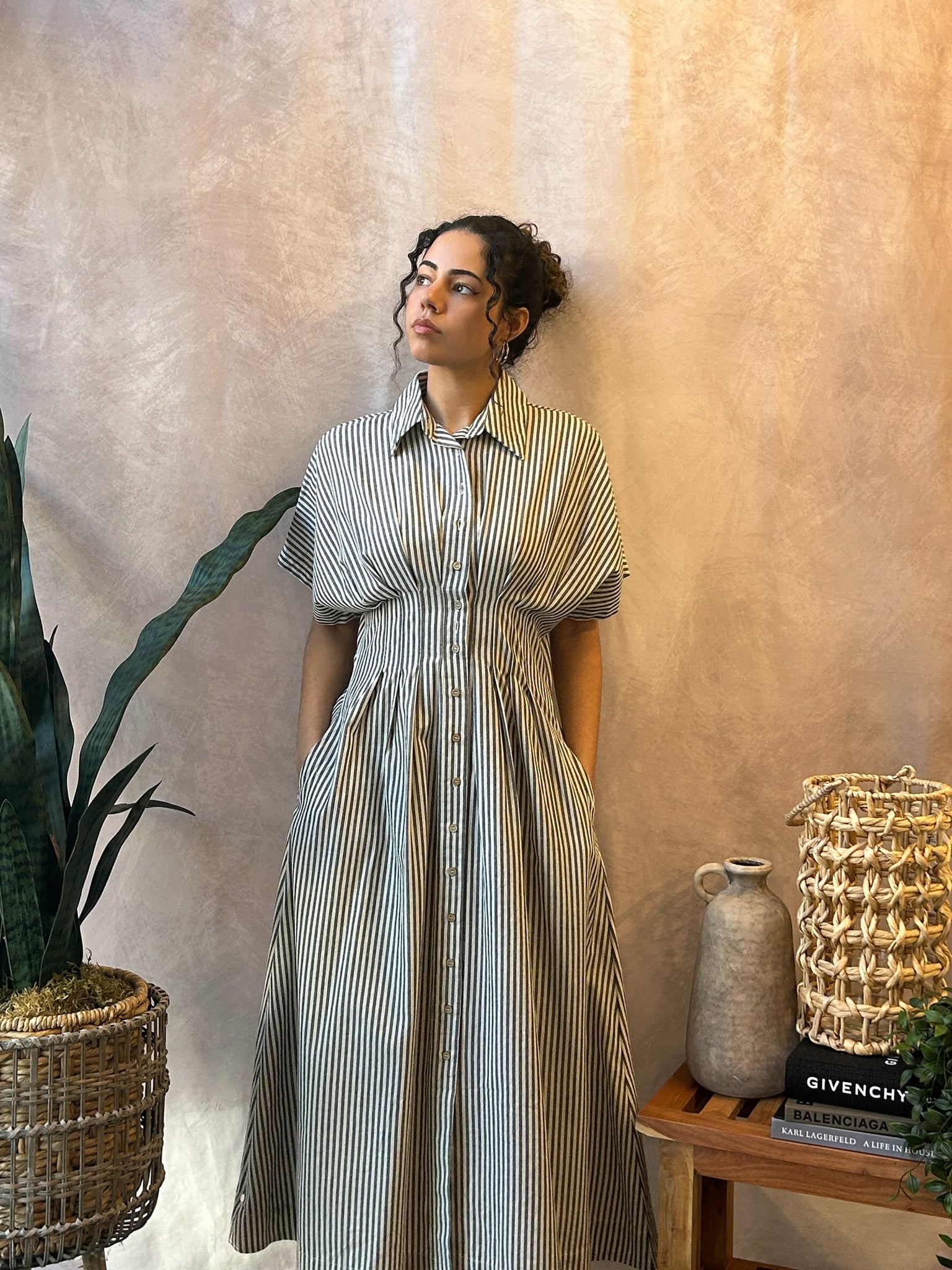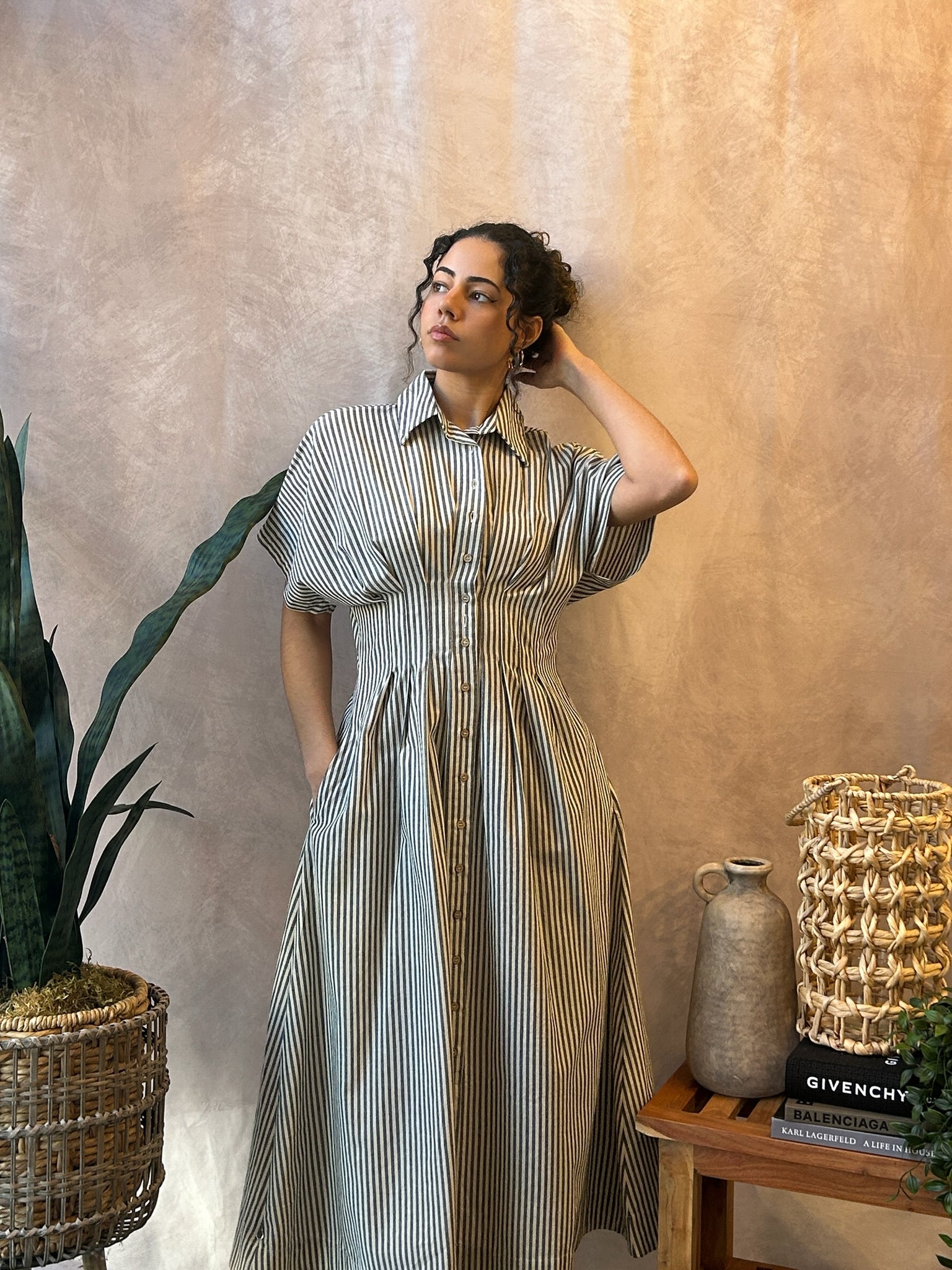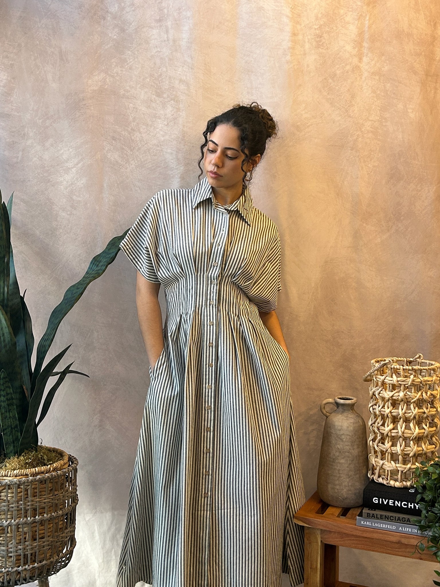 Button up t-shirt dress with cinched waist and pinstripe pattern