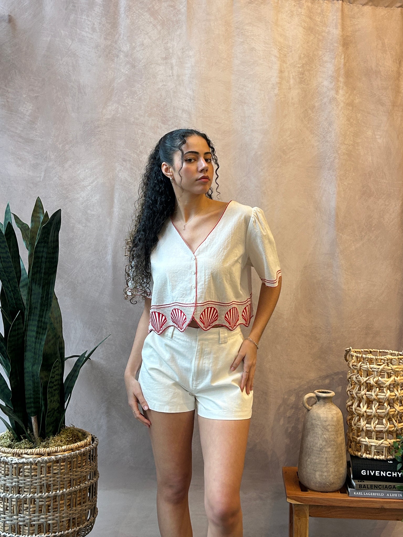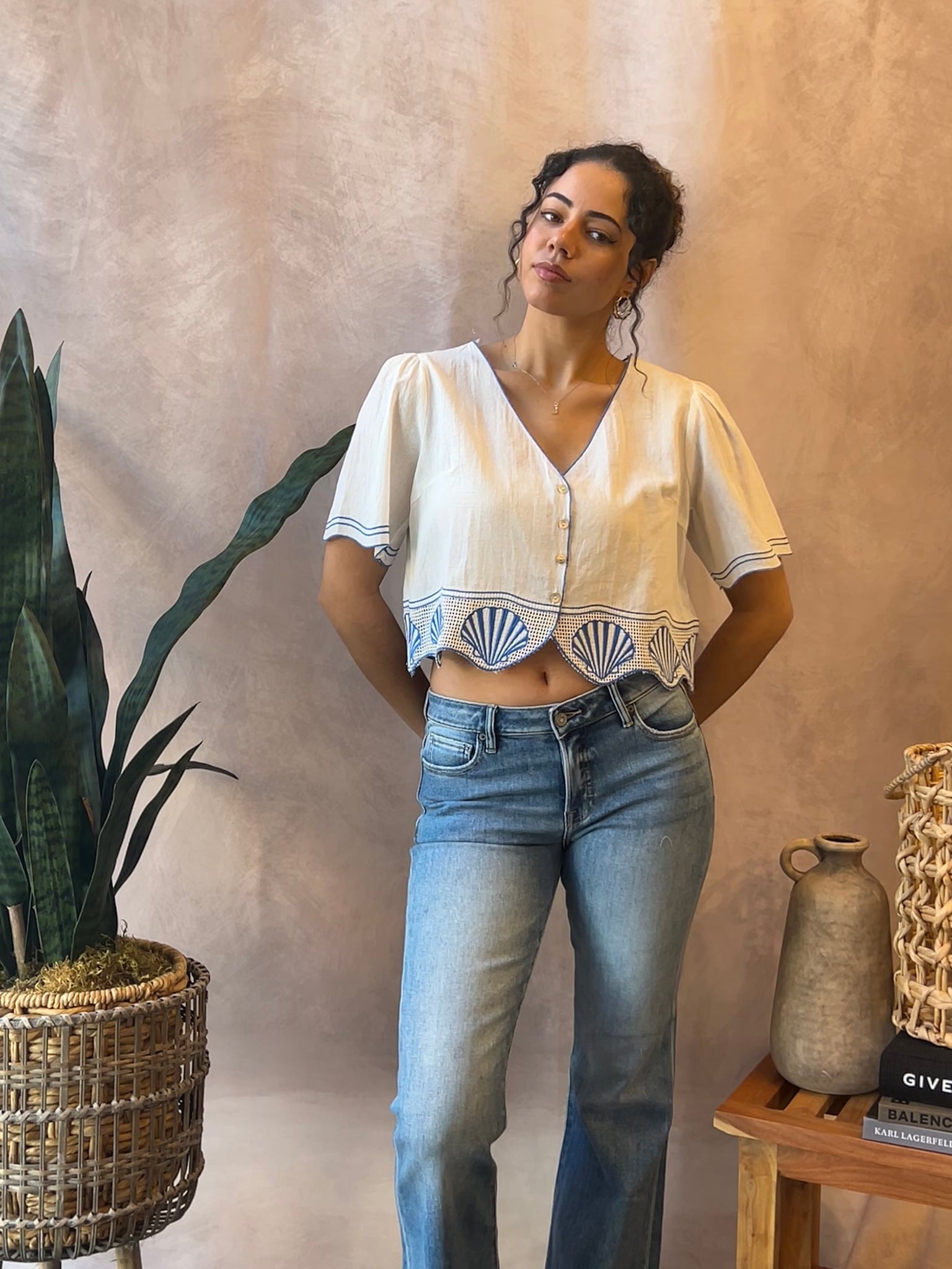 Tee shirt blouse with scalloped edge and seashell graphic
