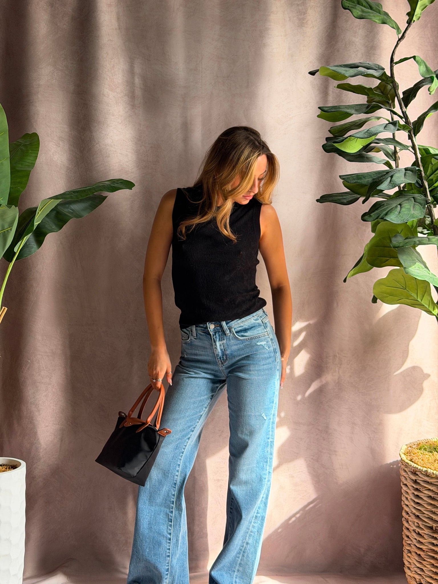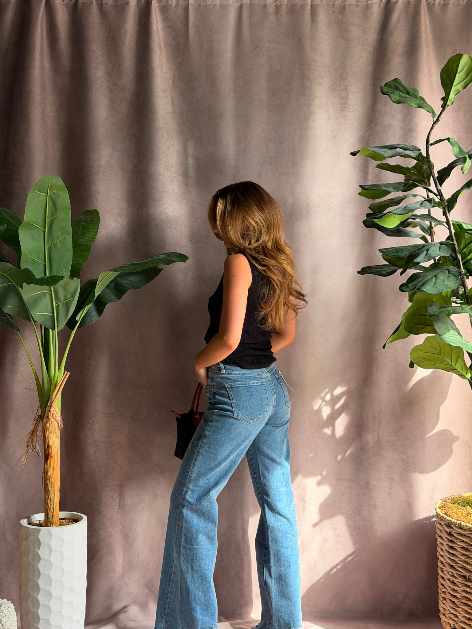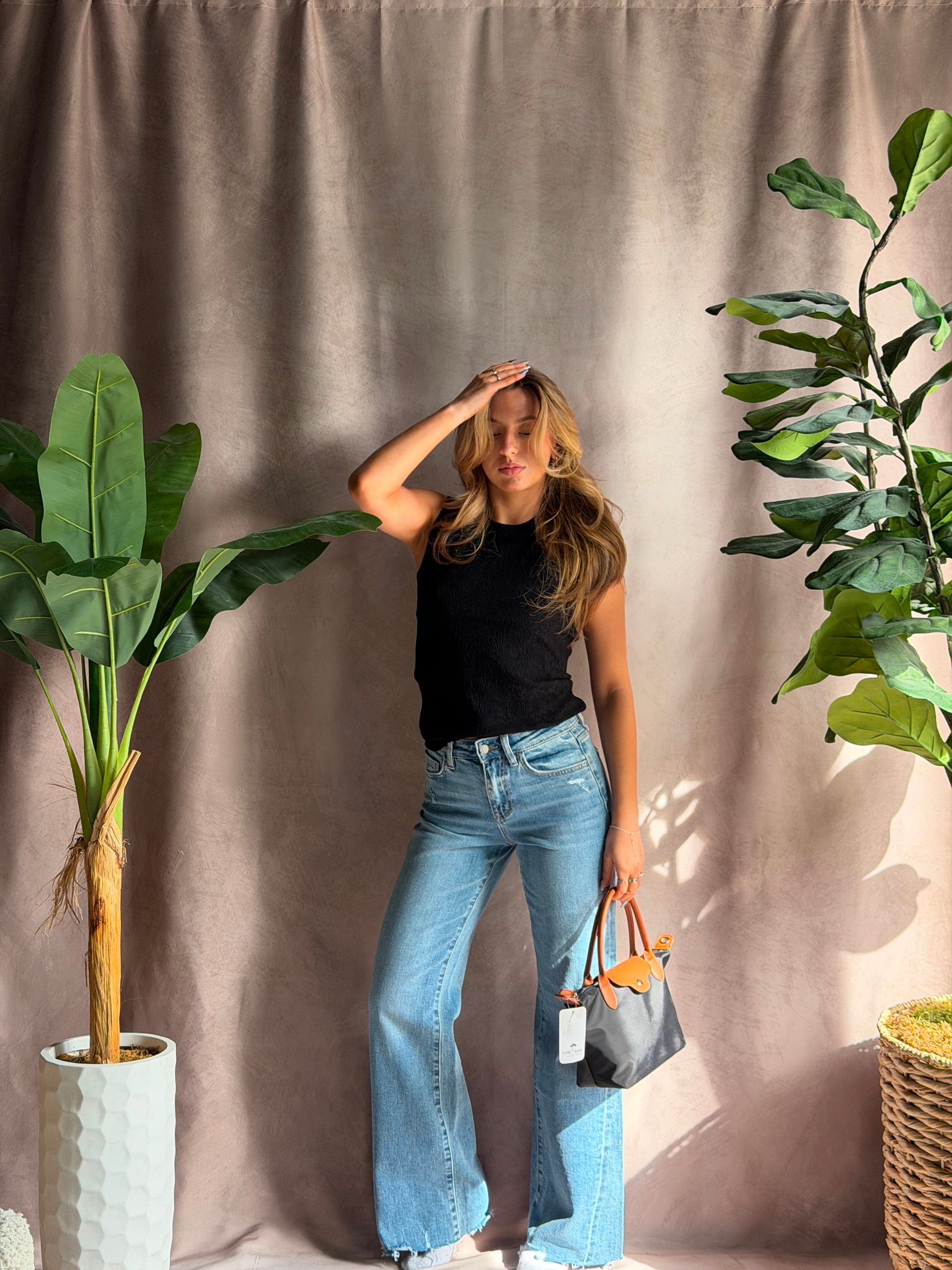 HIGH RISE SLANT SIDE SEAM VINTAGE FLARE JEANS COMFORT STRETCH DENIM, HIGH RISE WAIST, 5 POCKETS, LIGHTLY DISTRESSED DETAIL, SLANT SIDE SEAM DETAIL, DISTRESSED RAW HEM, FULL LENGTH, MEDIUM WASH, VINTAGE FLARE JEANS