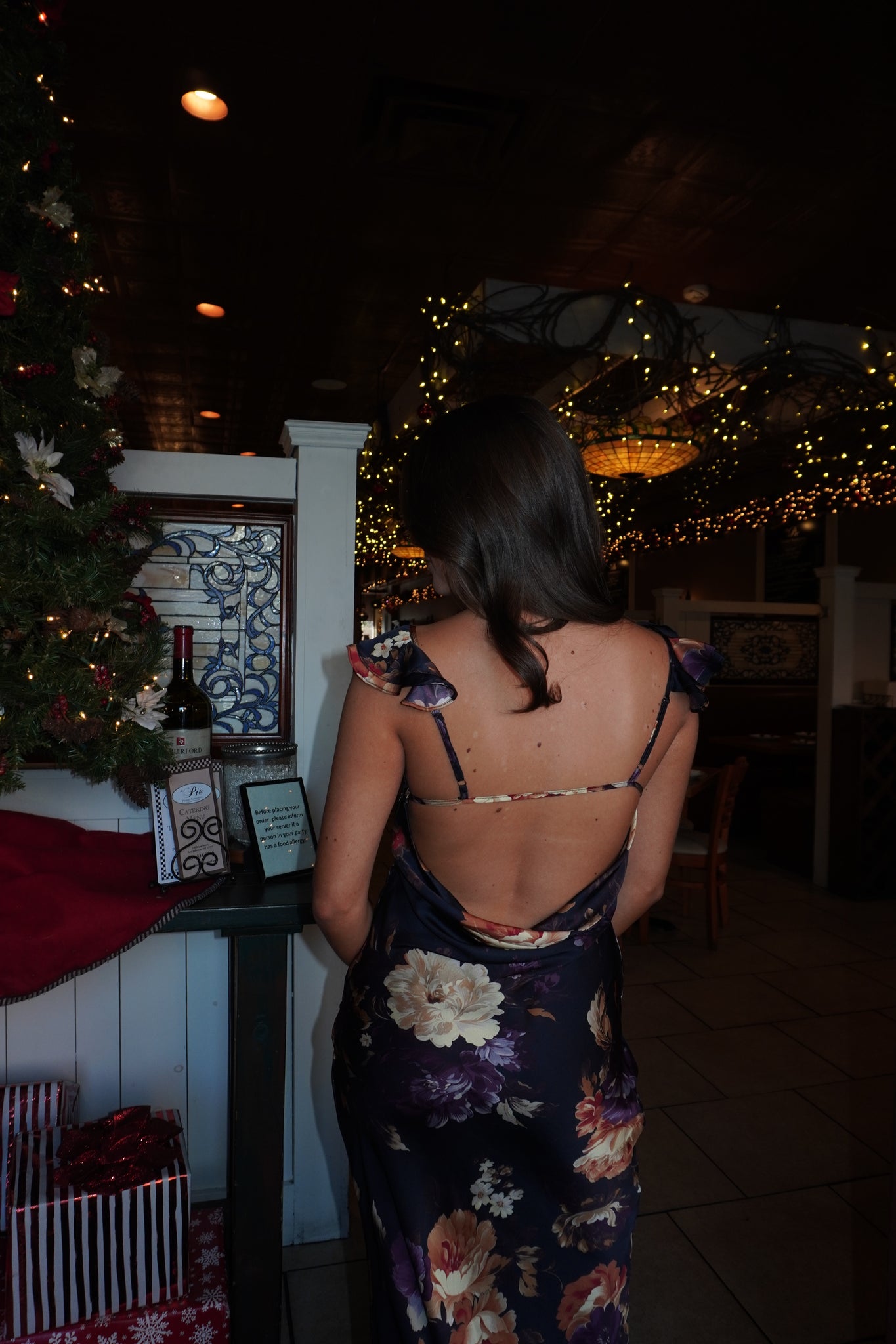 Floral print satin jacquard maxi dress with flutter sleeves. V neckline Chevron underbust seam Subtle ruched cups Ruffled shoulders with adjustable straps Slinder on the back horizontal stripe Open back with a cowl low back Hidden side zipper closure Lined