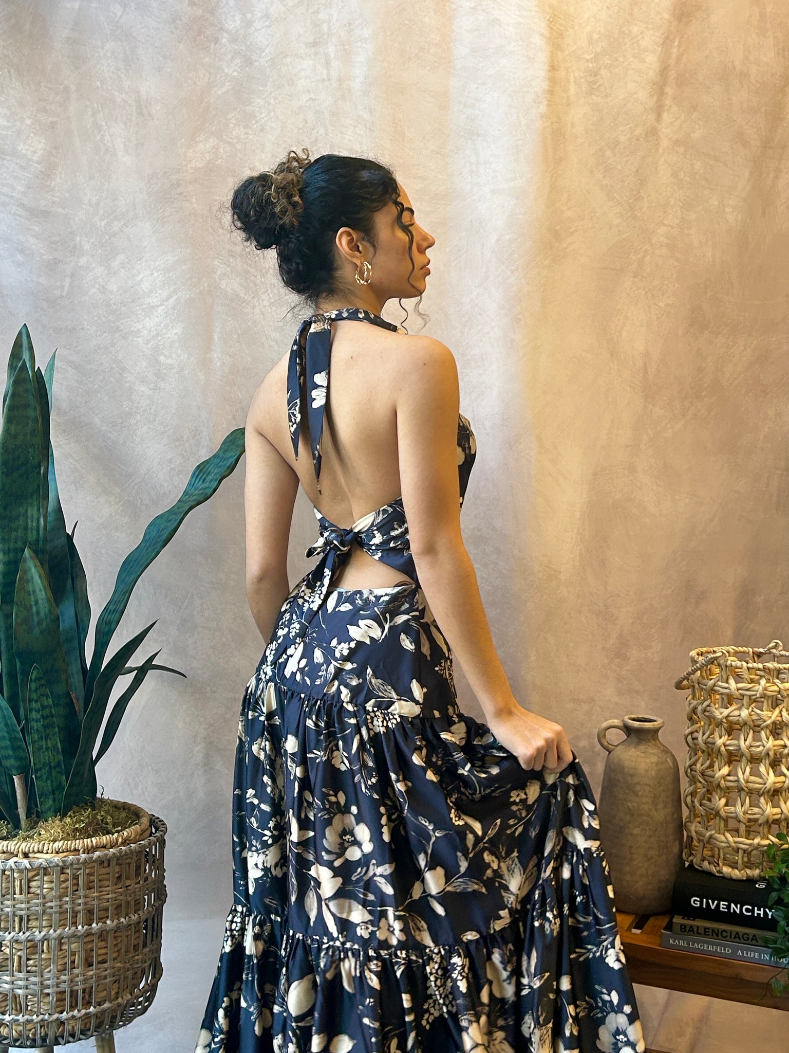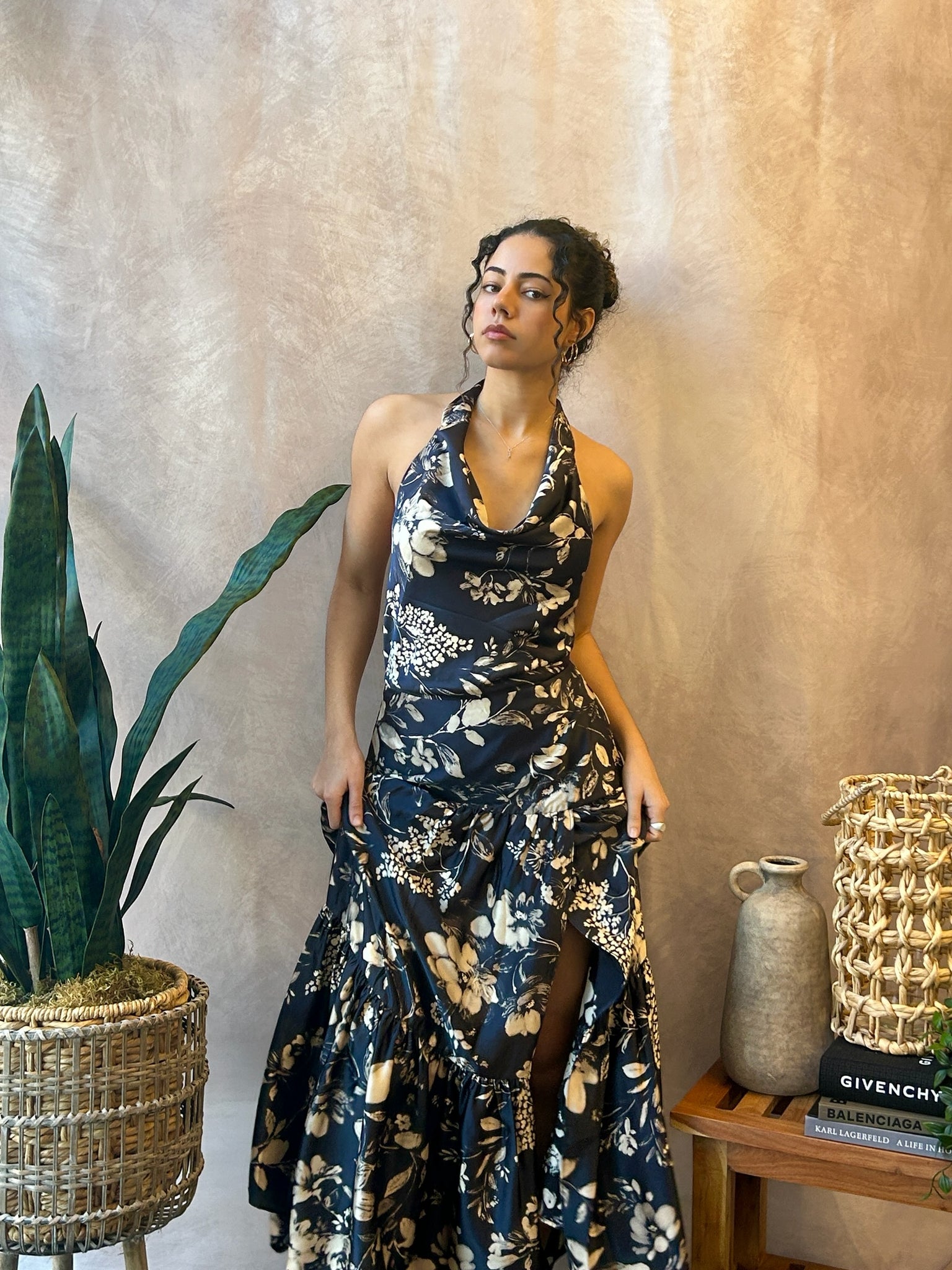 Cowl neck halter dress with drop waist and floral pattern