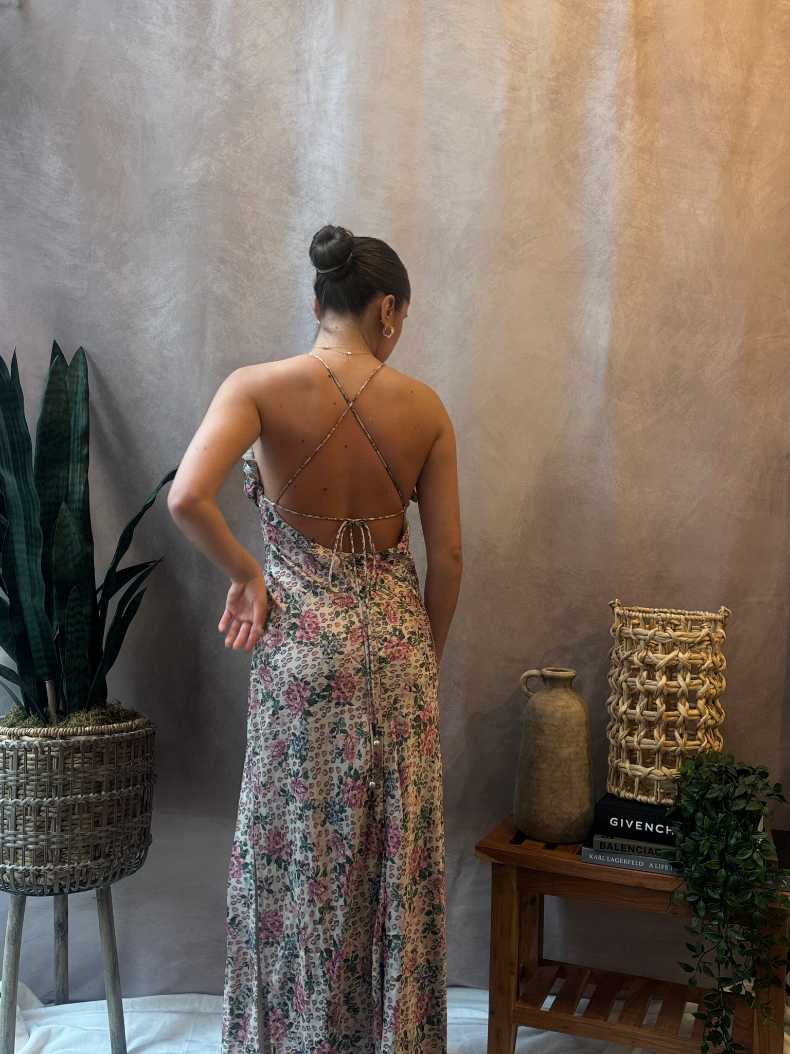 Floral and animal print satin maxi dress with a ruffled triangle bust