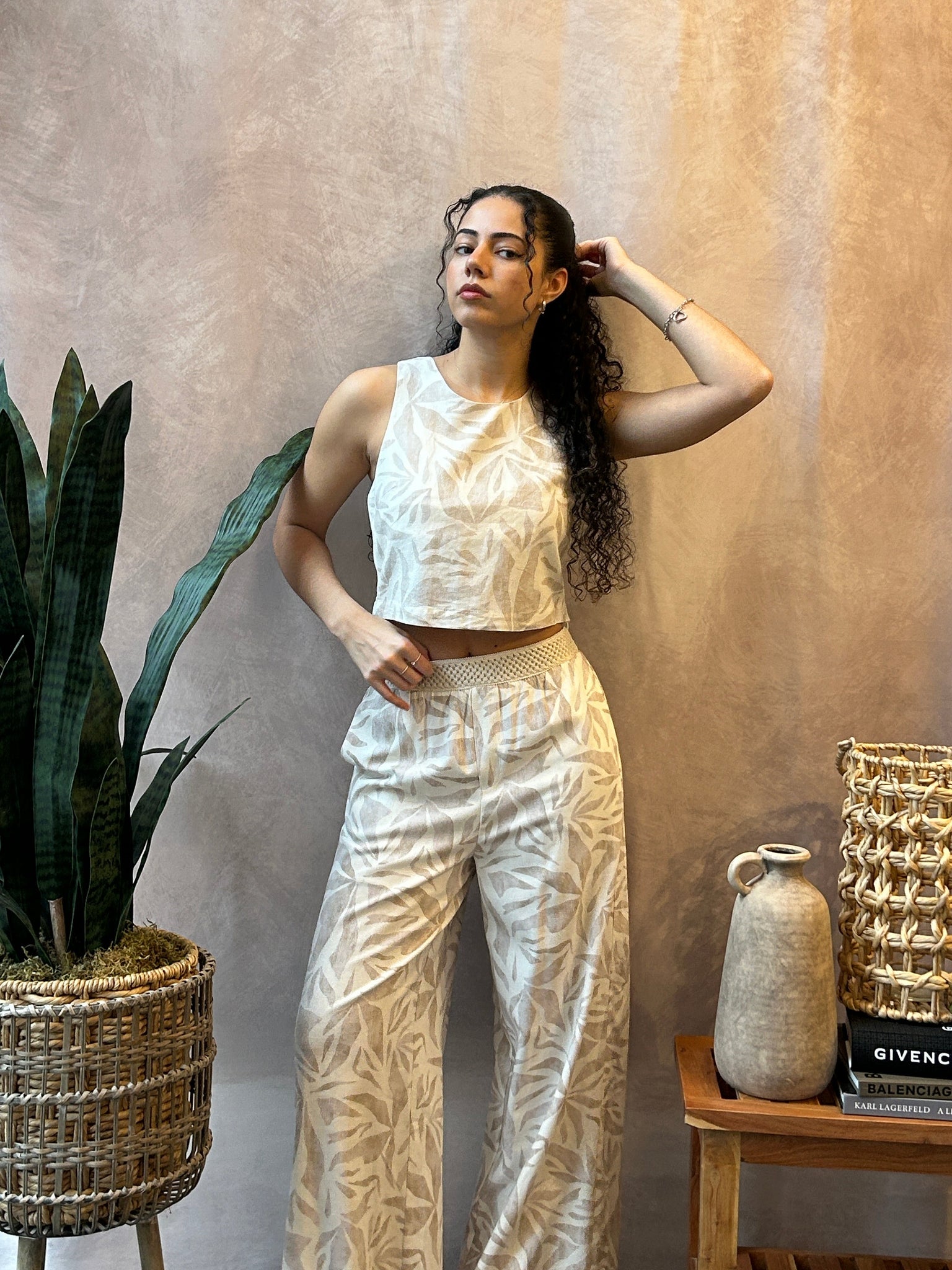 Tropical leaf print breezy rayon linen pull on pants featuring a decorative knitted elastic waistband