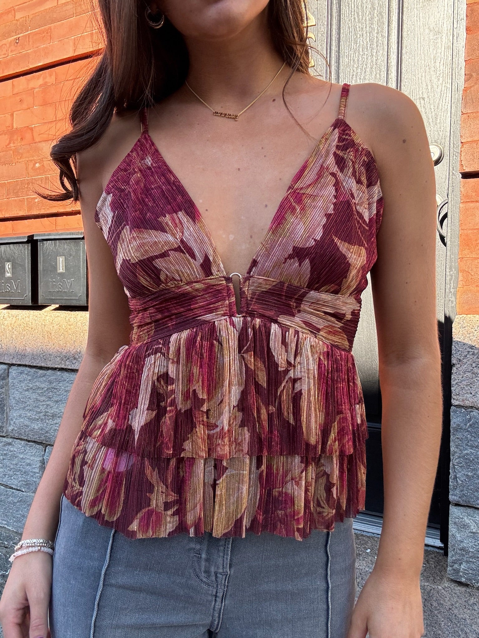 Shimmering lurex floral printed deep v-neck sleeveless top.Trim detail at the front Pleated Ruffled at the hem Elastic band at back waist Shirring detail Lined