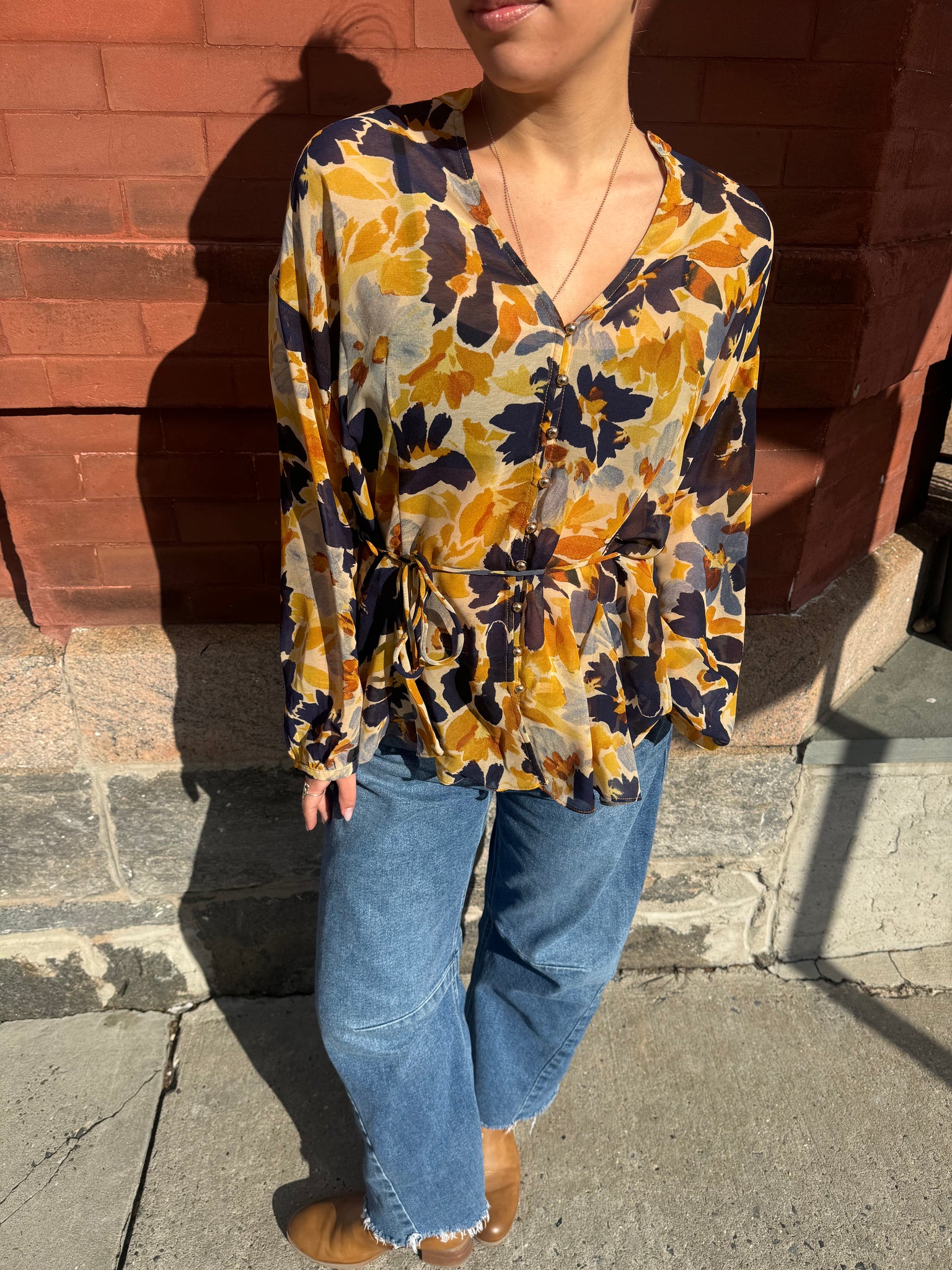 Floral print chiffon blouse with a sash tie. Model is 5'9" and wearing size Small.Mandarin neckline Button closures Spaghetti sash tie Flared hem Long sleeves with button closure Unlined.