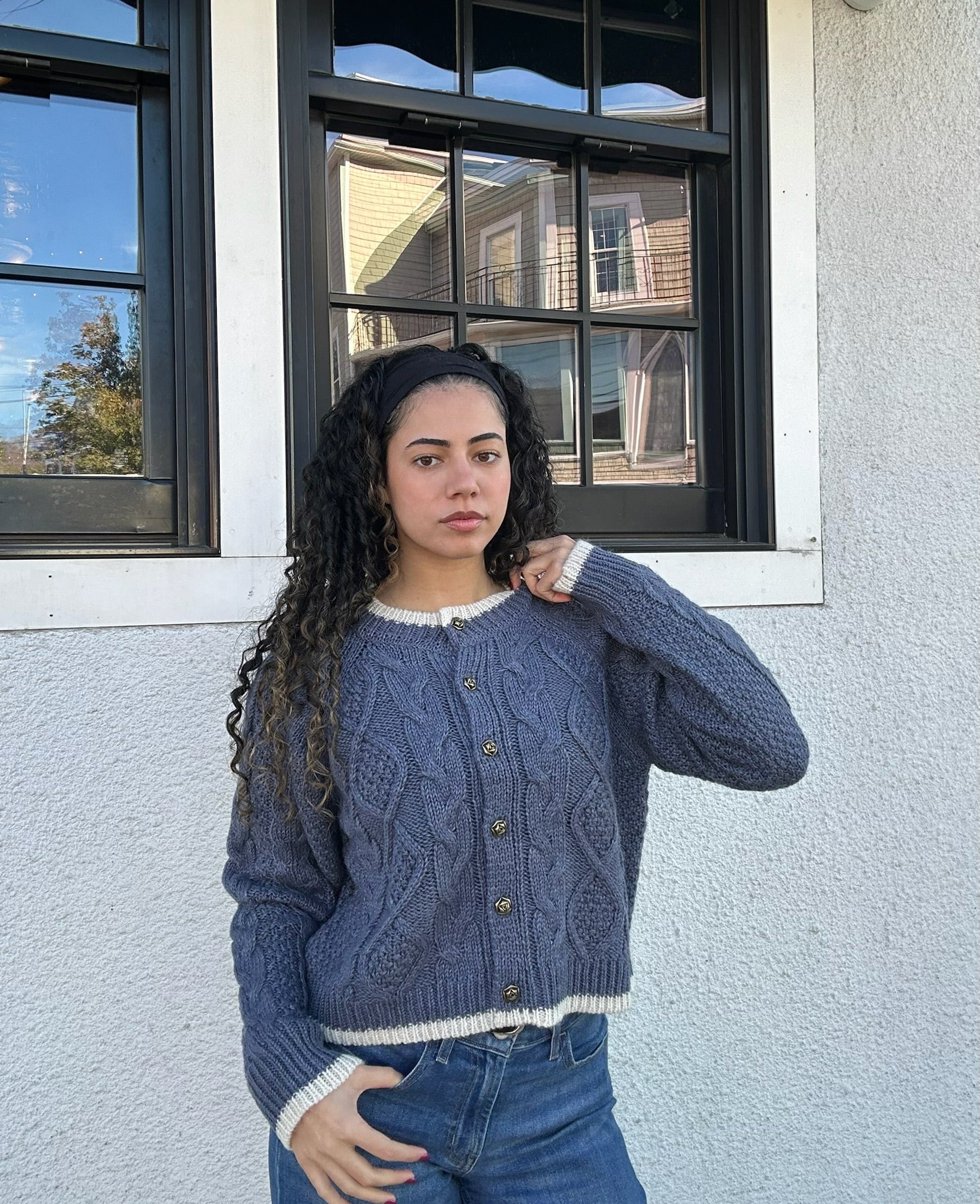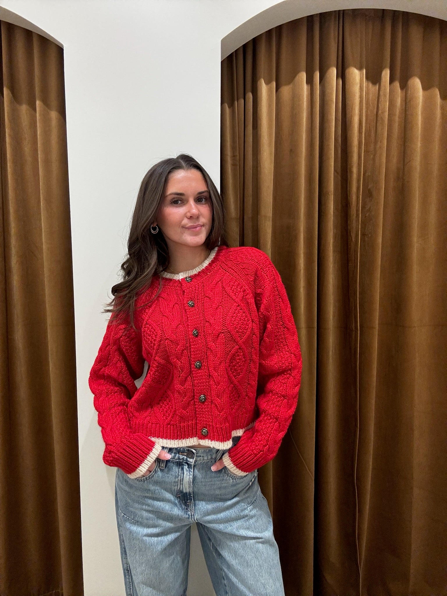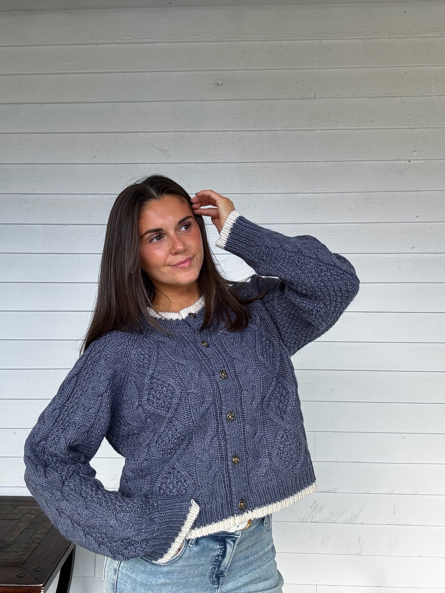 cozy cable knit cardigan with constratst trim button down front and a relaxed easy fit.