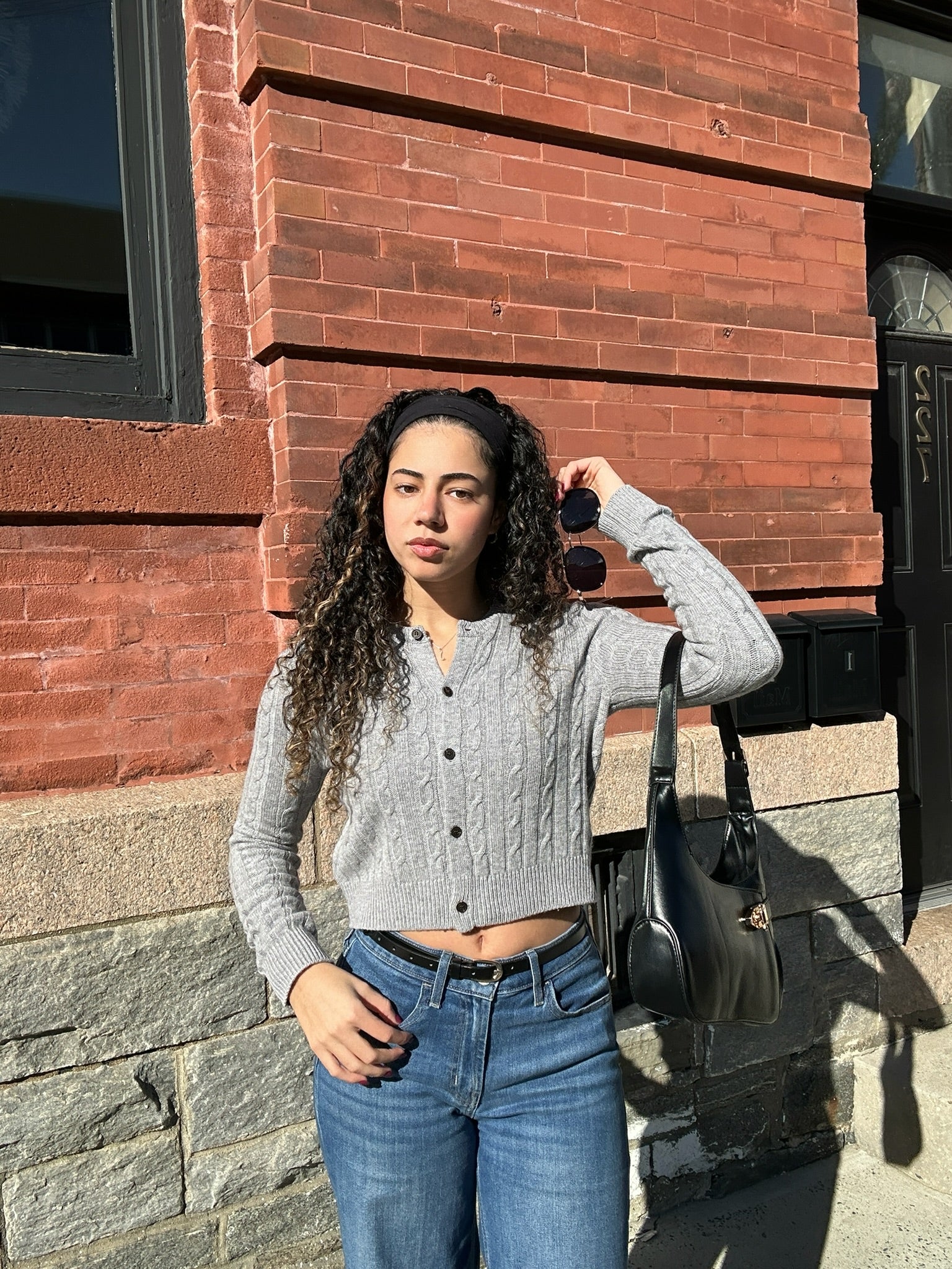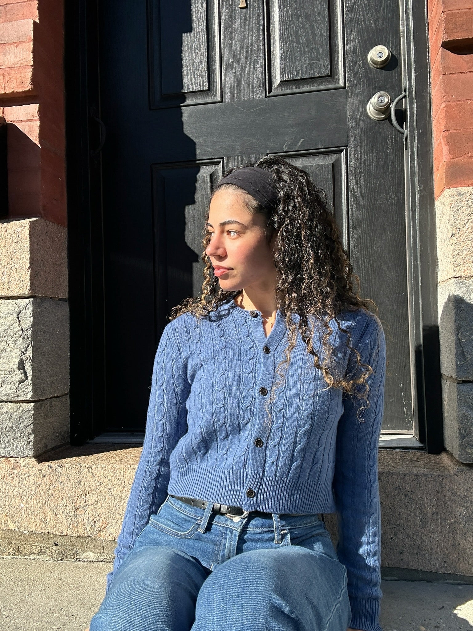 Knit cardigan features a cable knit touch with a wool mixed fabric for a cozy, warm feel and a button down.