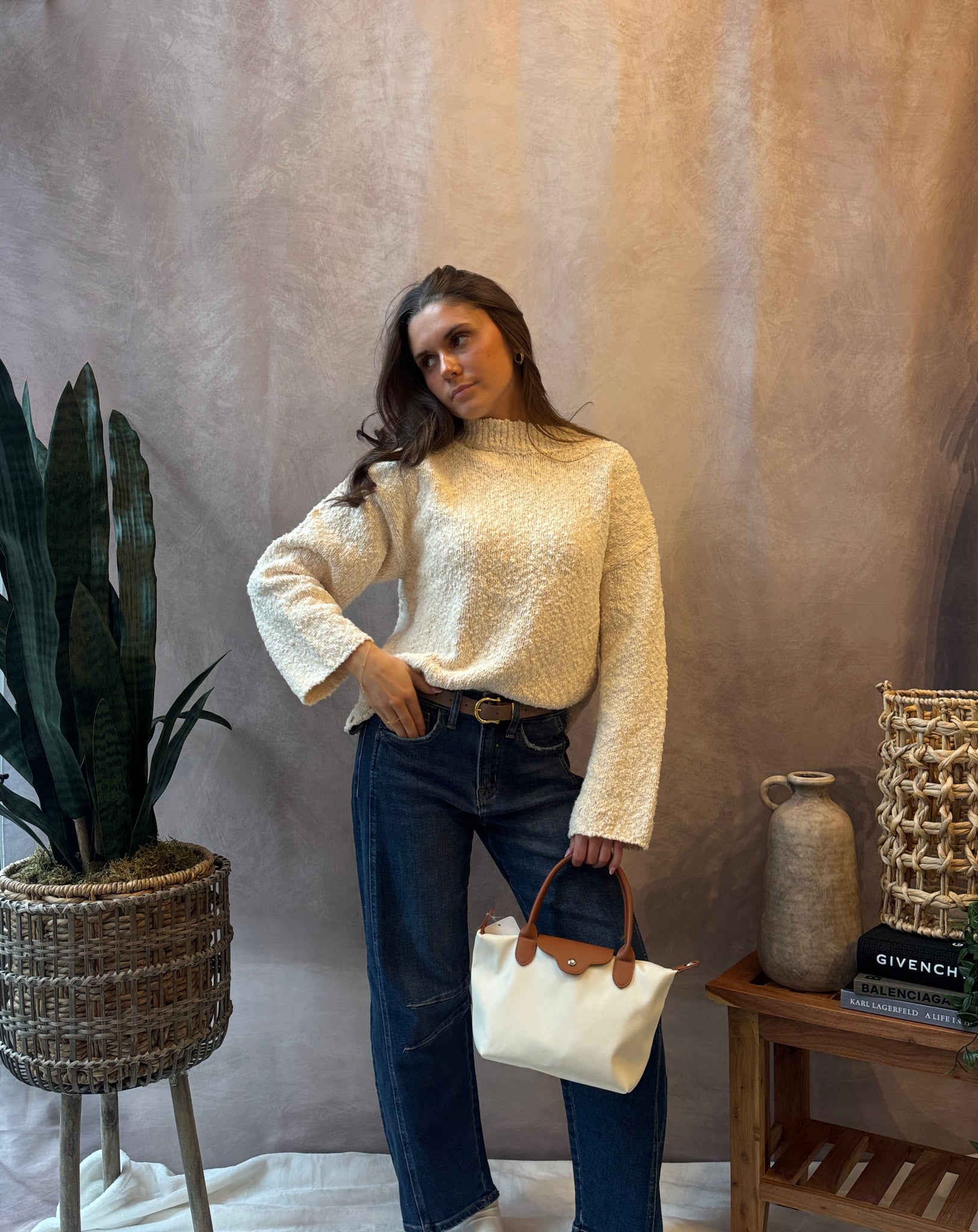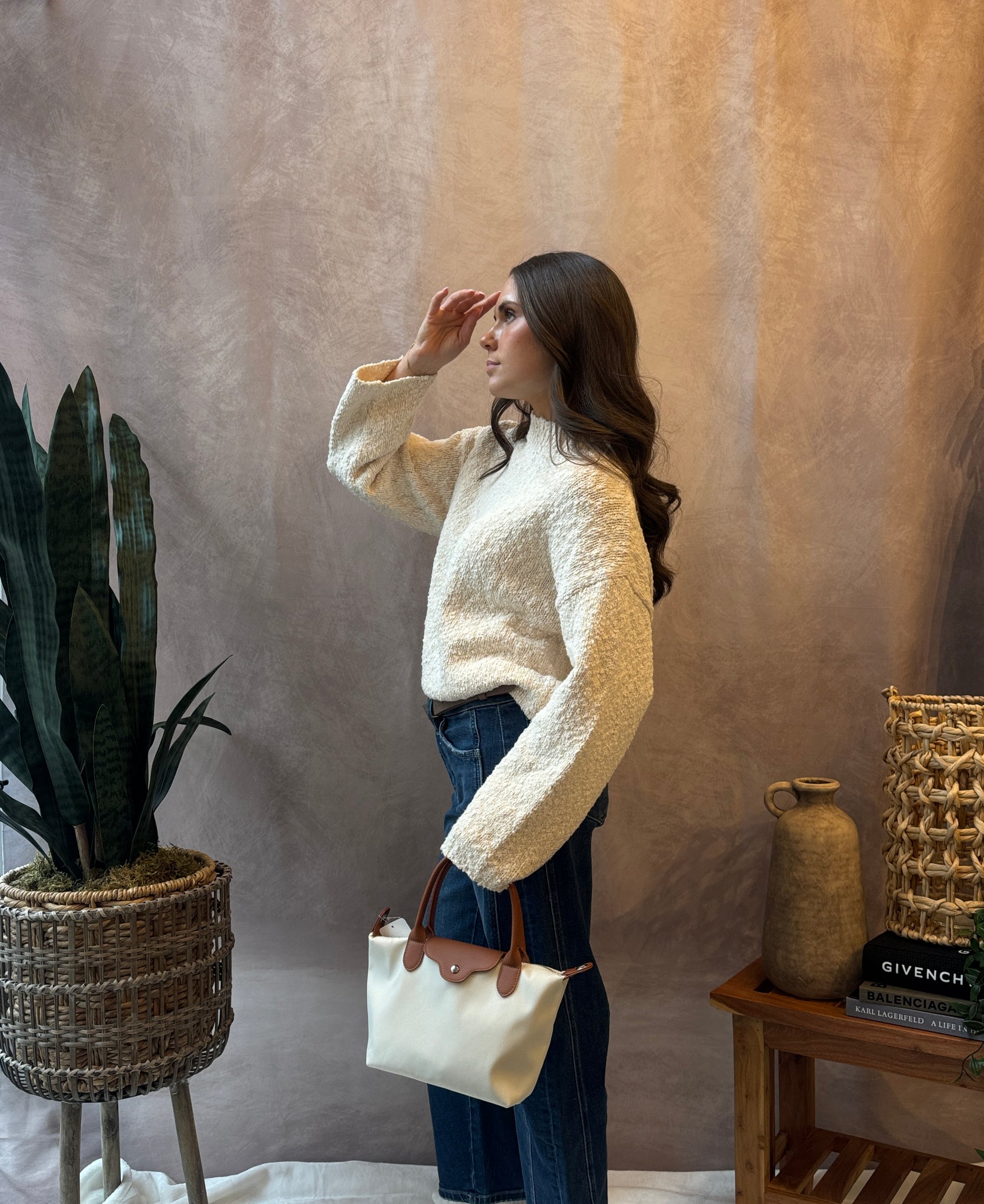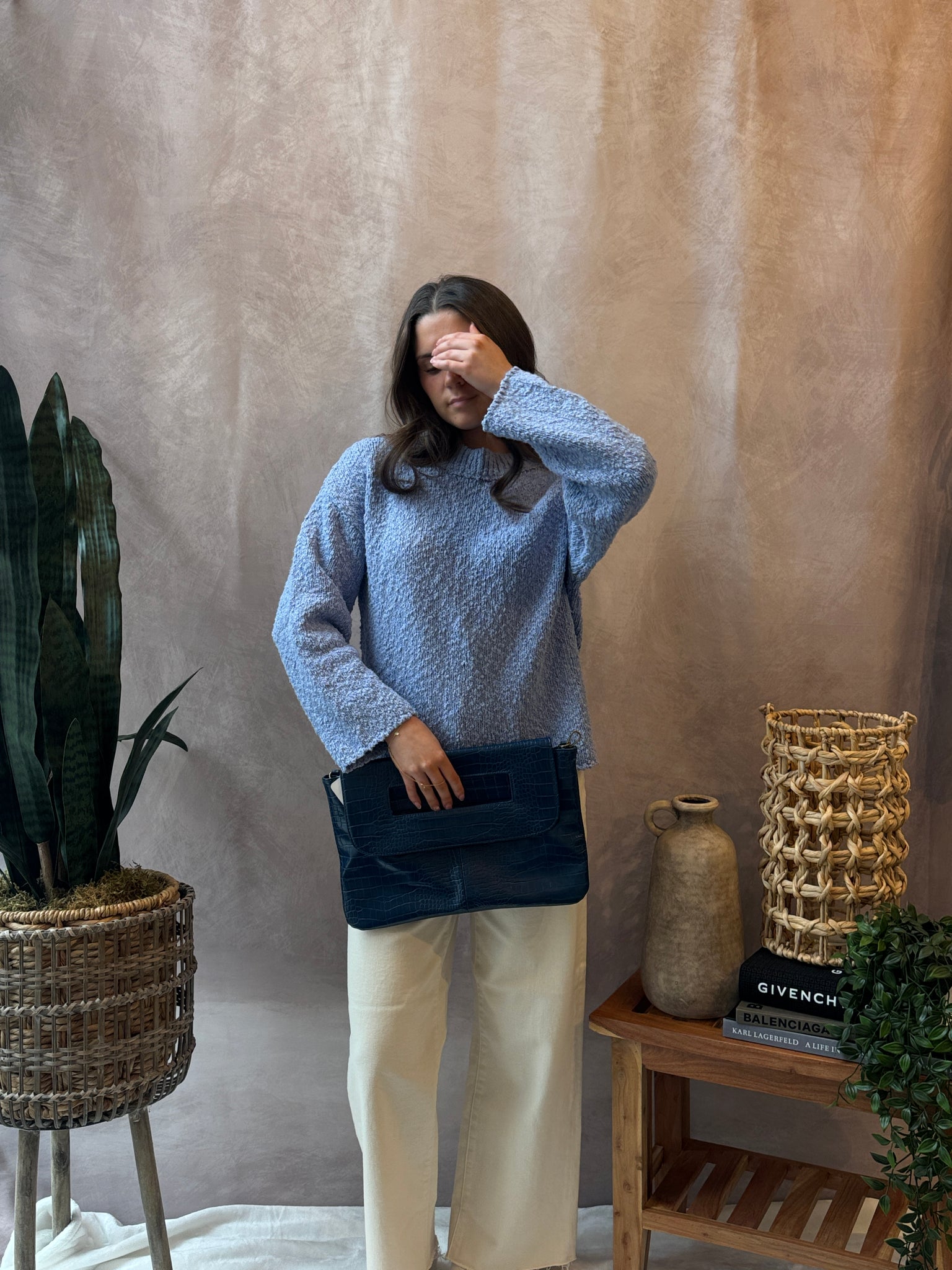 Textured Knit Pullover features a boucle style knit fabric that gives a cozy, elevated look and a relaxed drop shoulder fit with crew neckline for a classic and versatile finish.