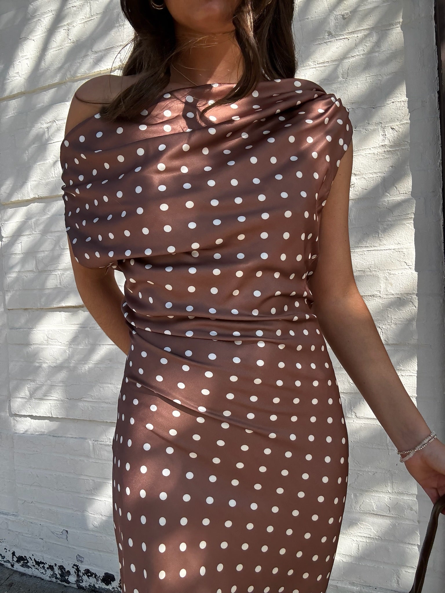 Woven Polyester Satin Polka Dot Cowl Neck Sleeveless Flare Maxi Dress With Rayon Lining And Side Zipper