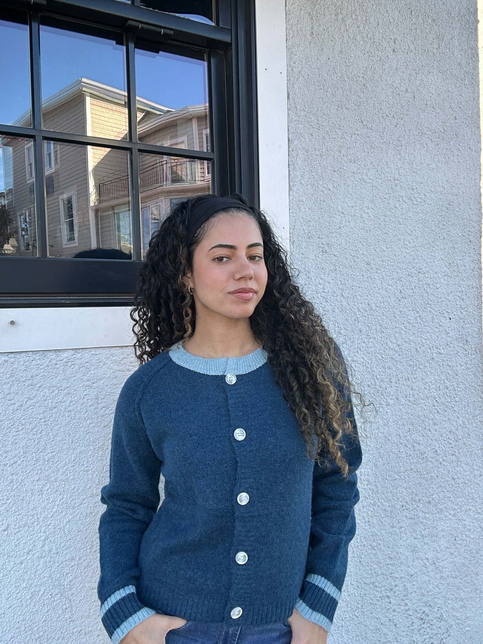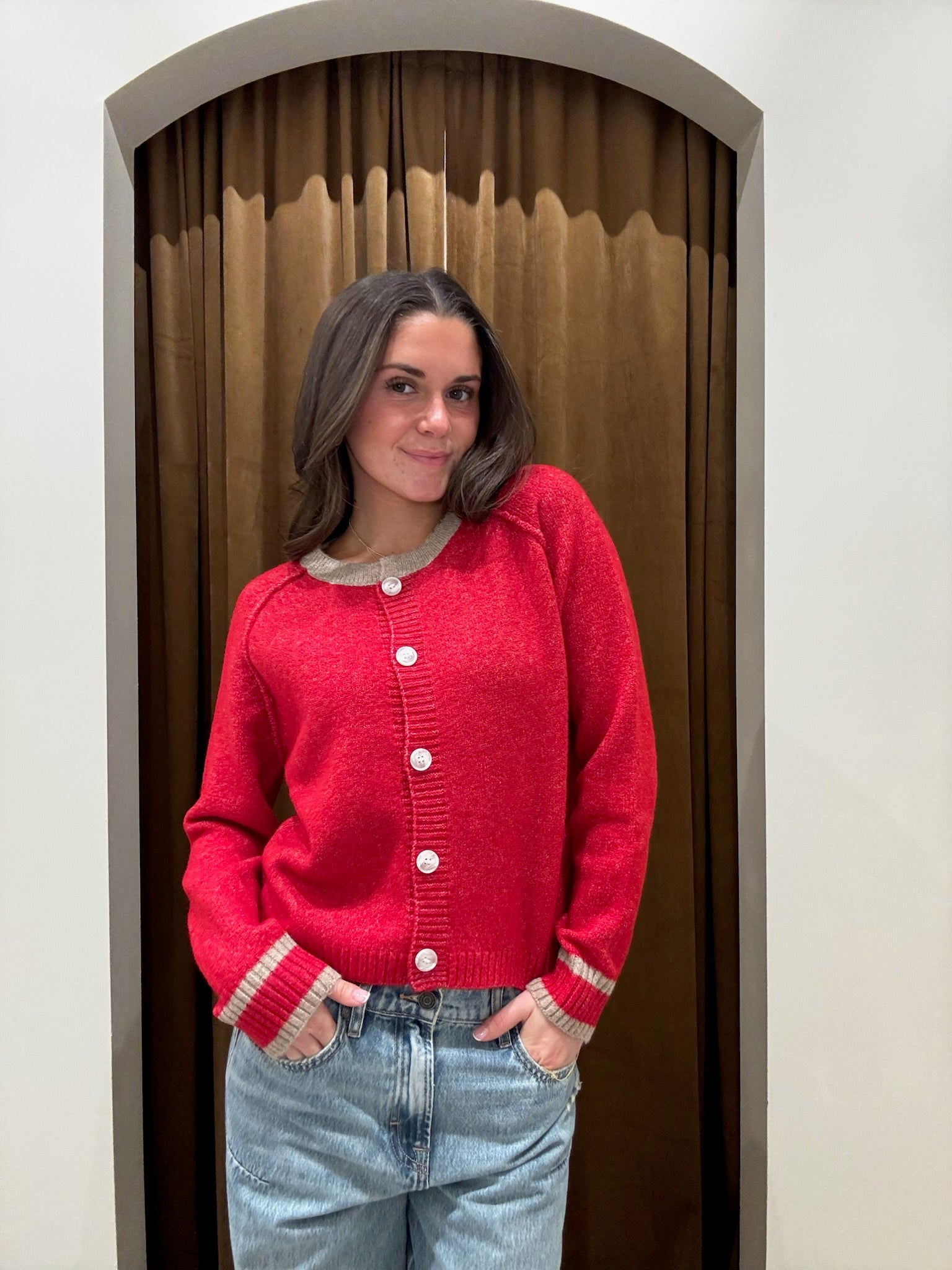 Two tone sweater cardigan Ribbed round neckline in contrast knit Ribbed button down placket Raglan seams Long sleeves Contrast striped ribbed cuffs Ribbed hem Relaxed fit bodice.