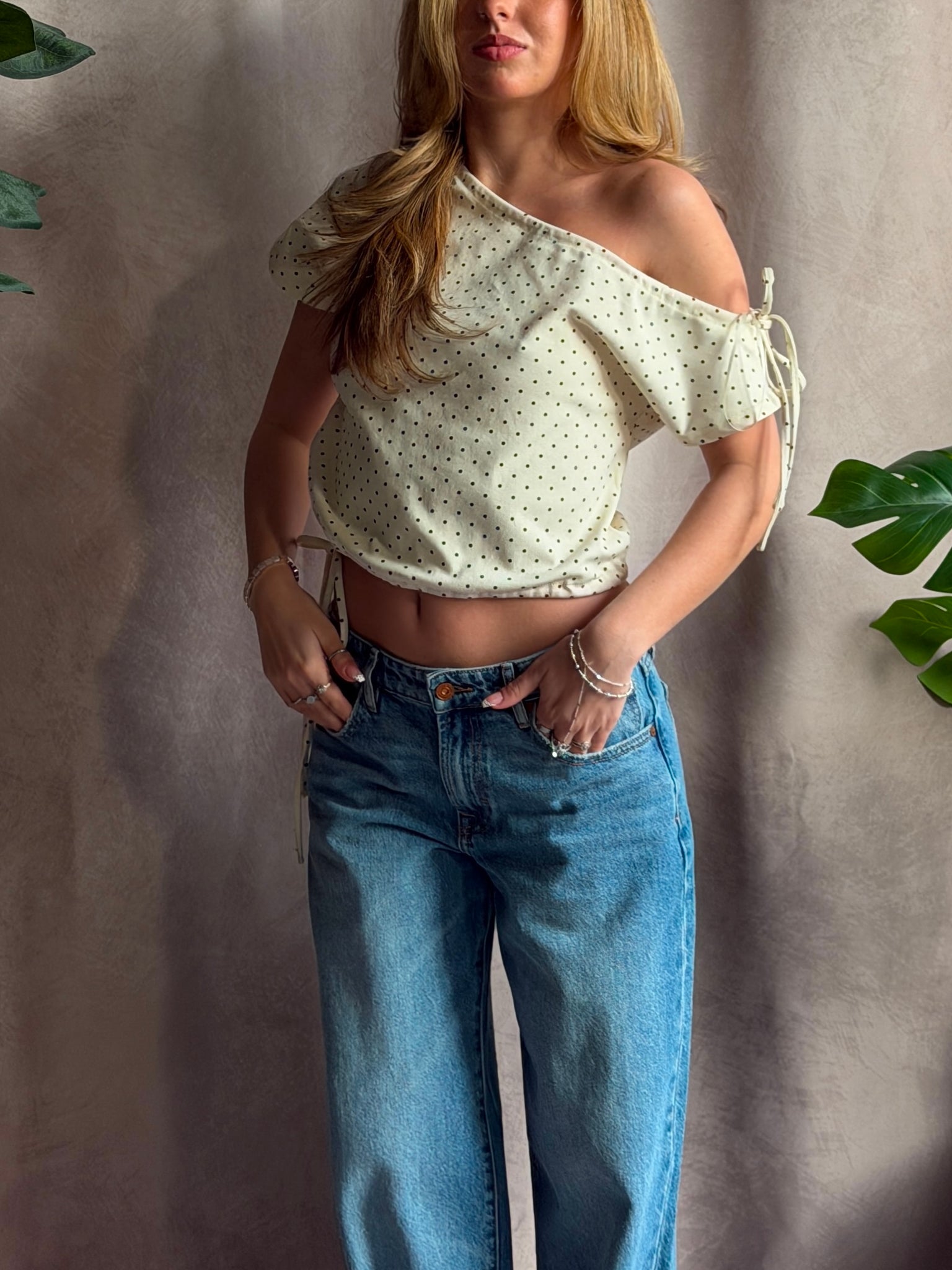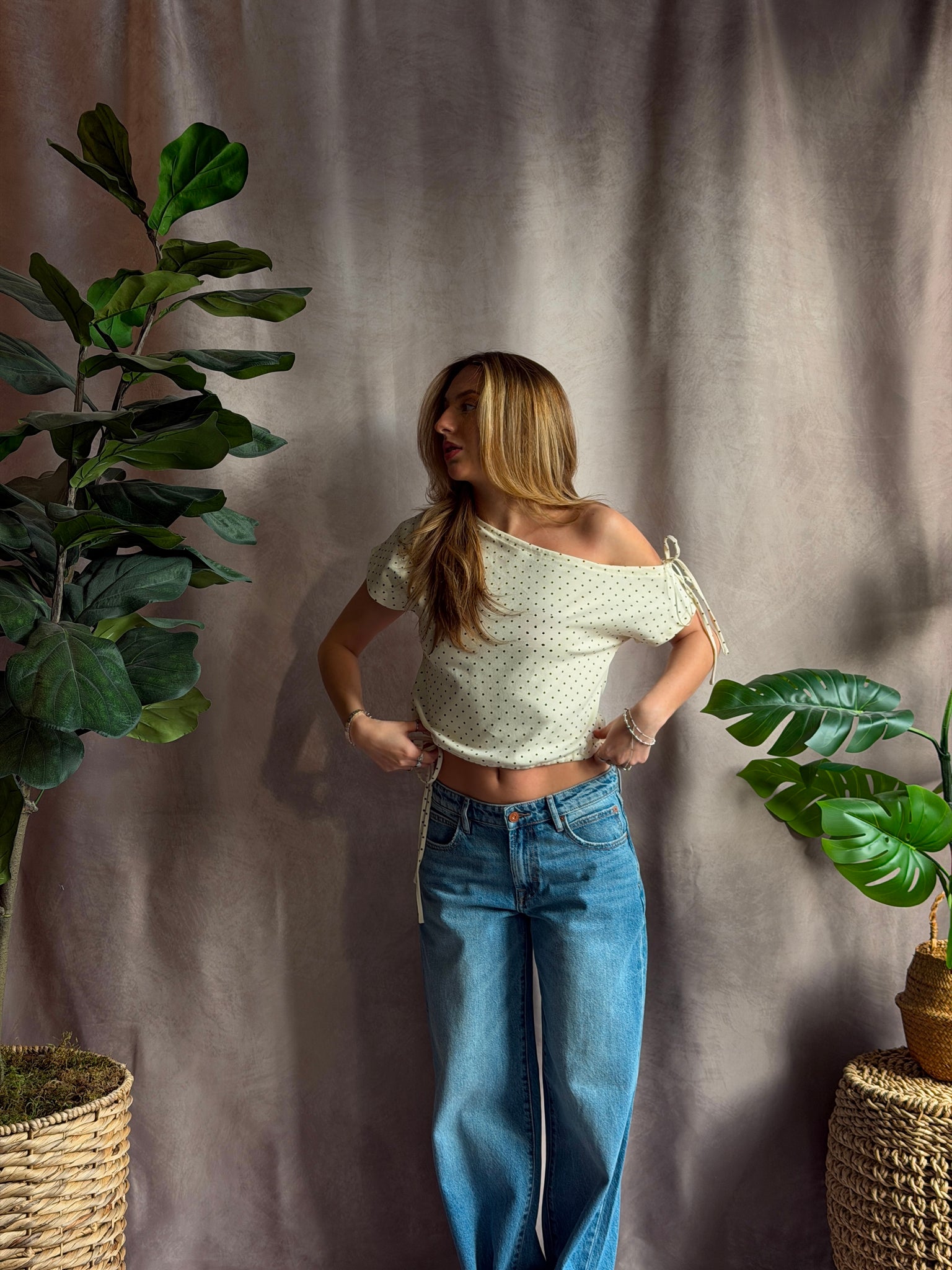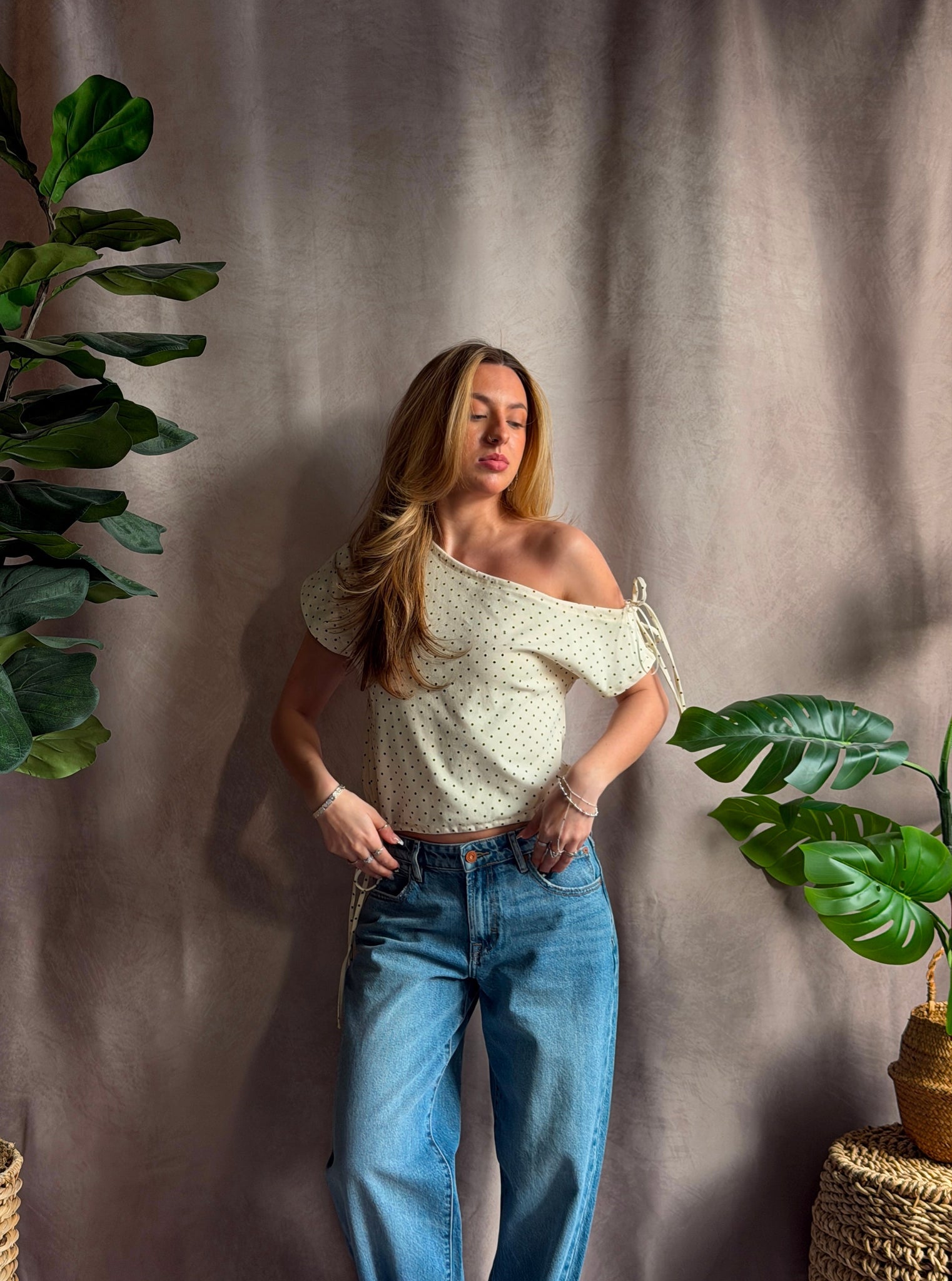 Polka dot off the shoulder tee with tie waist and shoulder detailing