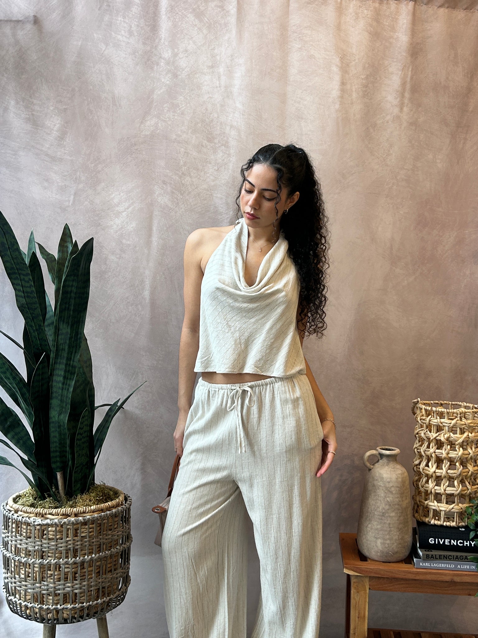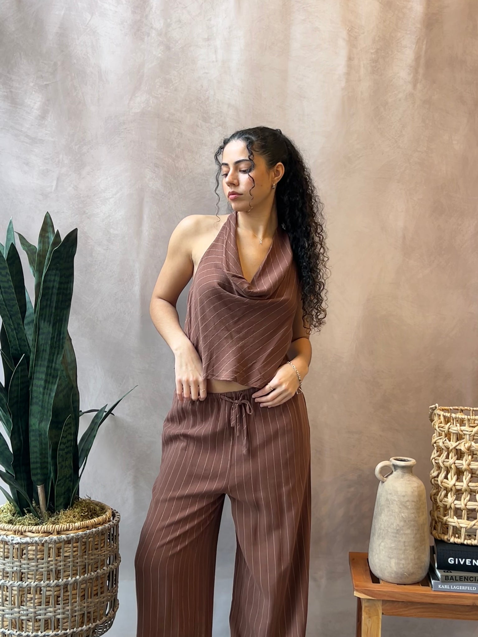 Halter top with cowl neck and pinstripe detailing