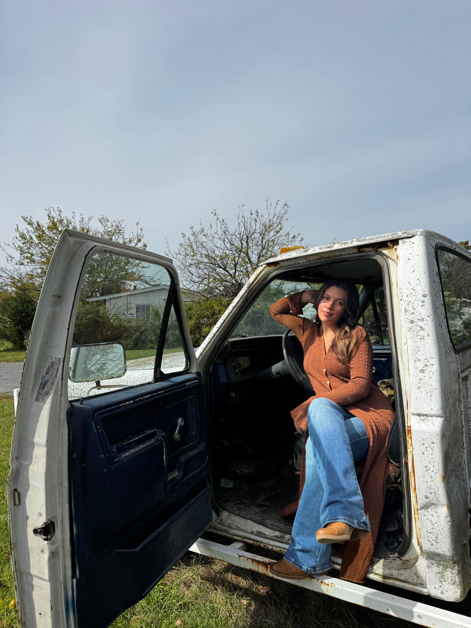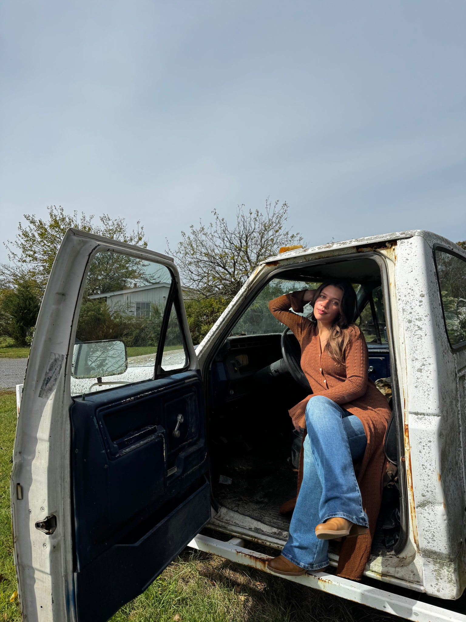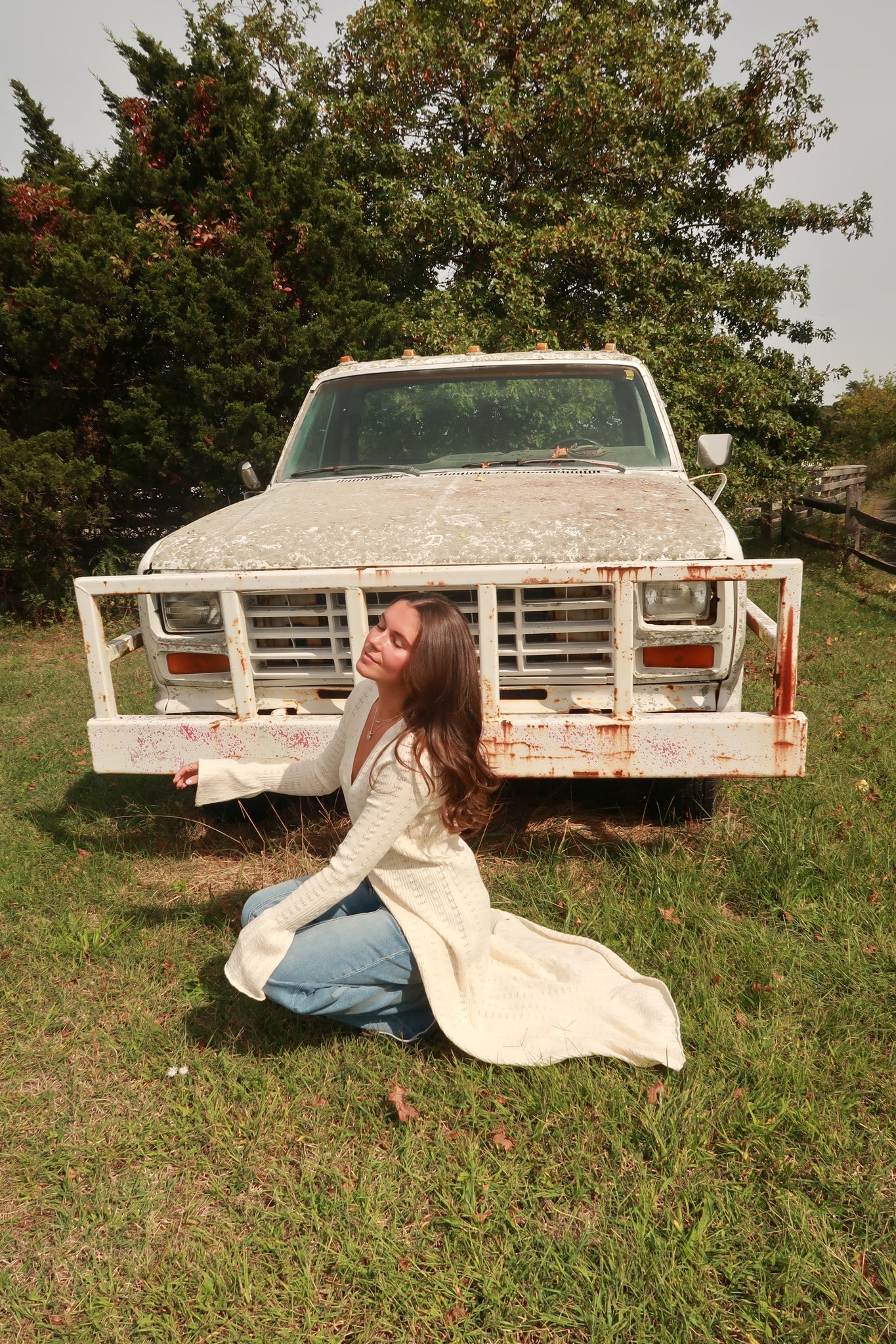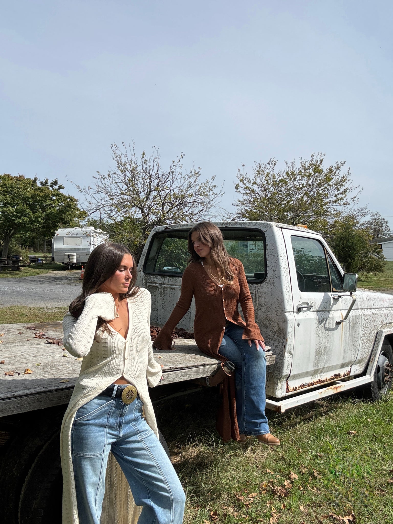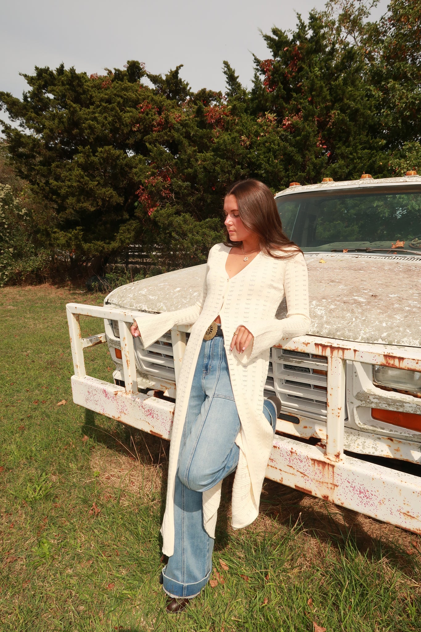 A pointelle ribbed knit duster cardigan sweater with the following features:V neckline.