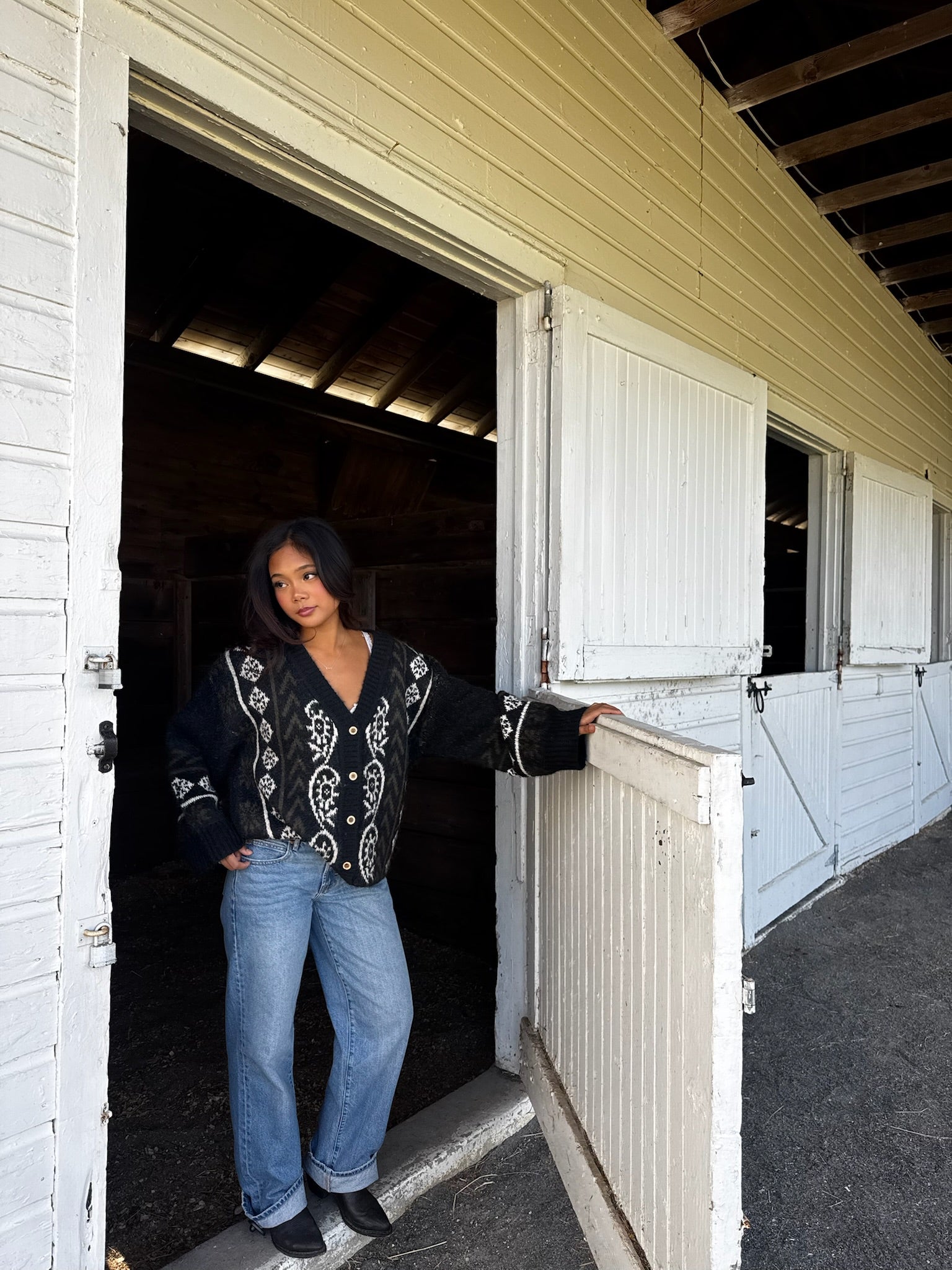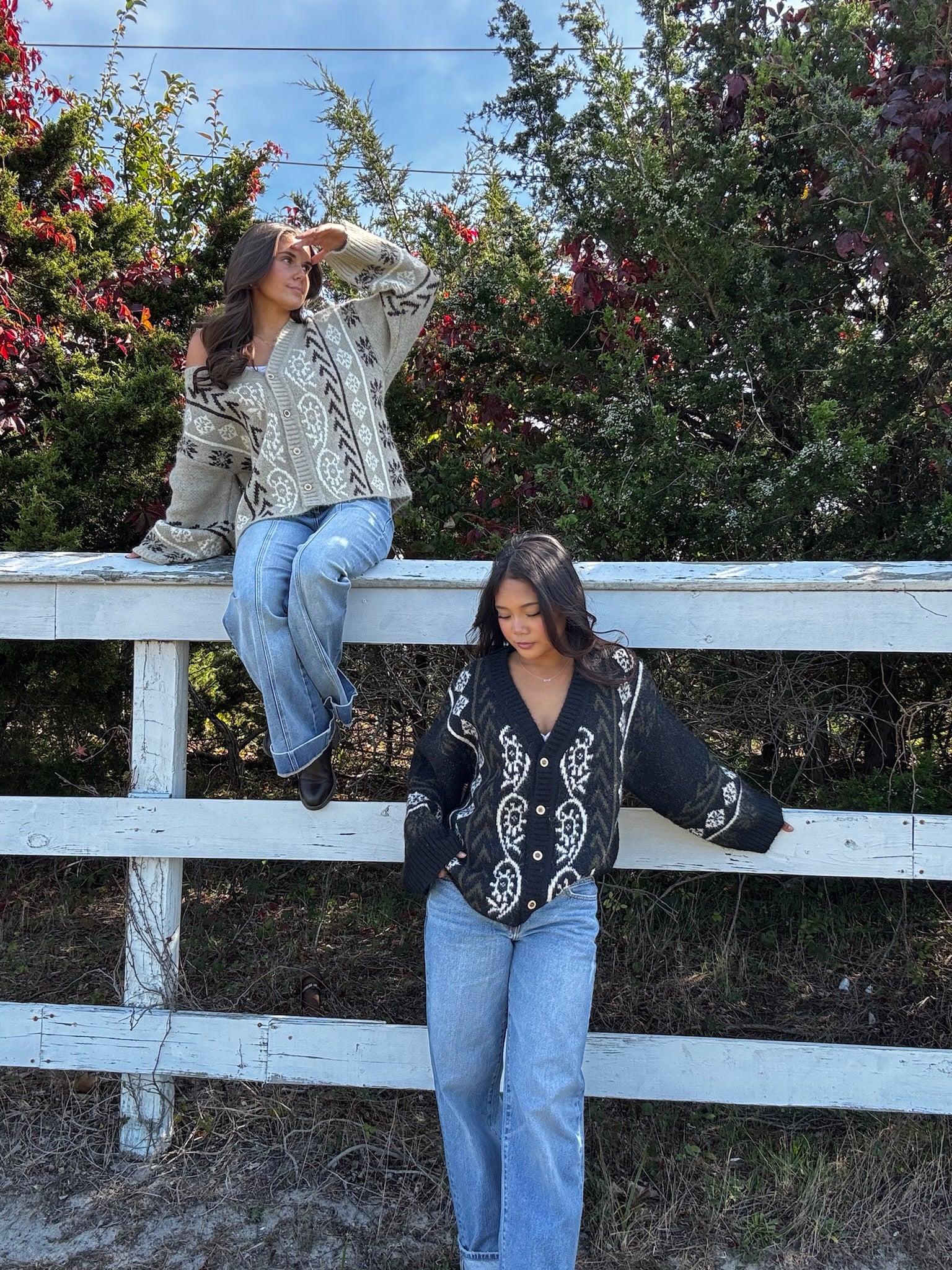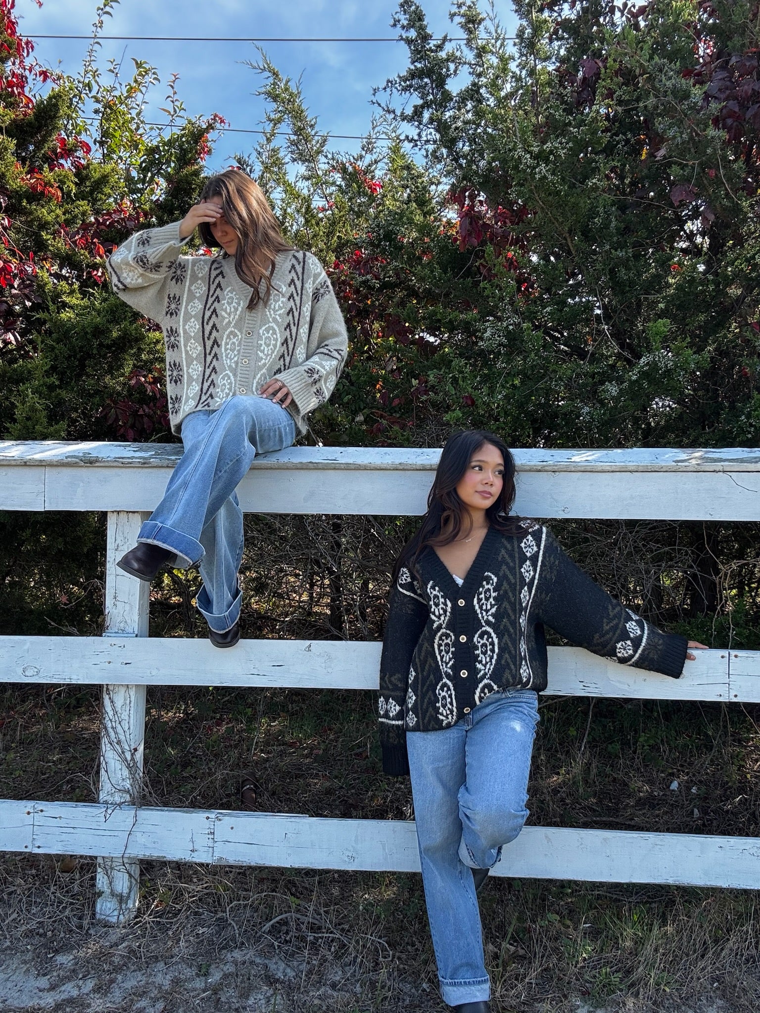 A fuzzy-knit, patterned jacquard sweater with the following features:Abstract and geometric patterns throughout.Deep V neckline.Button-front closure.Long sleeves.