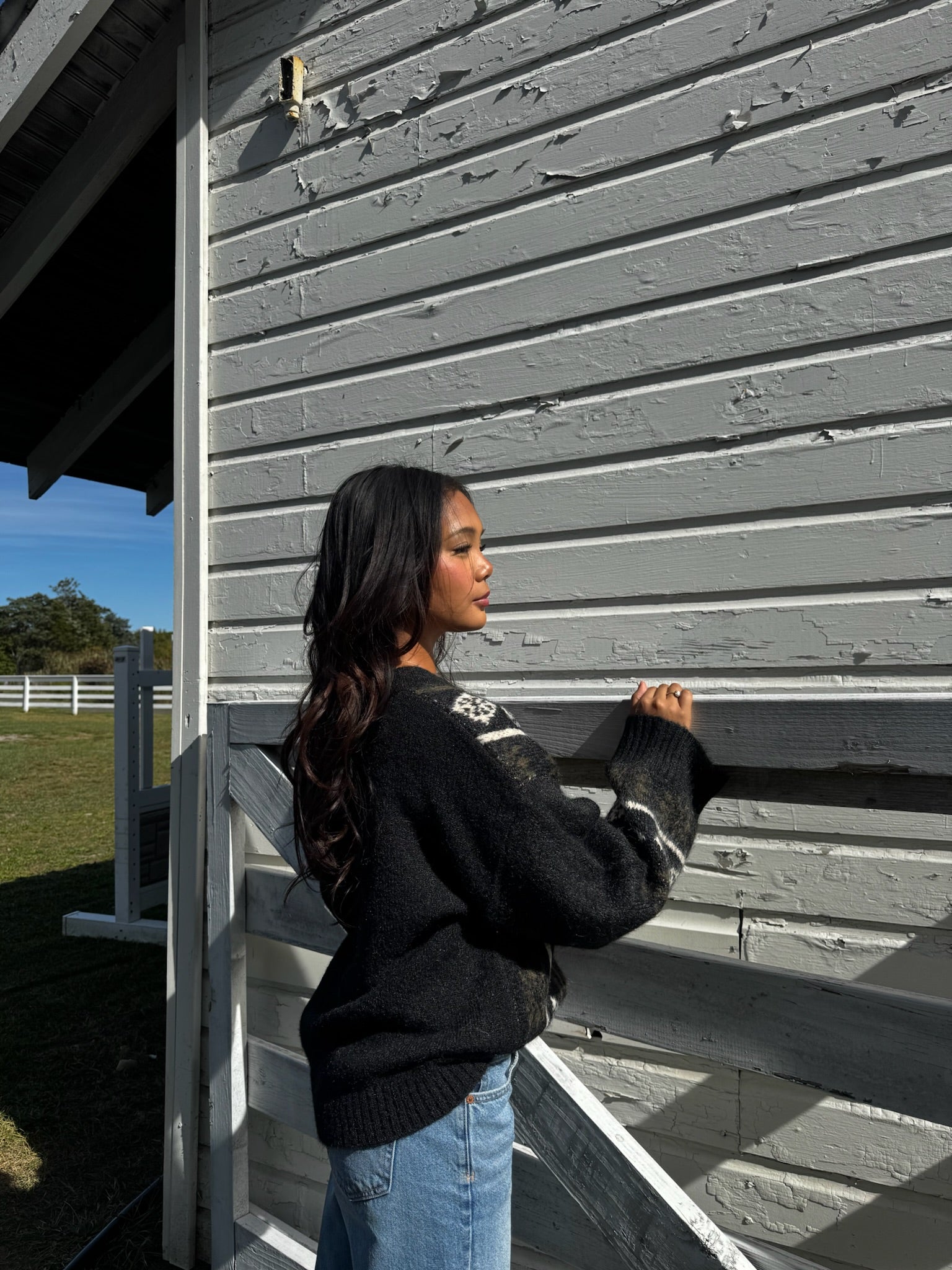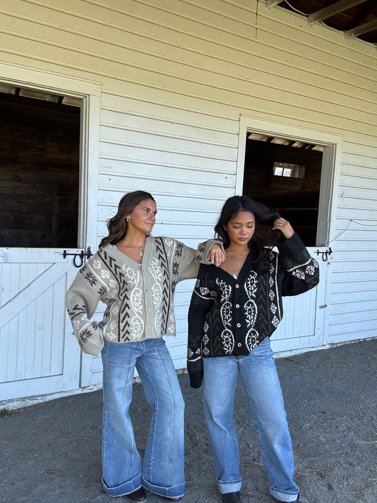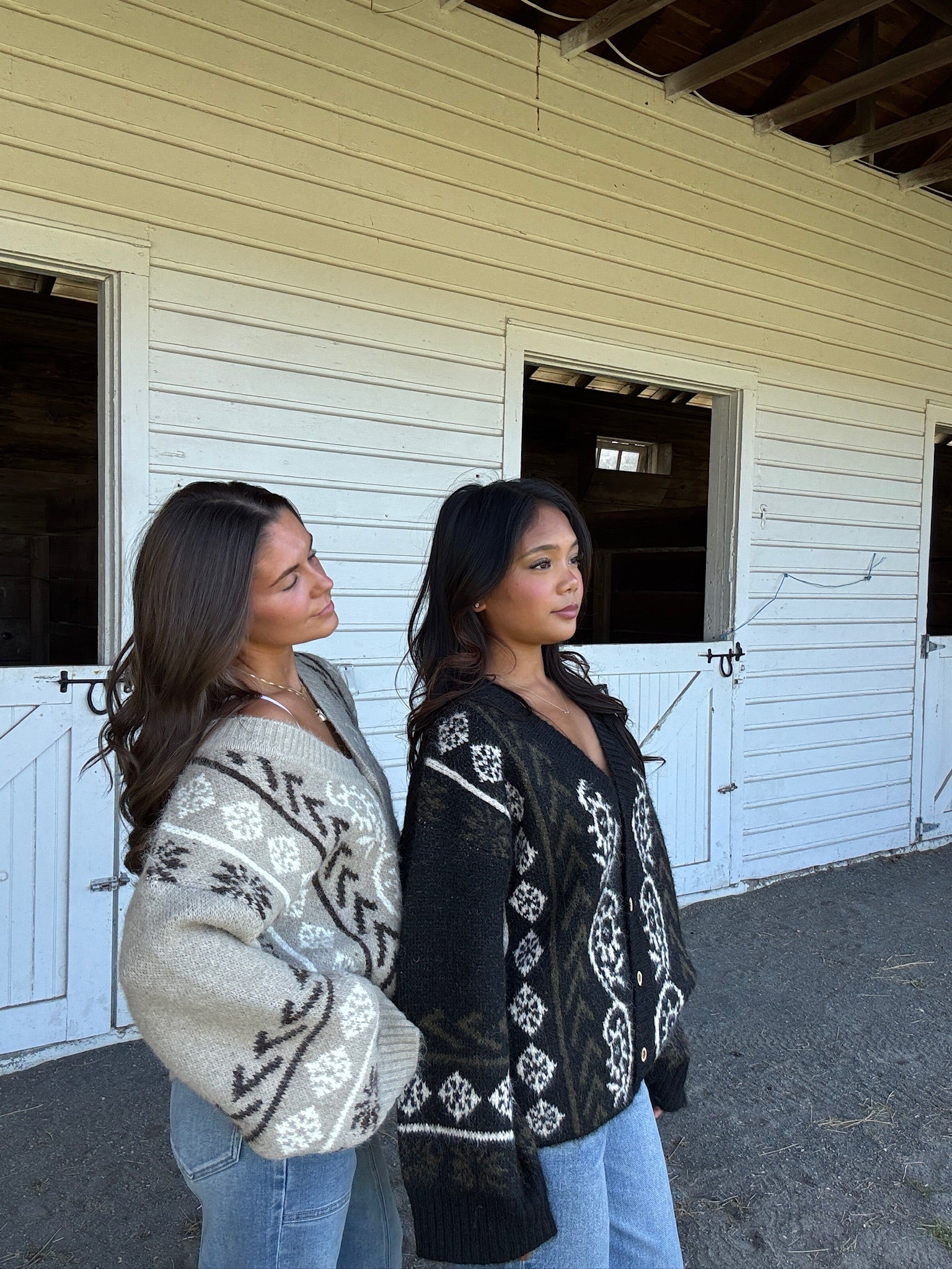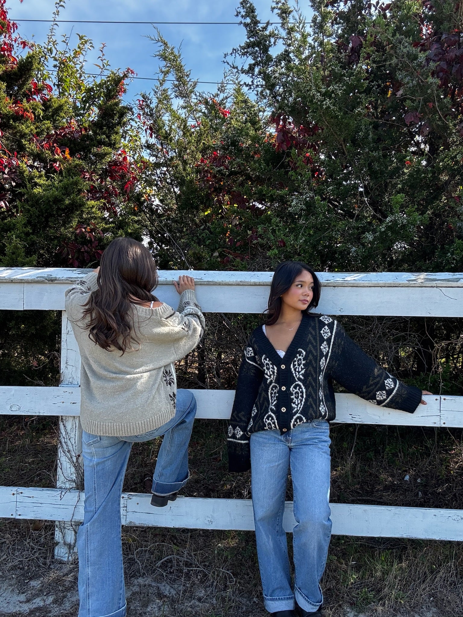 A fuzzy-knit, patterned jacquard sweater with the following features:Abstract and geometric patterns throughout.Deep V neckline.Button-front closure.Long sleeves.