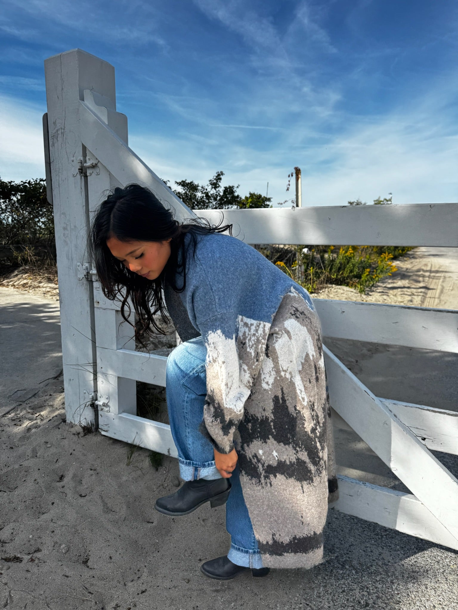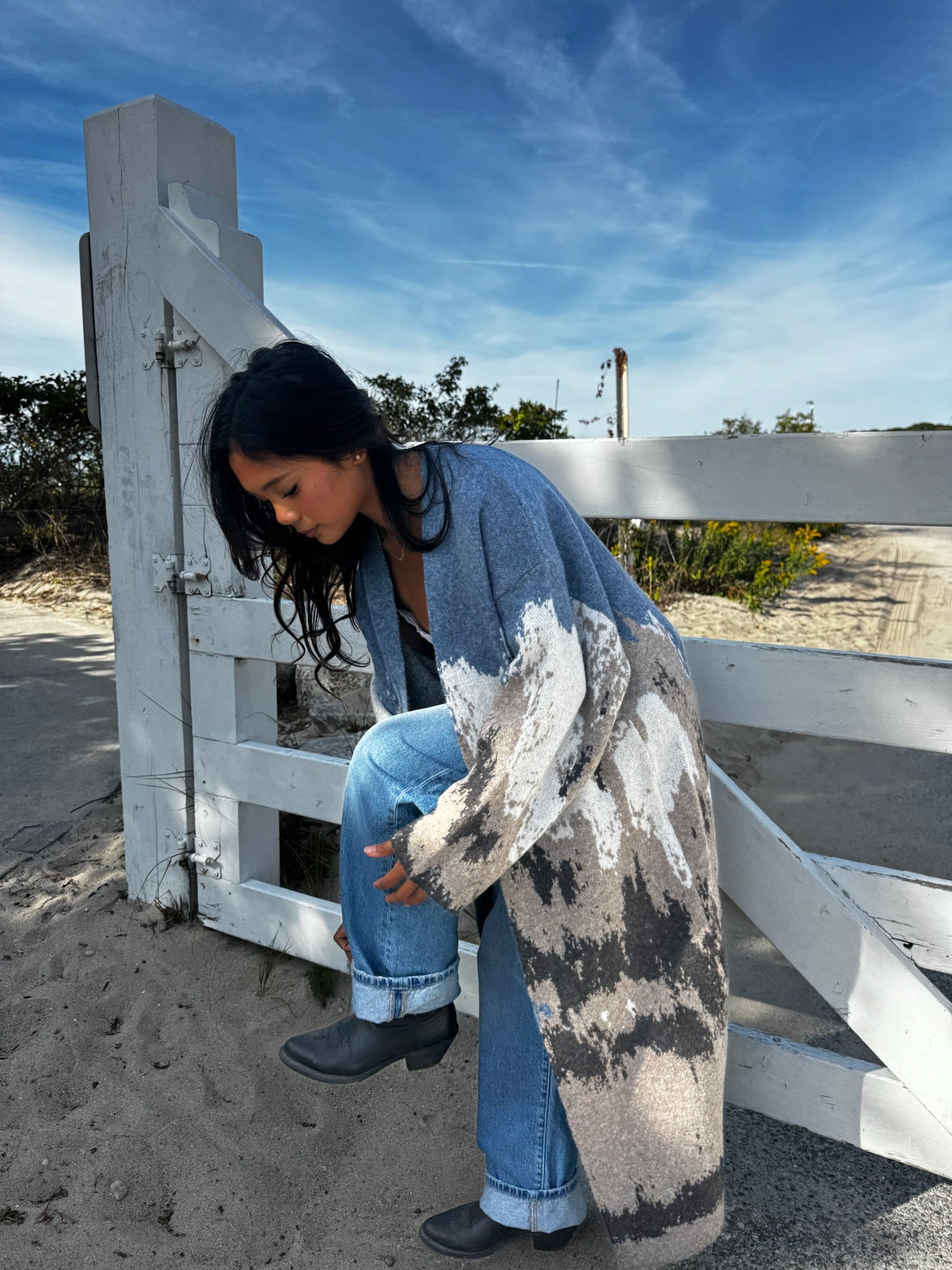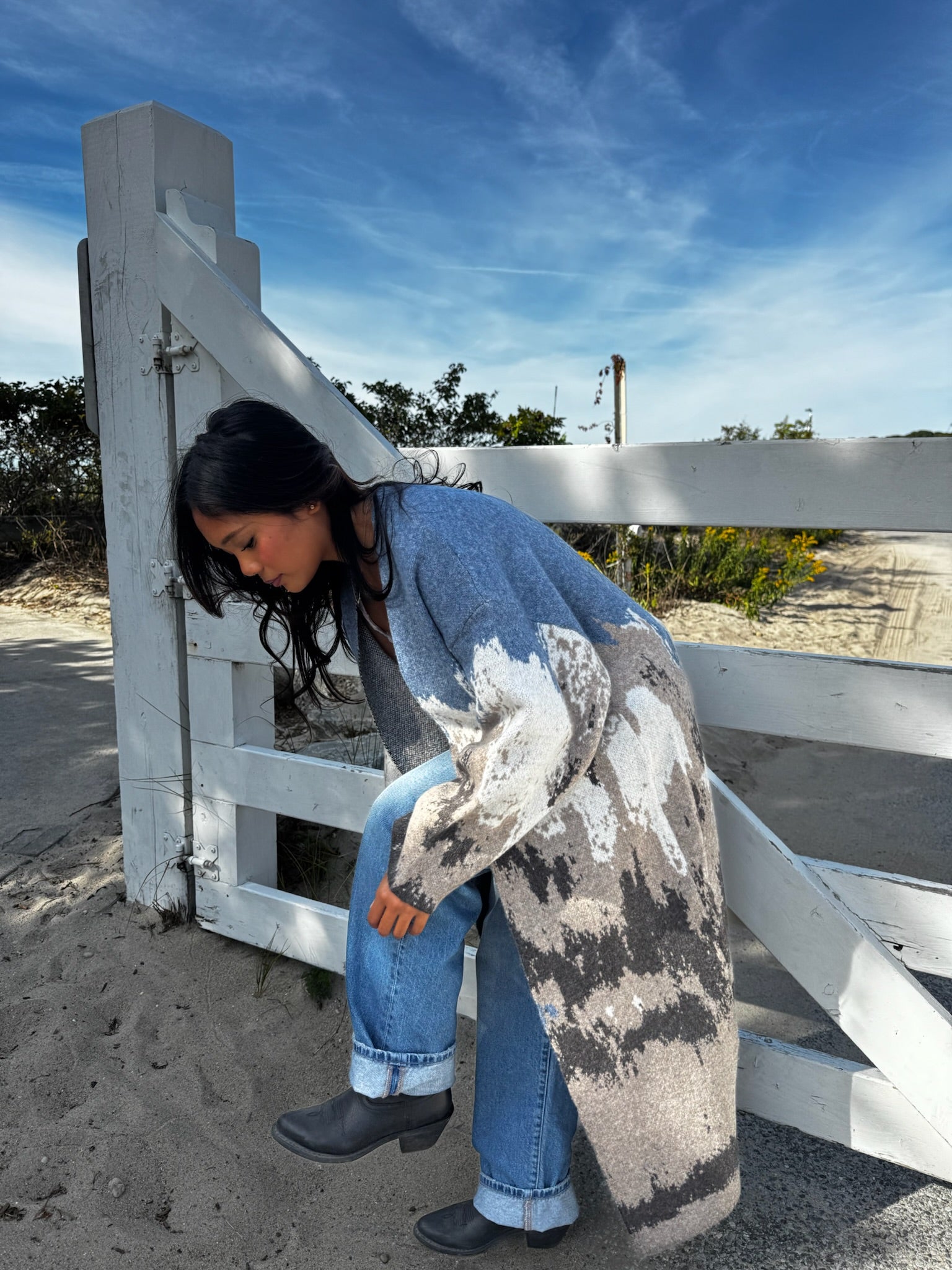 Graphic jacquard-knit cardigan sweater with the following features:Knitted-in mountain landscape design.Open front.Side seam pockets.Long sleeves.Drop shoulder.Calf length.