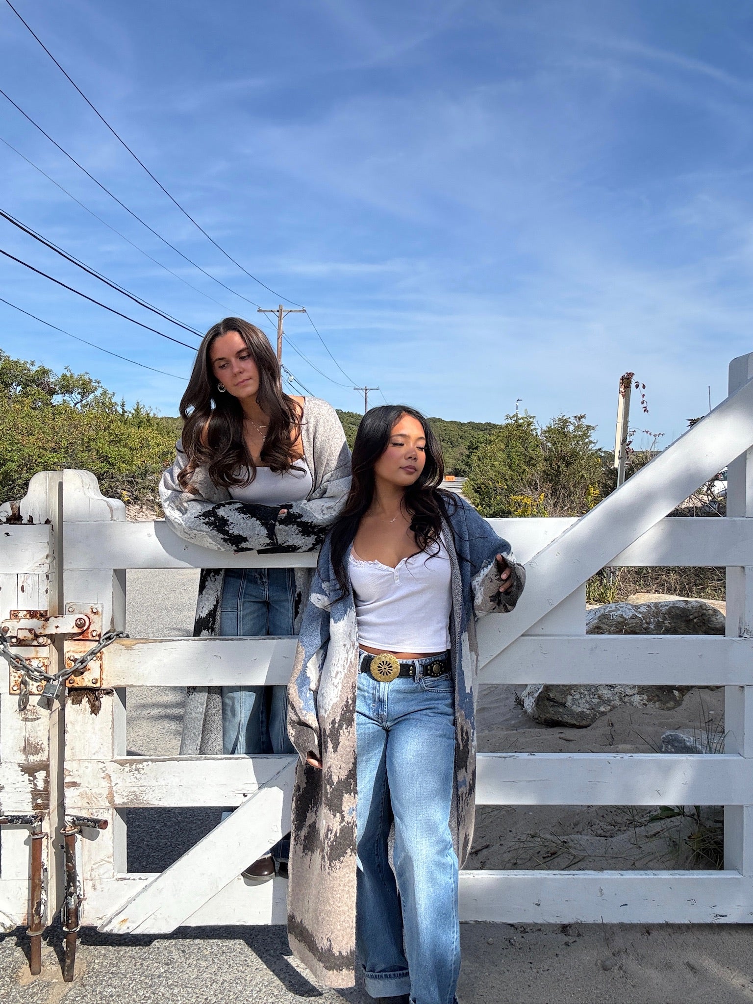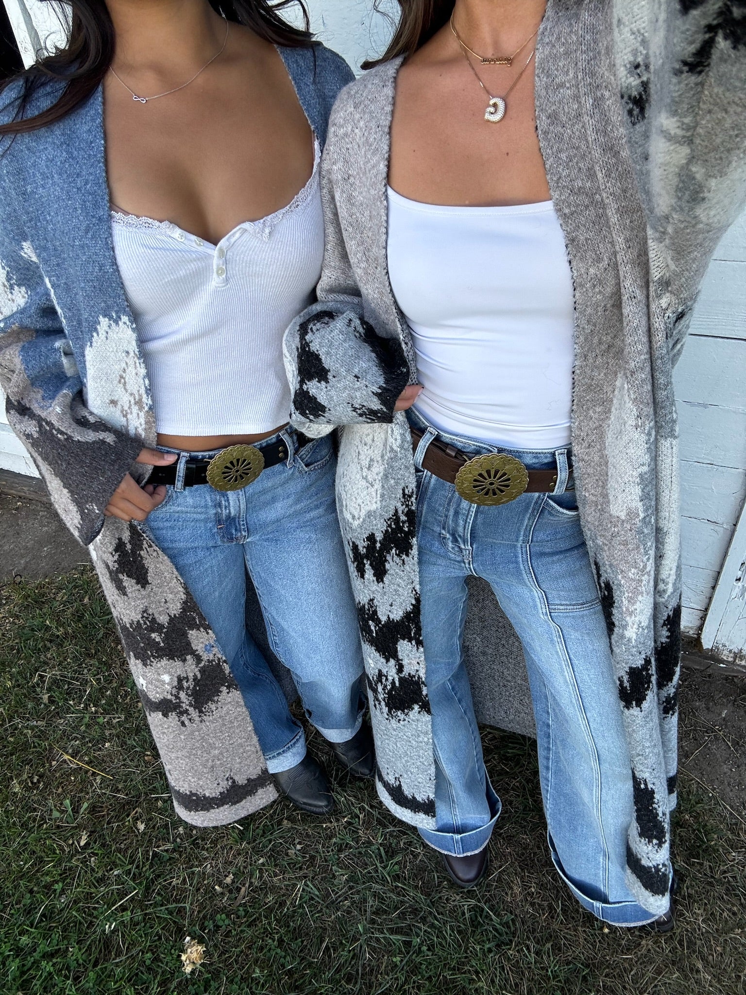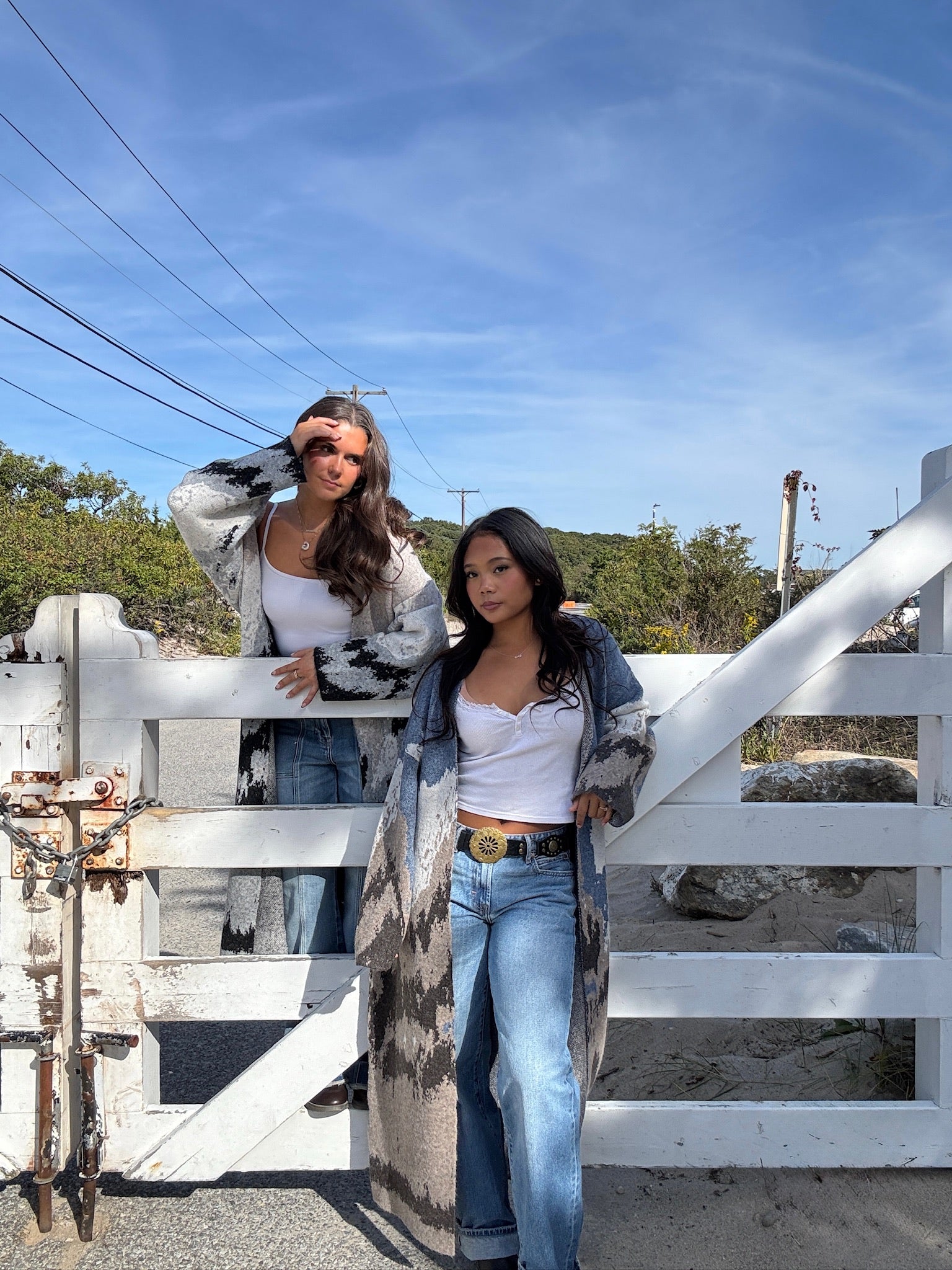 Graphic jacquard-knit cardigan sweater with the following features:Knitted-in mountain landscape design.Open front.Side seam pockets.Long sleeves.Drop shoulder.Calf length.