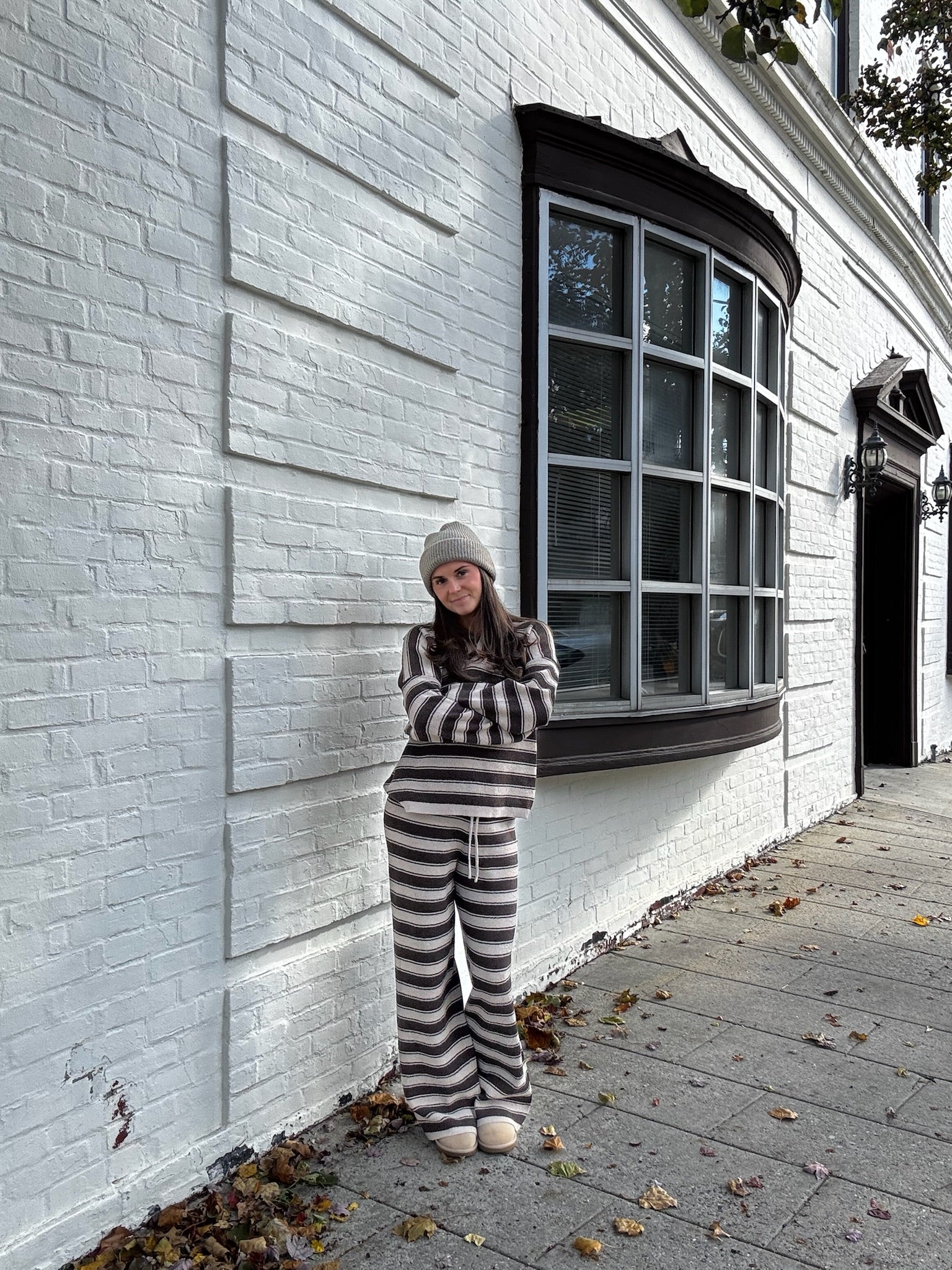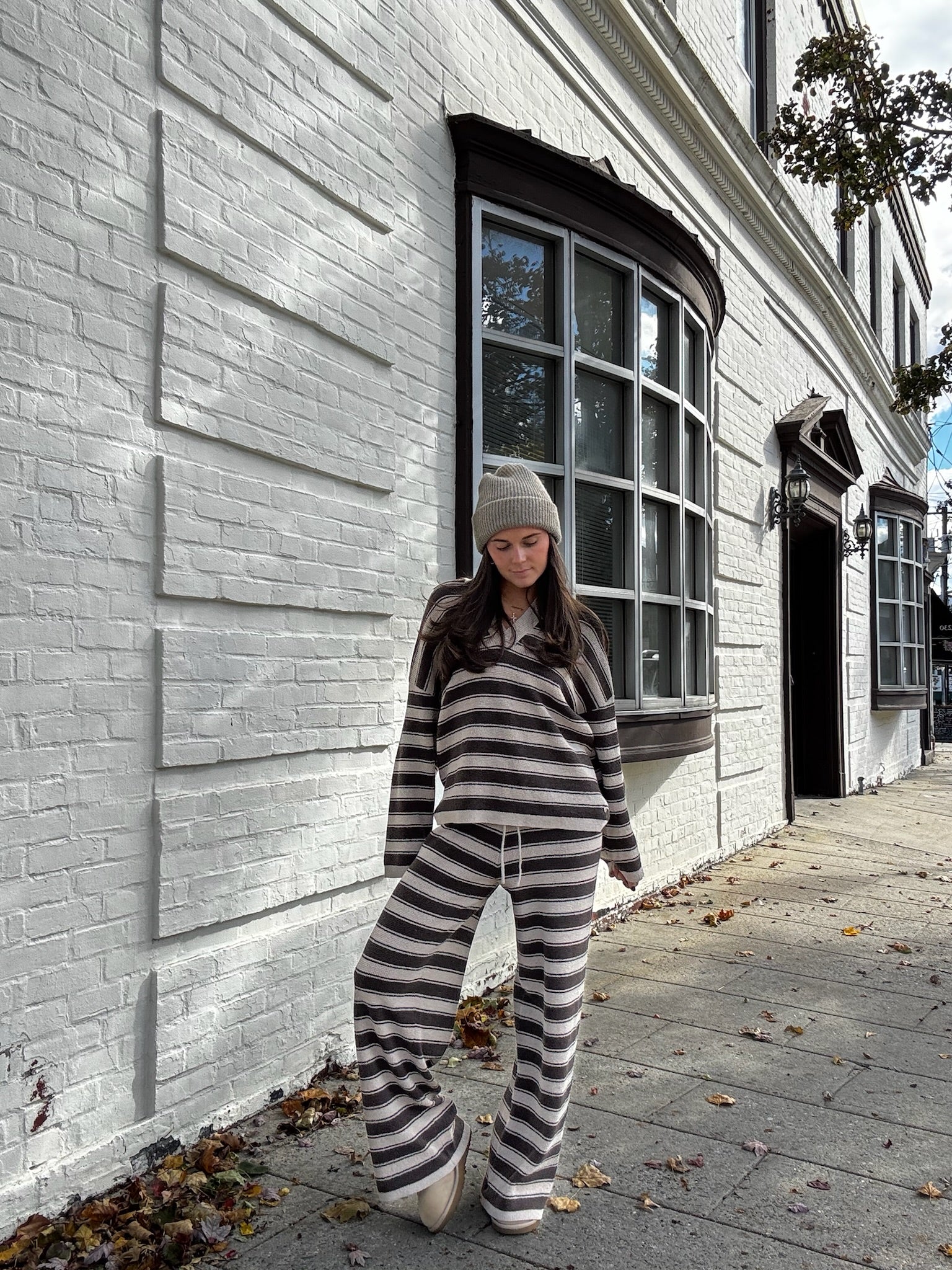 A pair of striped knit sweater pants with the following features:Drawstring elastic waist.Straight leg.Ribbed knit waistband and hem.Loose fit.
