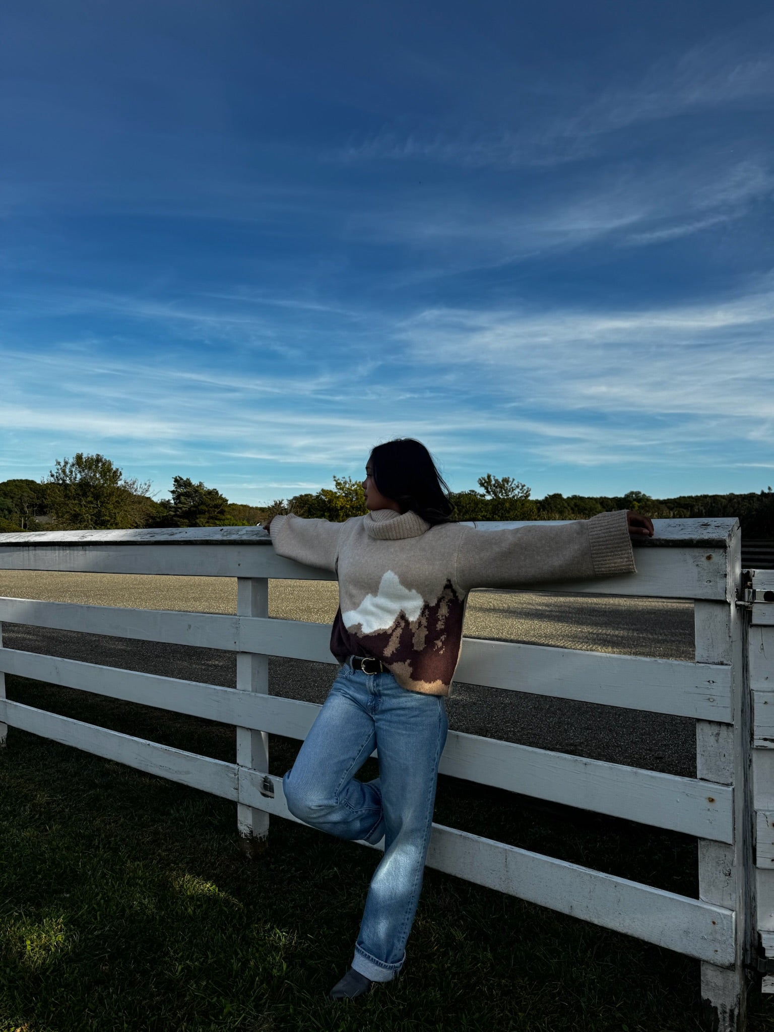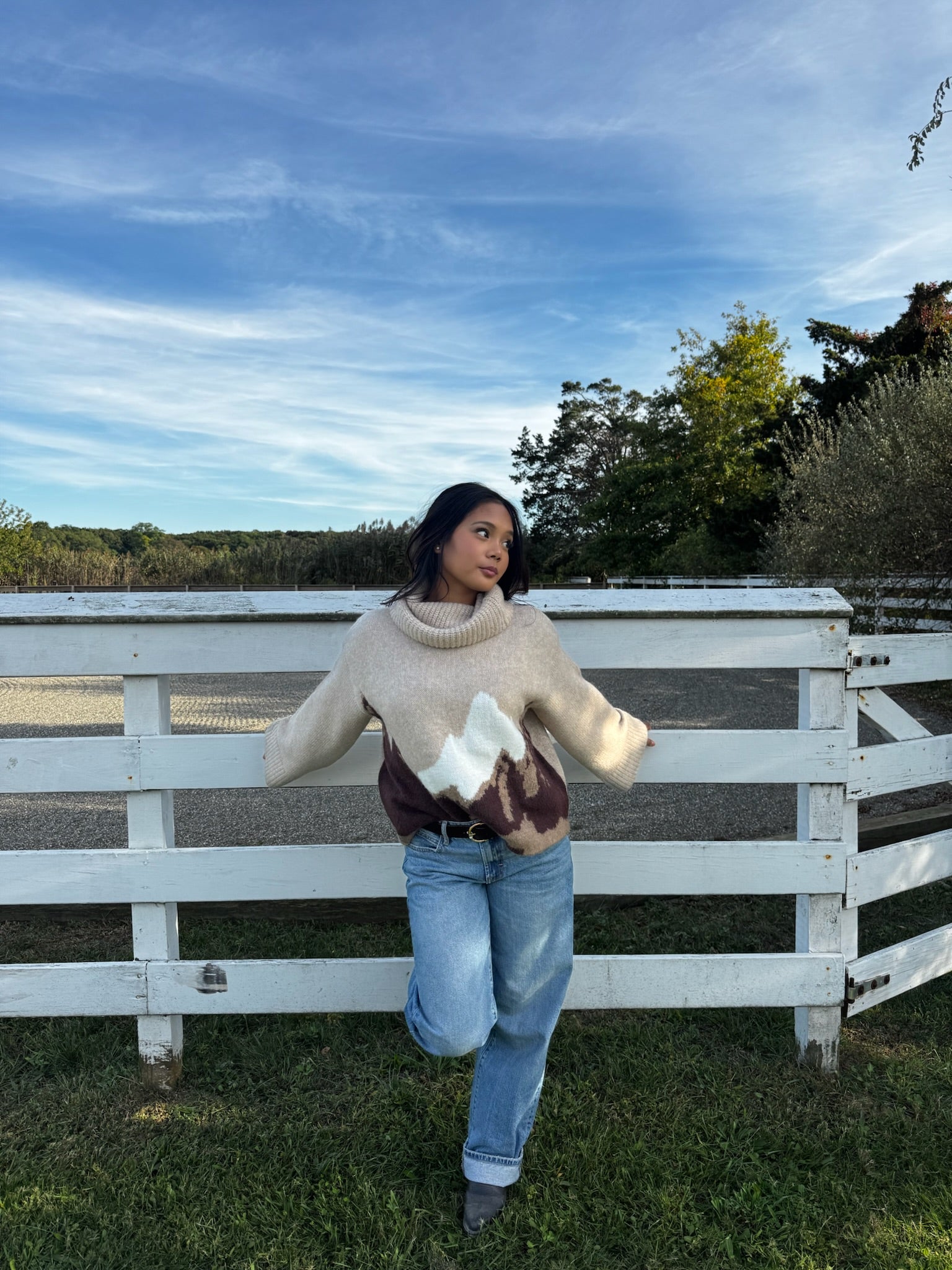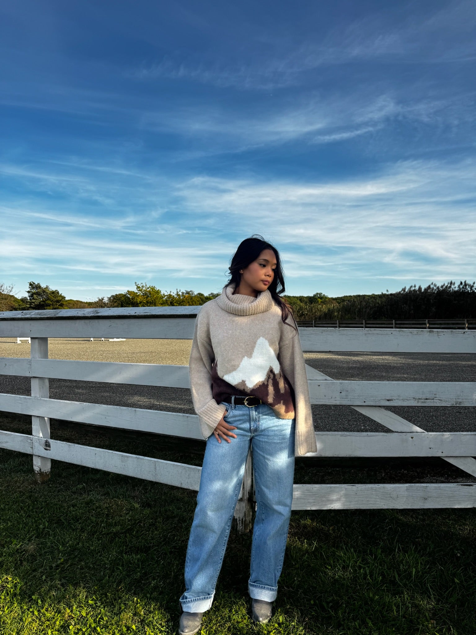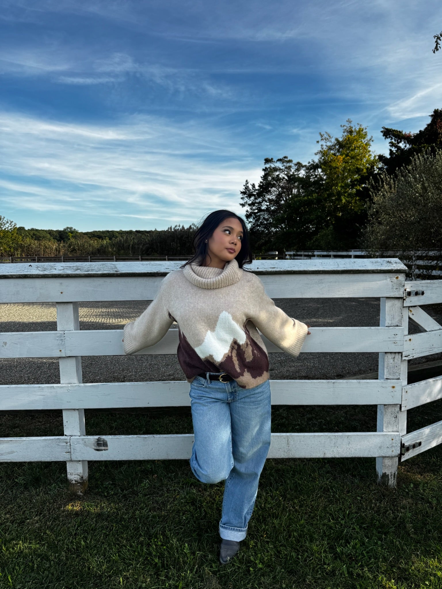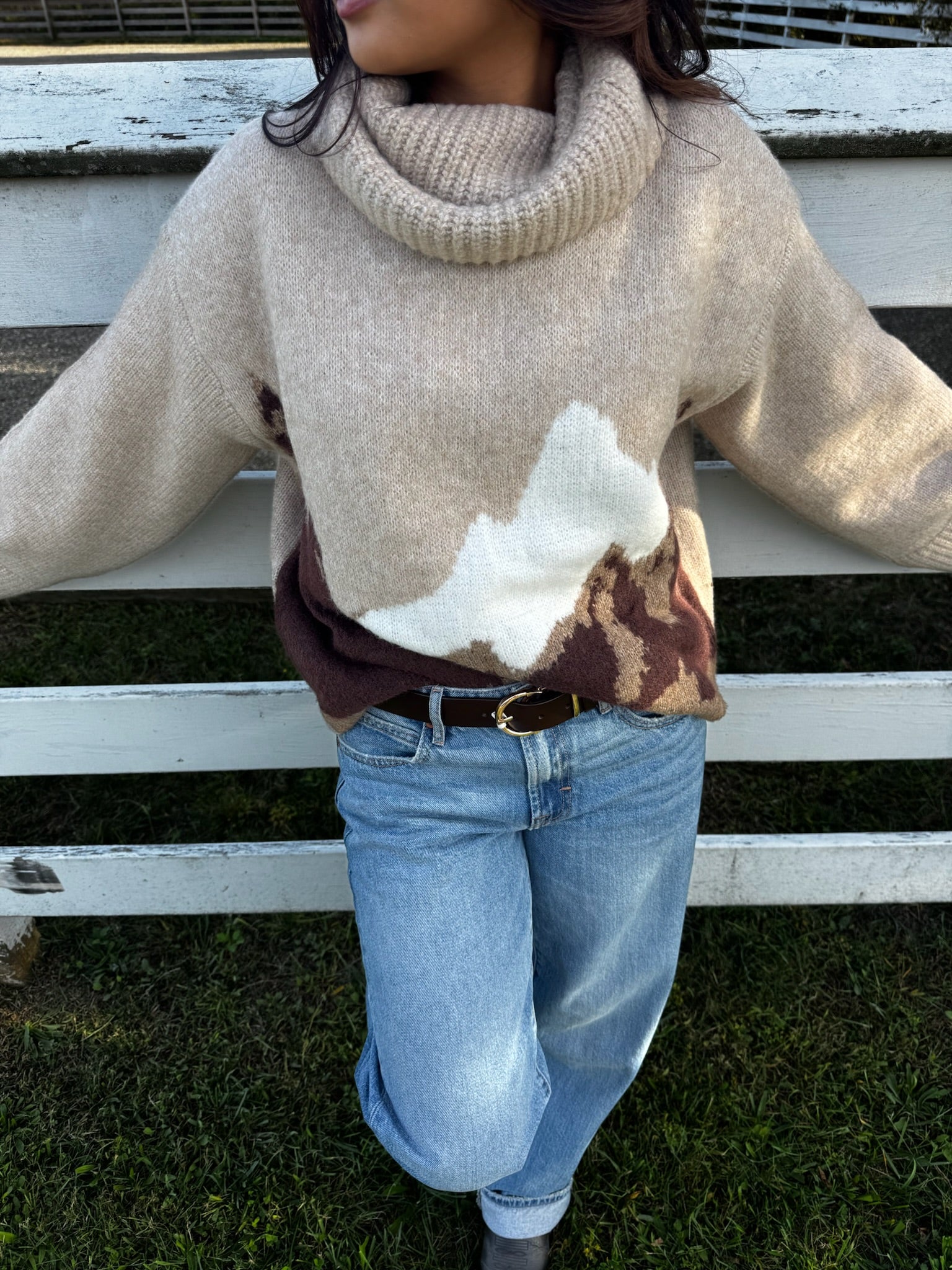 A fuzzy jacquard knit sweater with the following features:Mountain landscape knitted-in pattern.Oversize turtleneck collar.Wide long sleeves.Drop shoulder.Ribbed knit collar and cuffs.Relaxed fit.