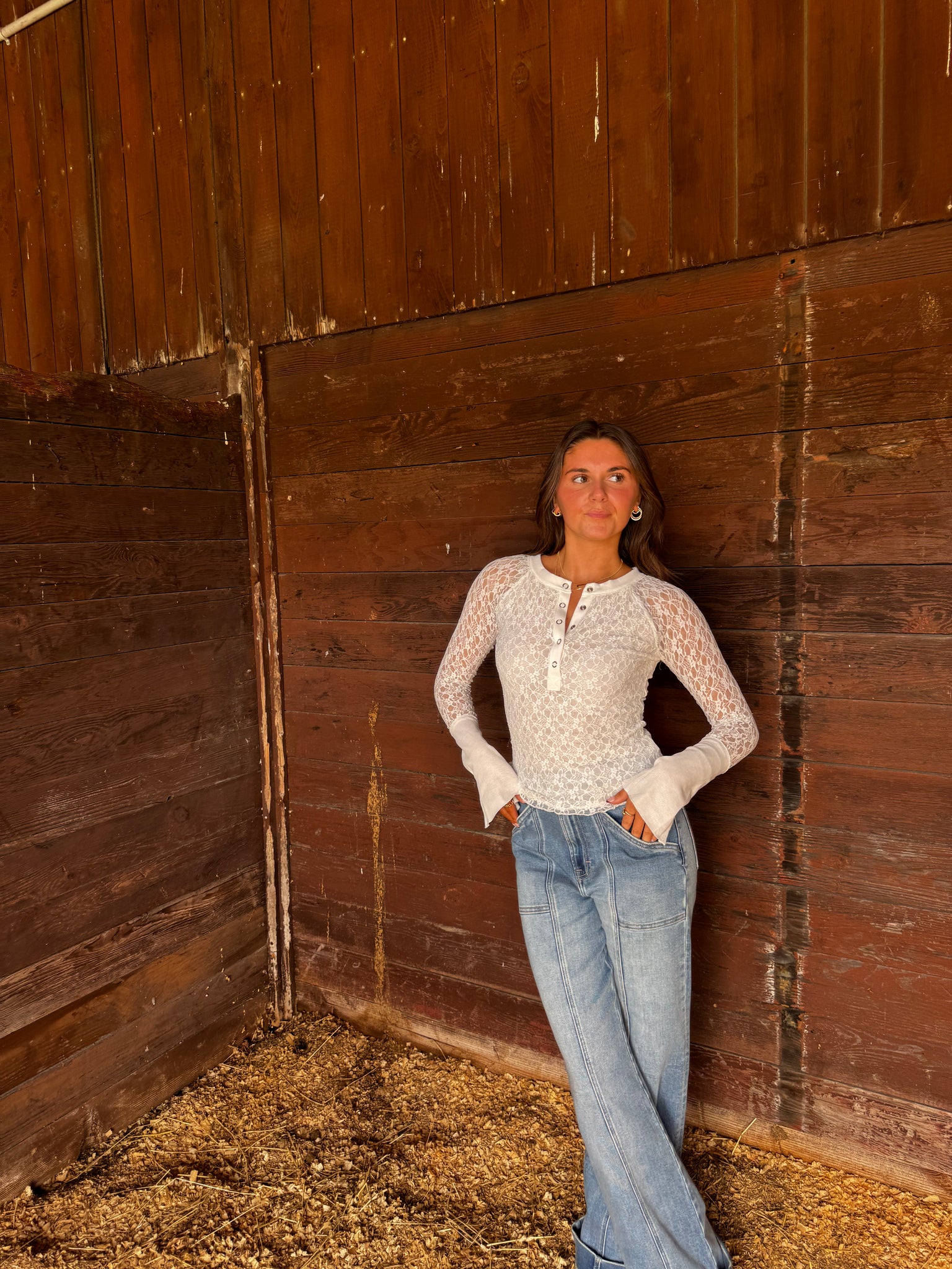 A floral lace top with the following features:Round neckline with rib-knit trim.