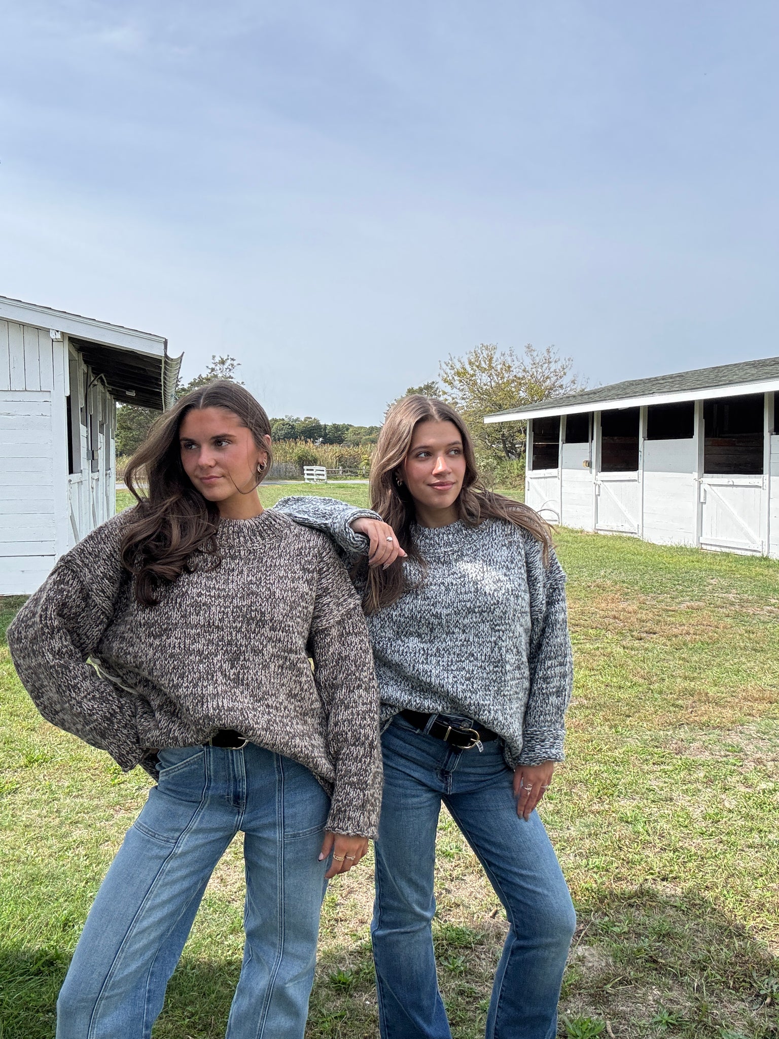 A two-tone marled knit sweater with the following features:Oversized stitch detail along sides.Crew neckline with ribbed knit collar.Long sleeves.Drop shoulder.Exposed shoulder seam.Rolled cuffs and hem.Loose fit.