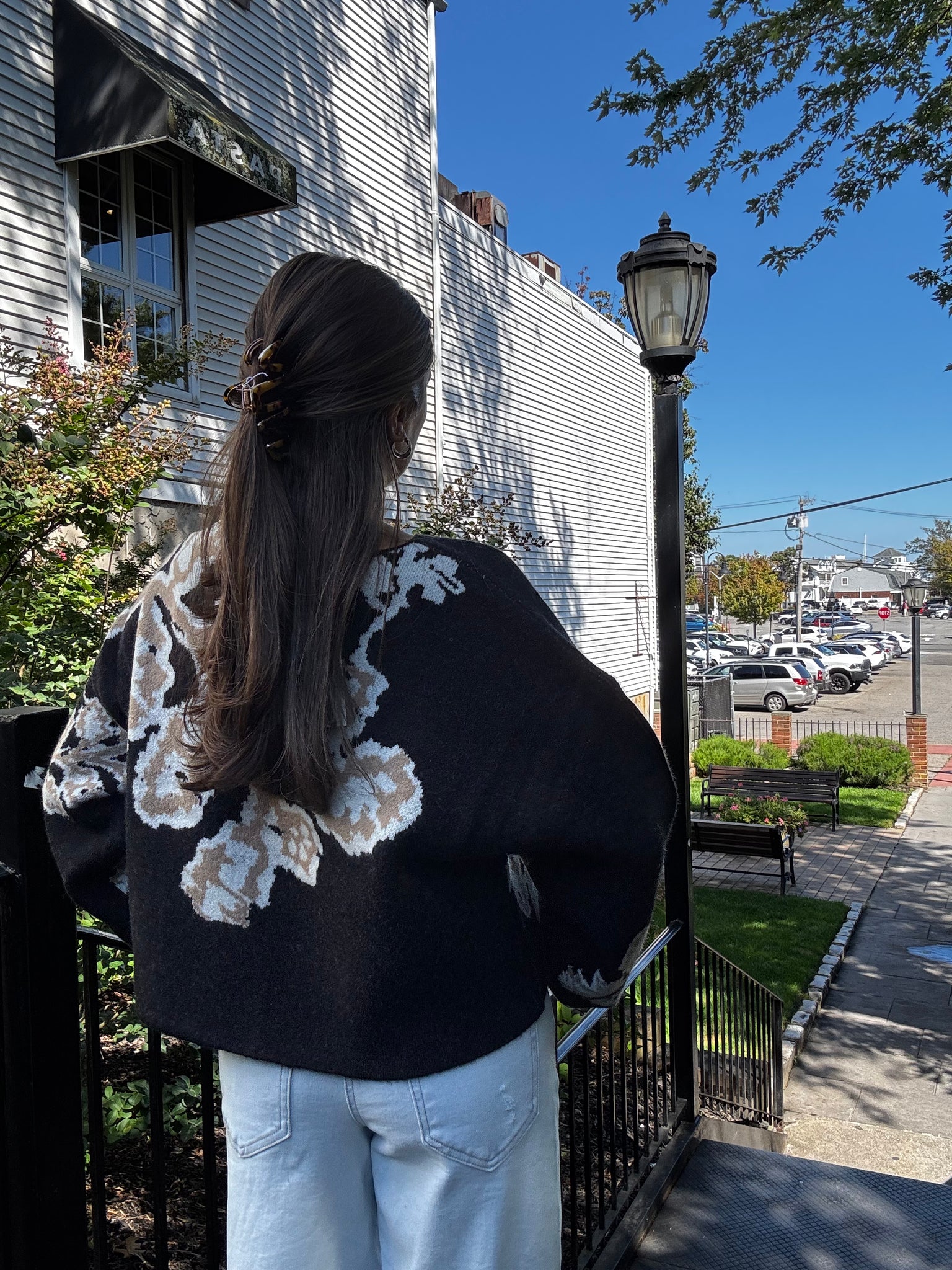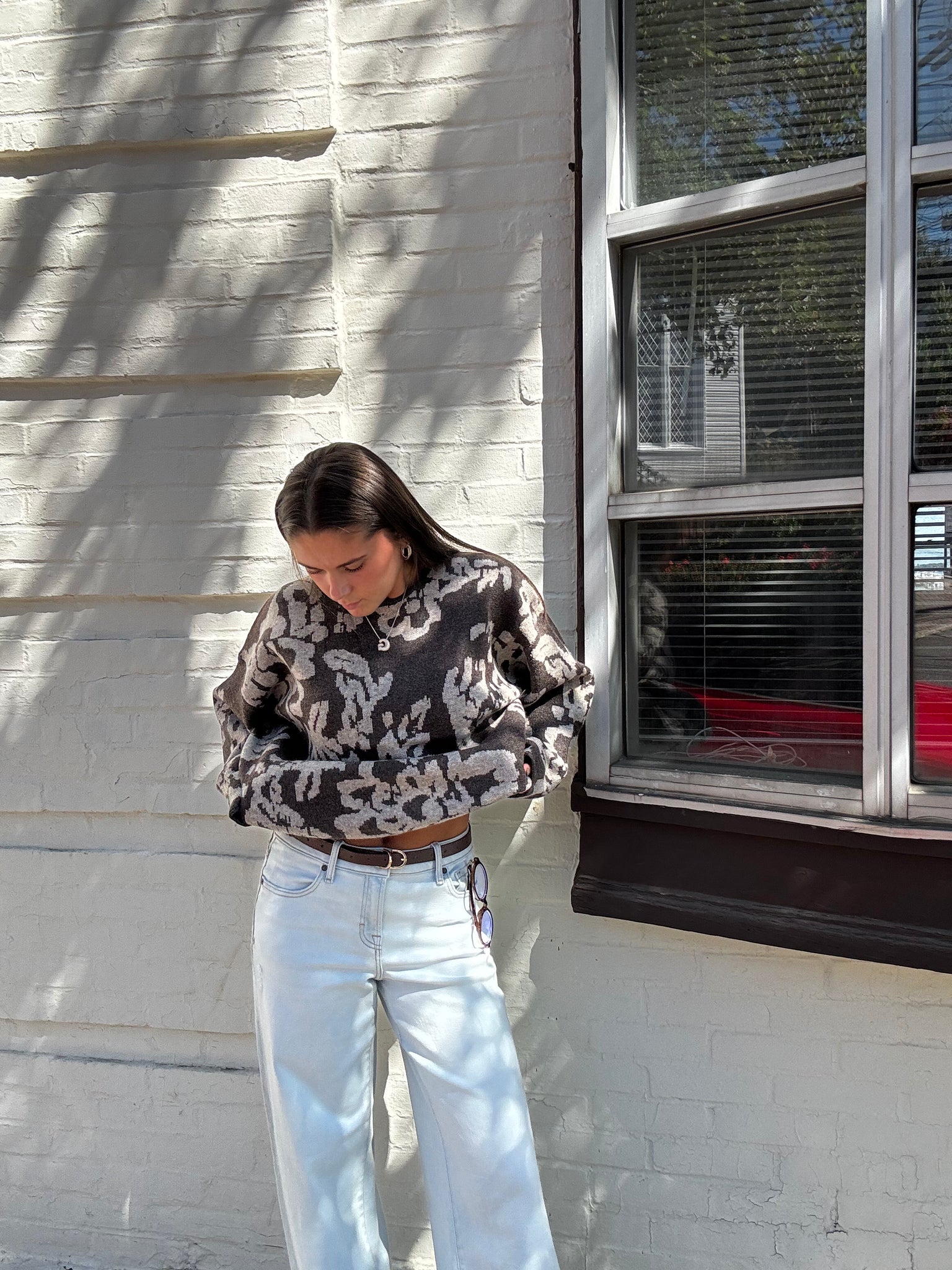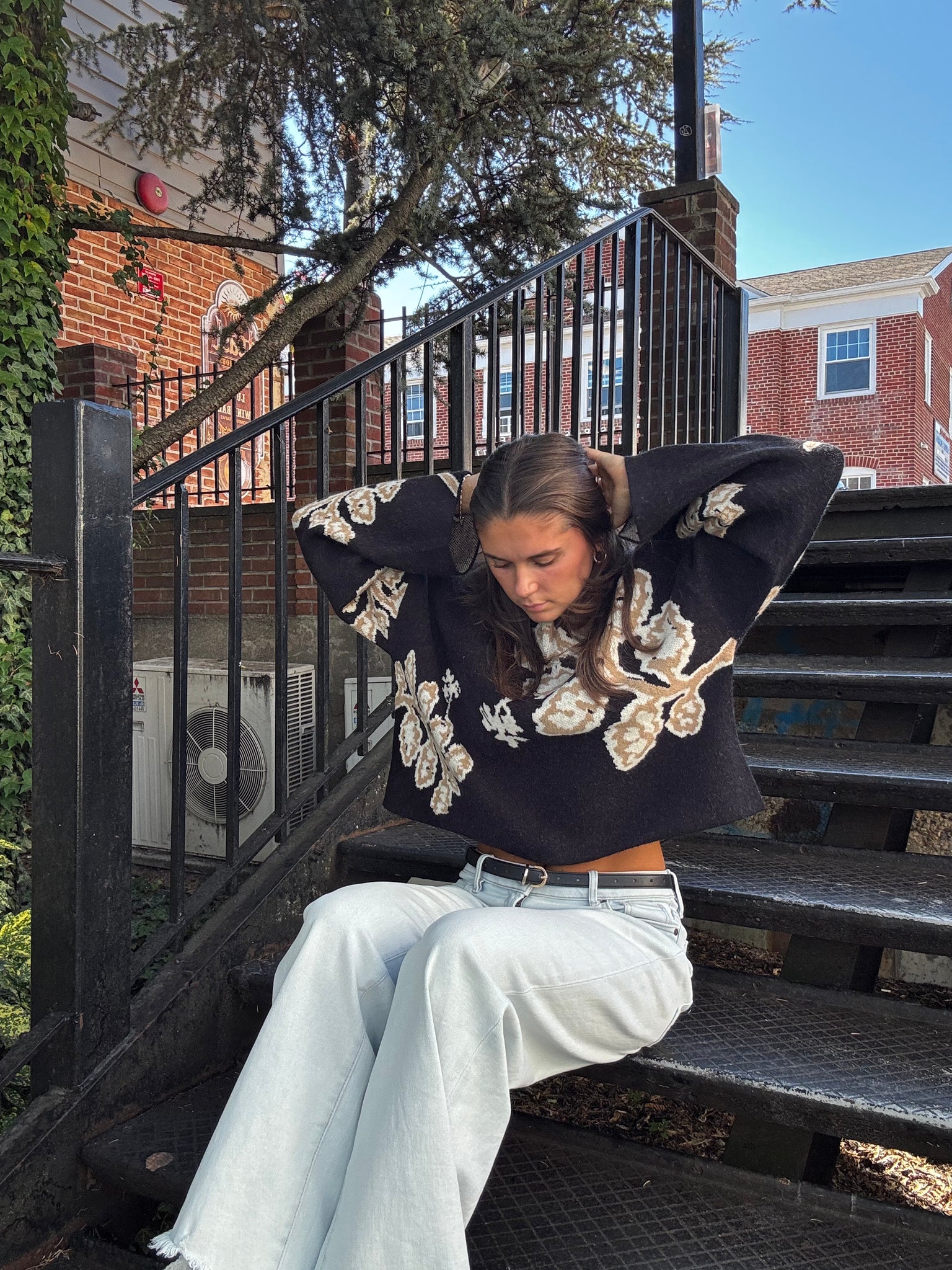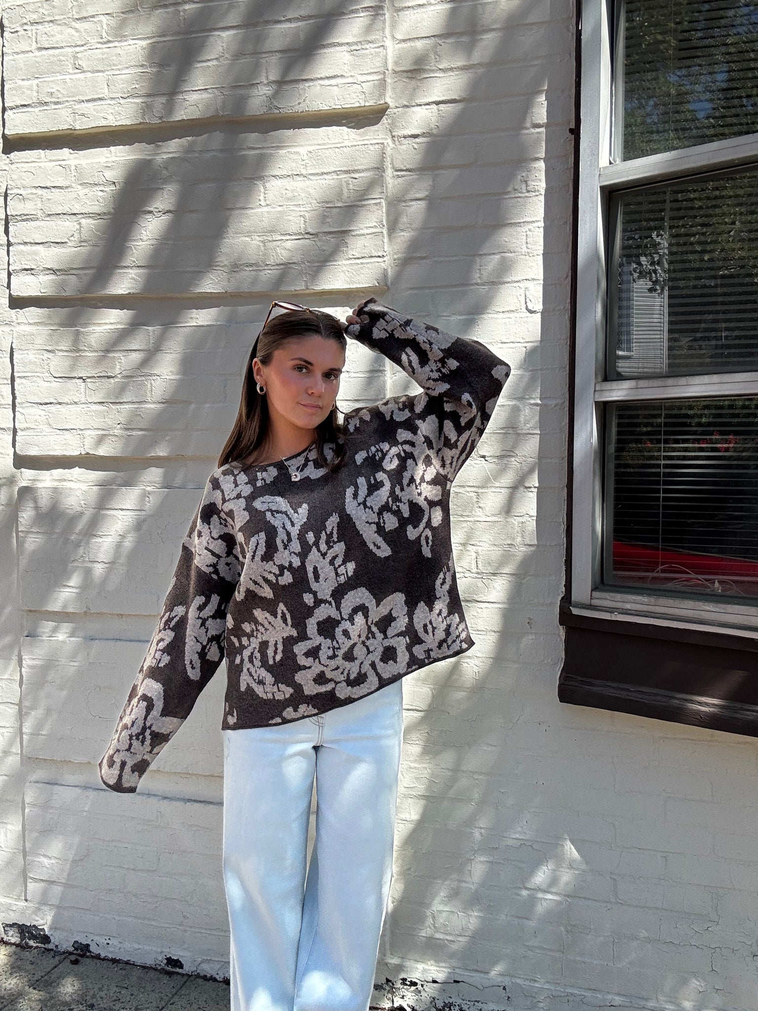 A floral-pattern, jacquard-knit sweater with the following features:Boat neckline.Long sleeves.Drop shoulder.Rolled collar, cuffs, and hem.Loose fit.