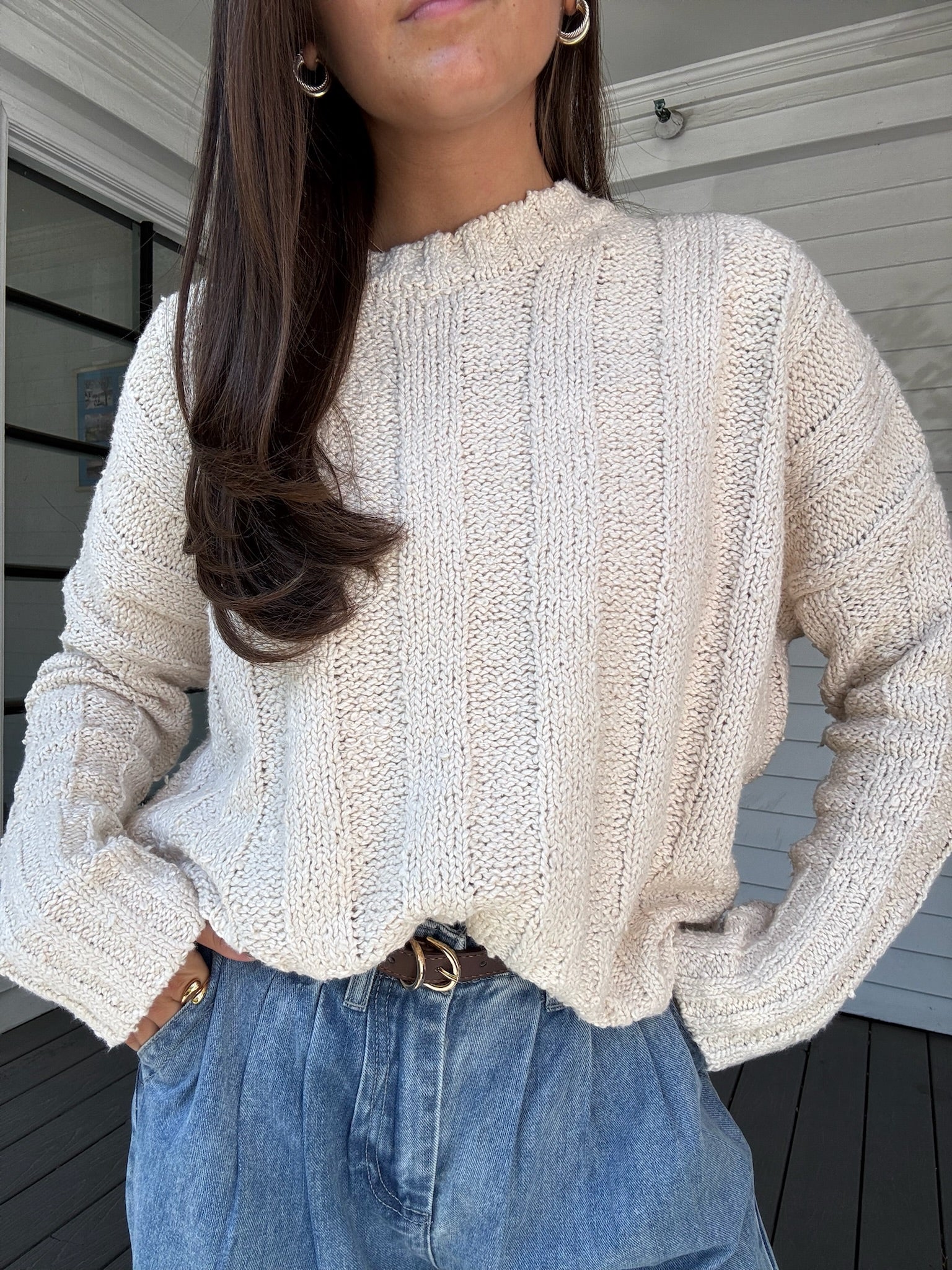 Knit Sweater Cotton Acrylic Wide Ribbed Crew Neck Drop Shoulder Long Sleeve Pullover Top