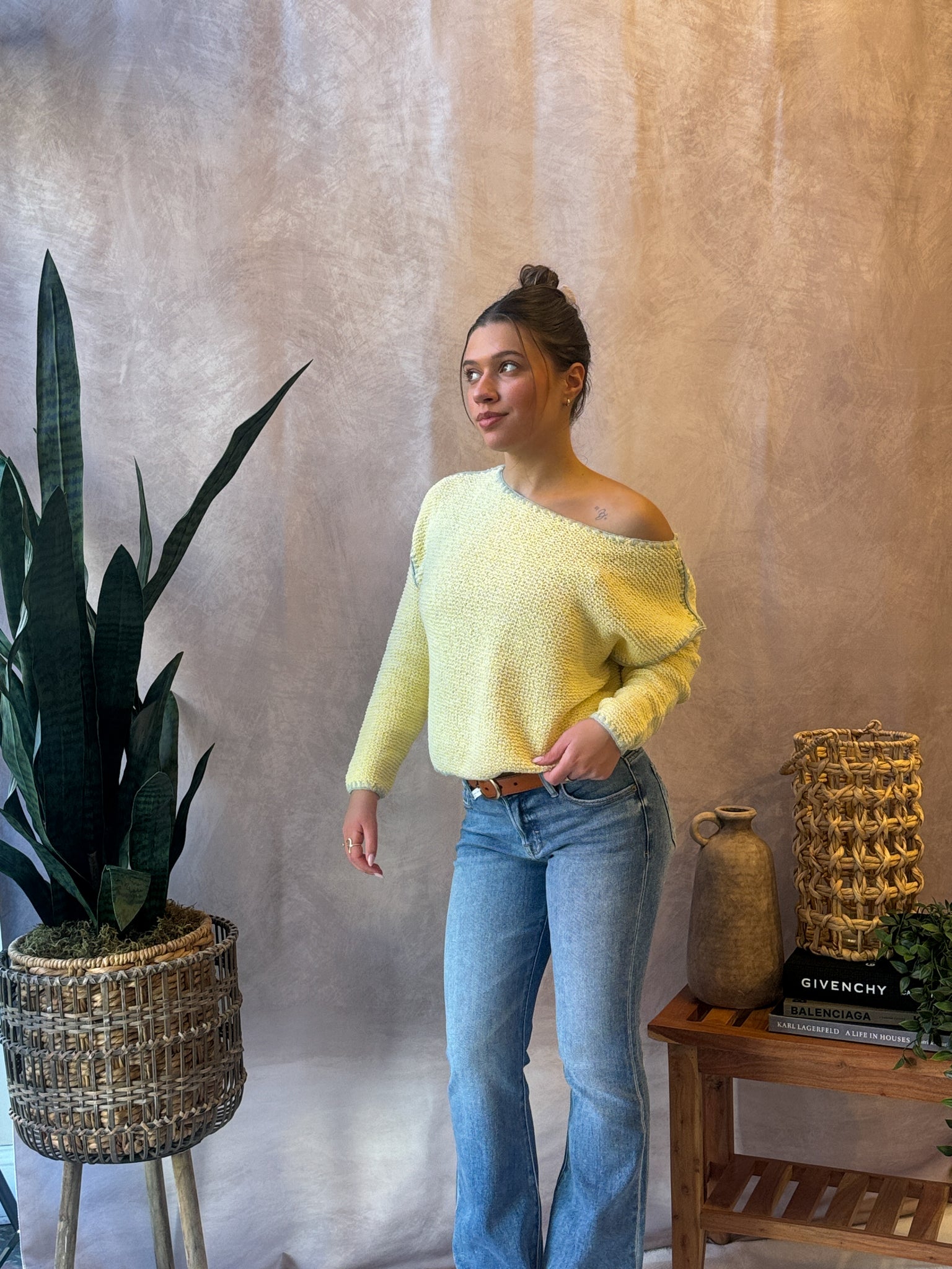 Knit Sweater Cotton Viscose Round Neck Long Sleeve Pullover Top With Stitch Detail