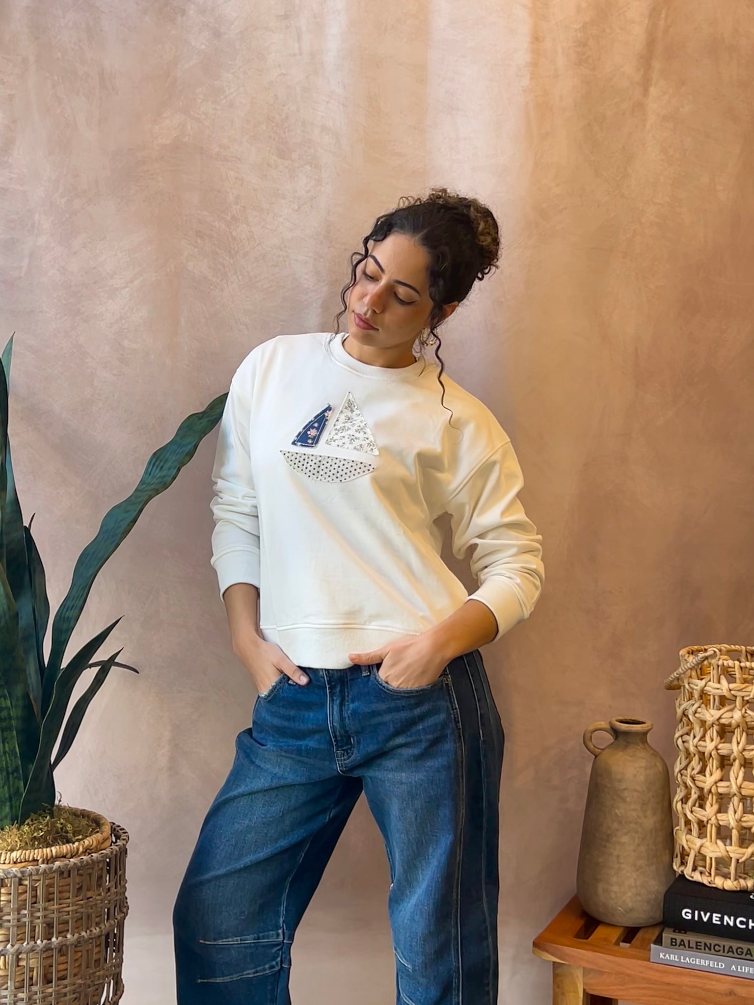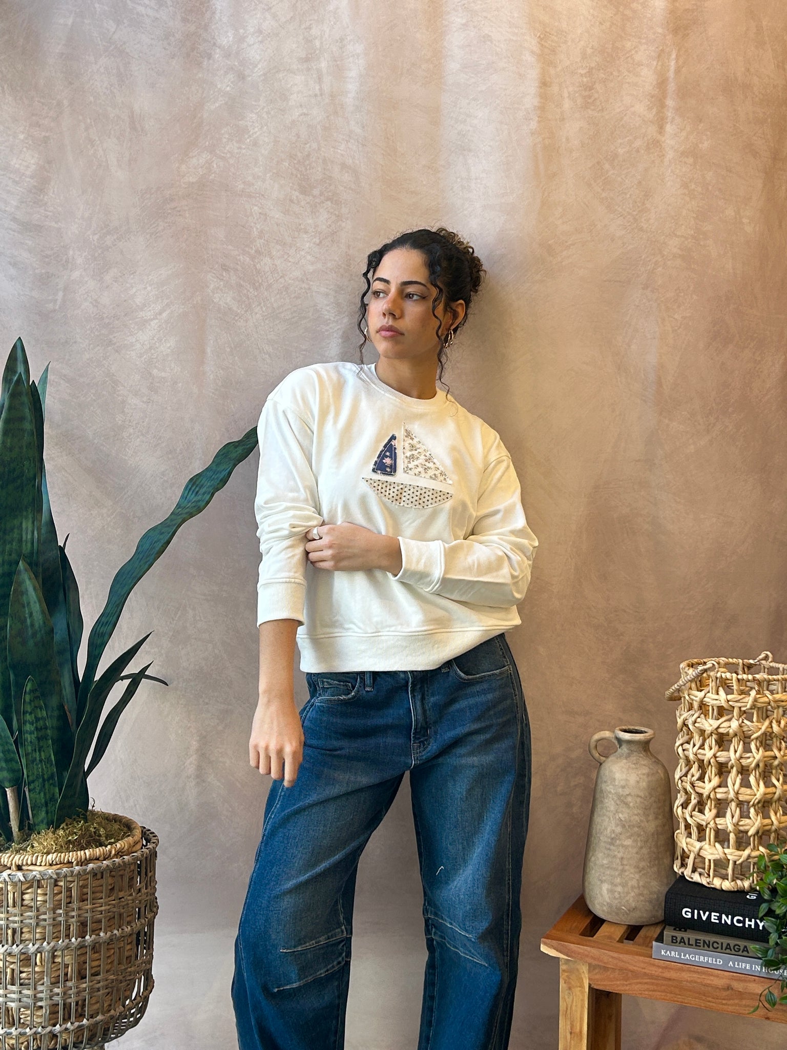 Crewneck sweatshirt with sailboat graphic featuring floral patches