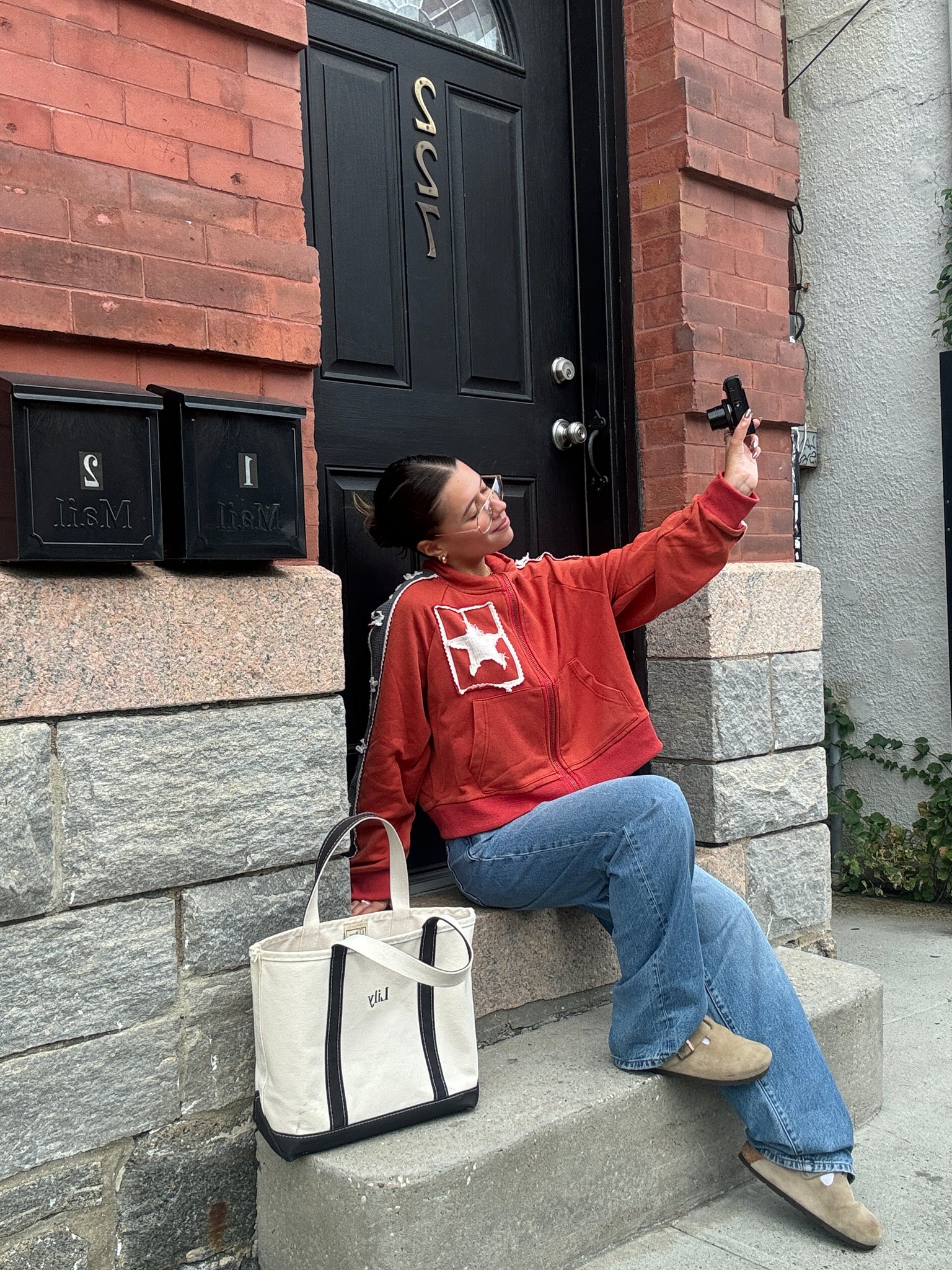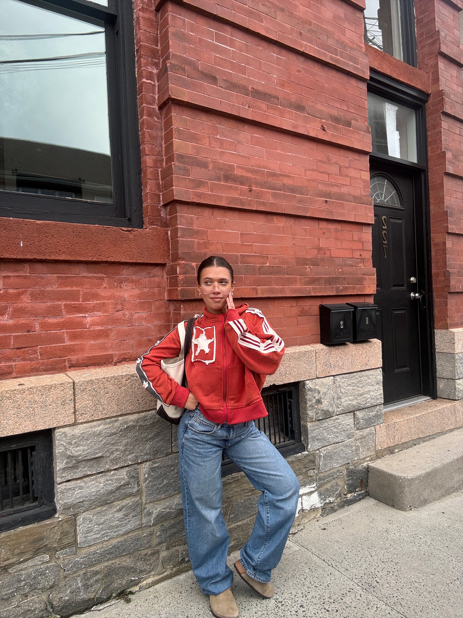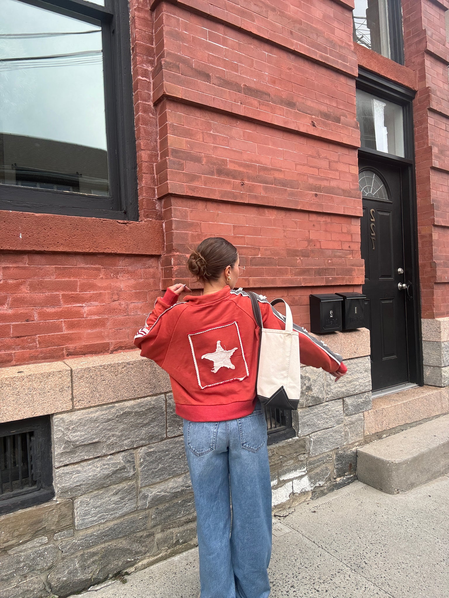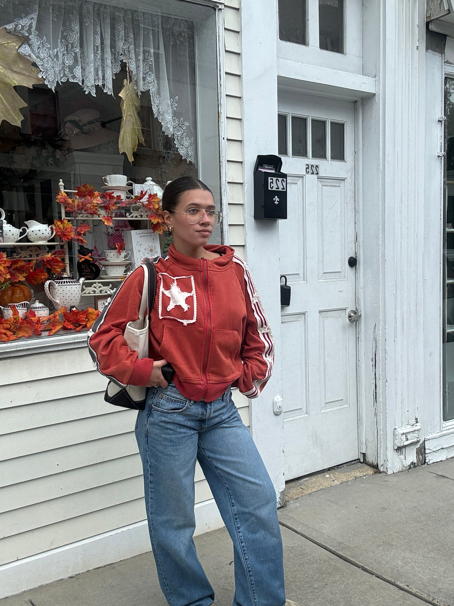 Designed in long sleeve roomy fit jacket in French terry with varied striped elastic and thermal trim tape, lace-bordered accents, and star patch detailing.
