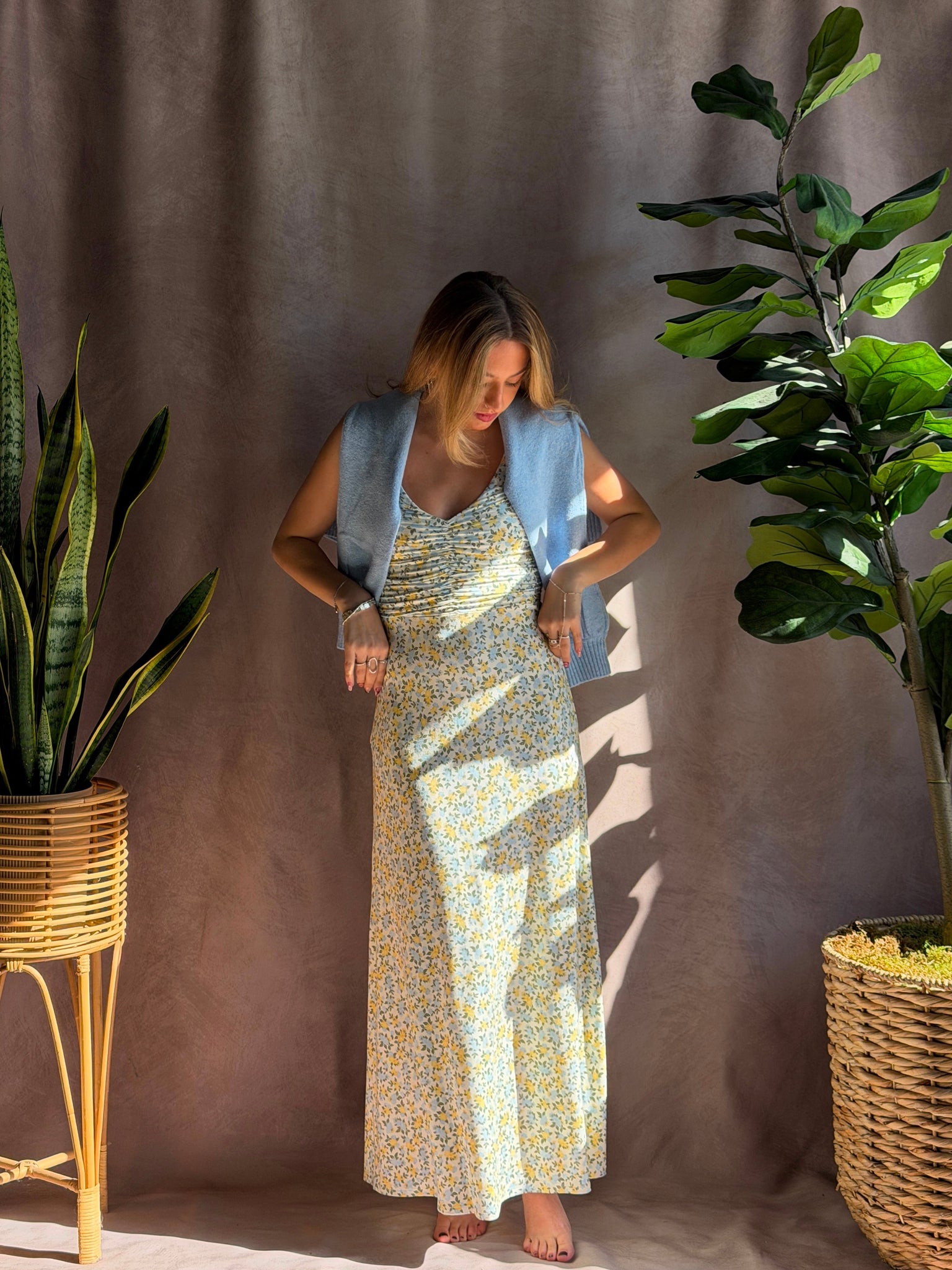 Comfort meets chic with this incredibly soft maxi dress. With adjustable straps, a shirred bodice, and flattering v-neck, this ditsy floral print dress is sure to be a new favorite in your closet.