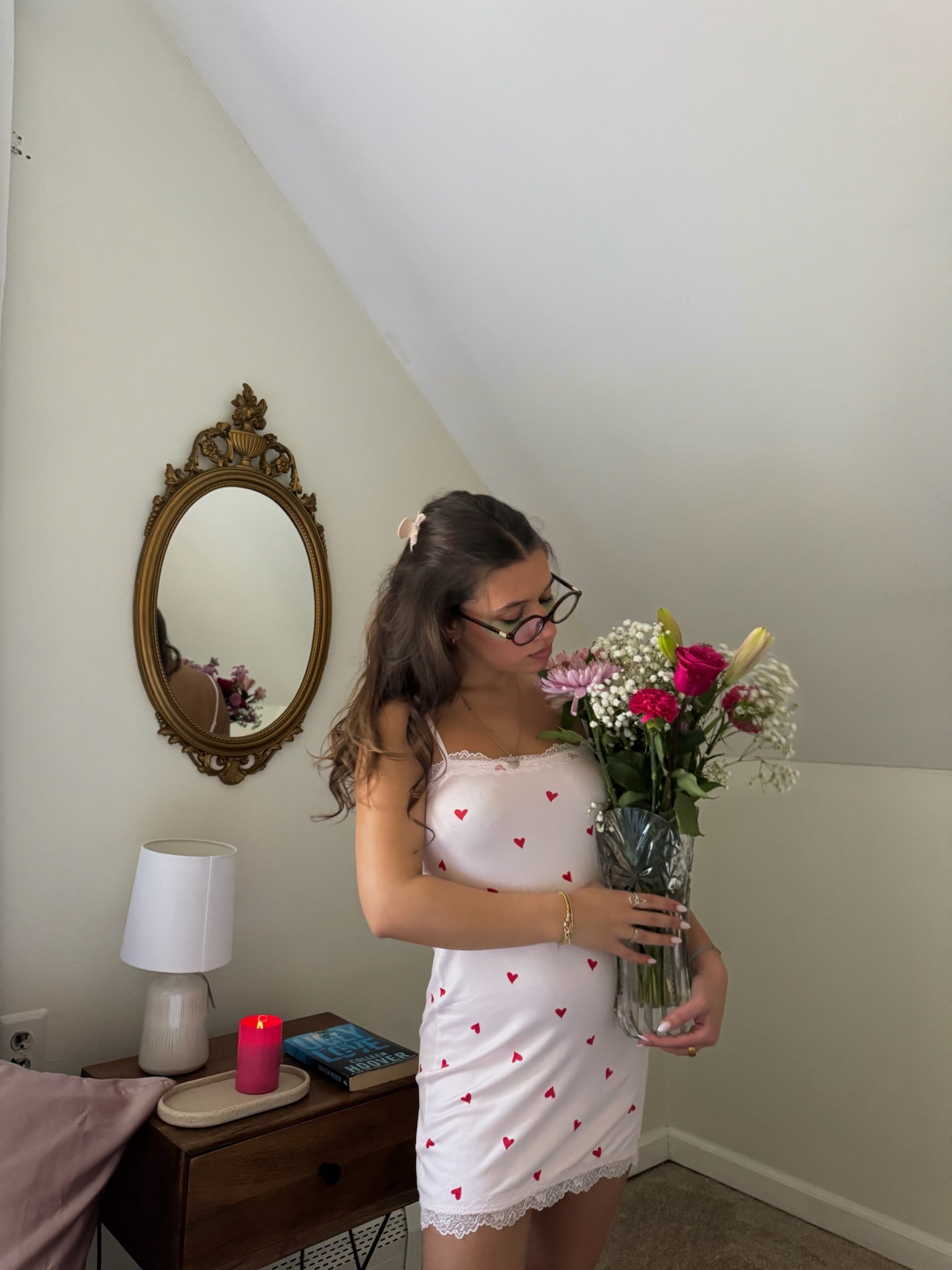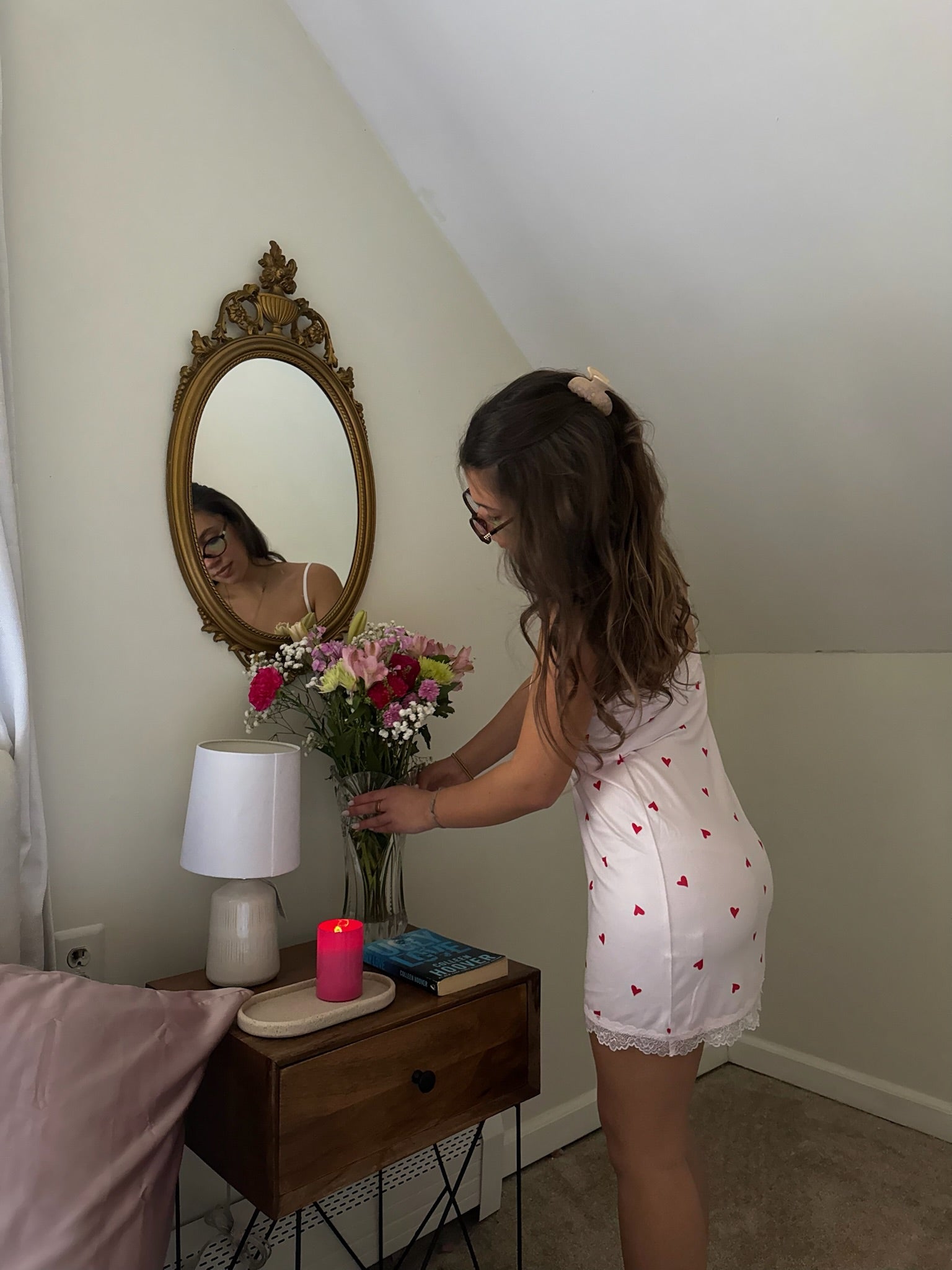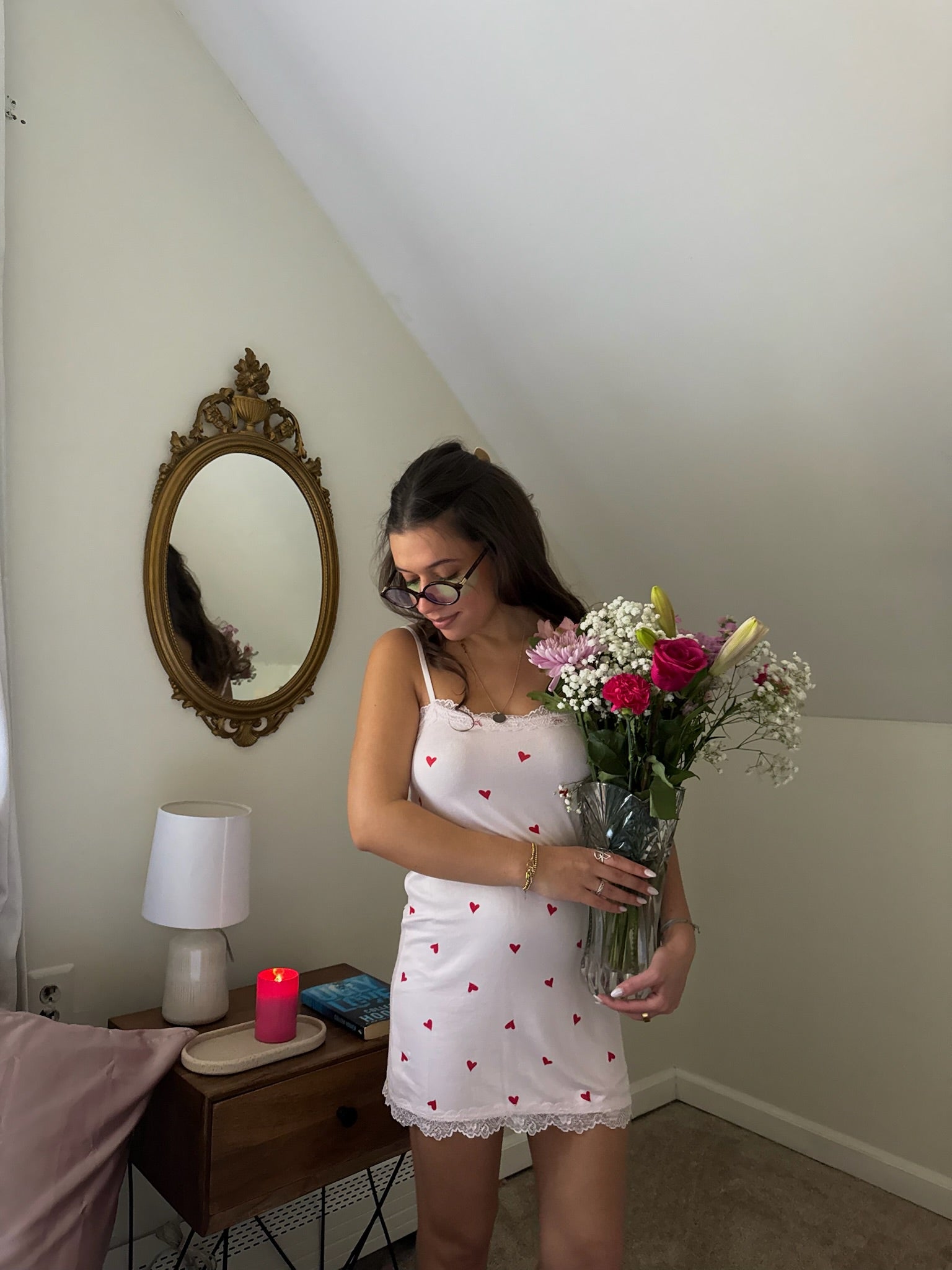 This silky jersey chemise feels smooth and breathable with a playful allover heart print. Adjustable straps and a relaxed silhouette make it the perfect piece for sleeping, lounging, or gifting.