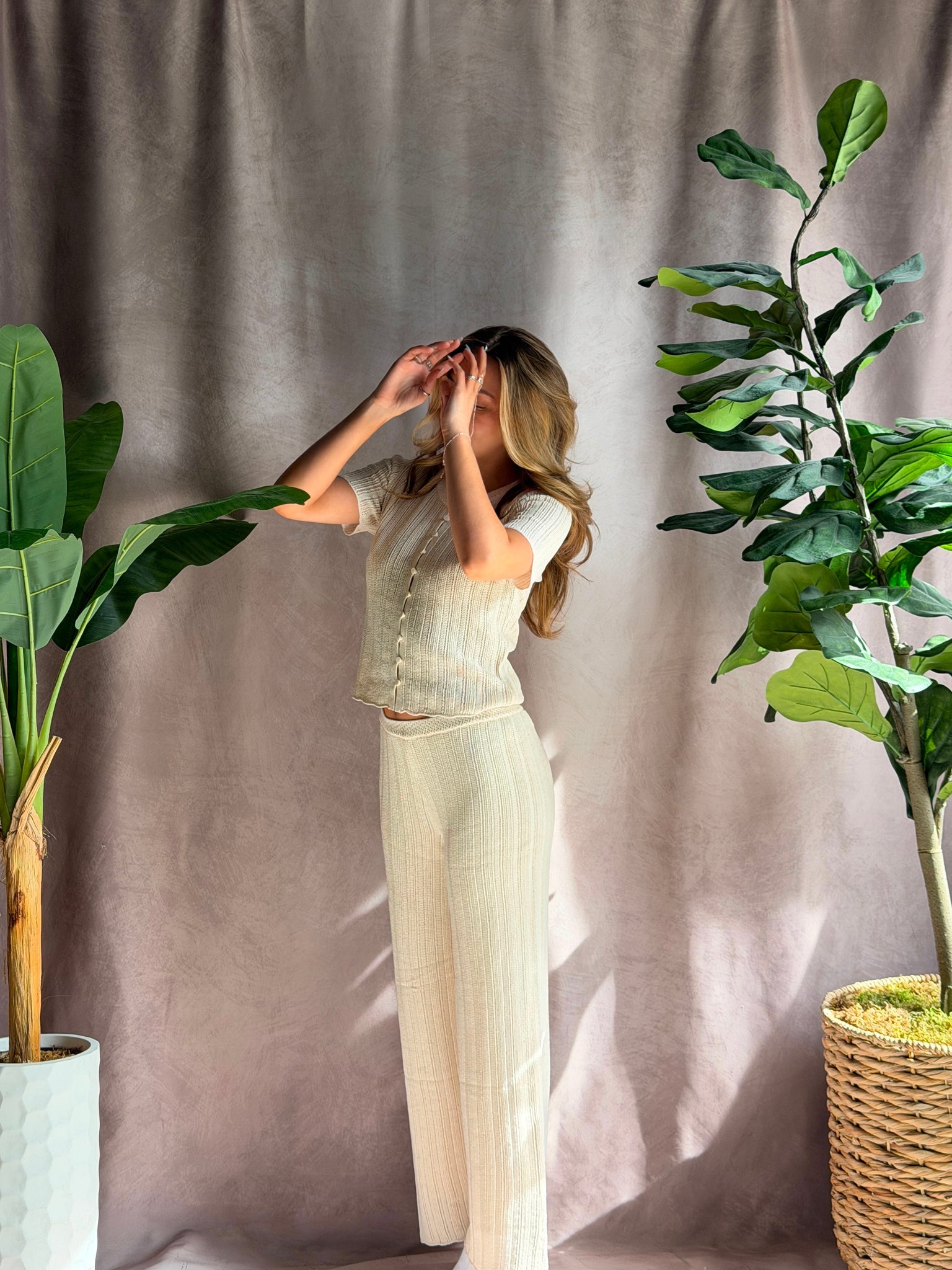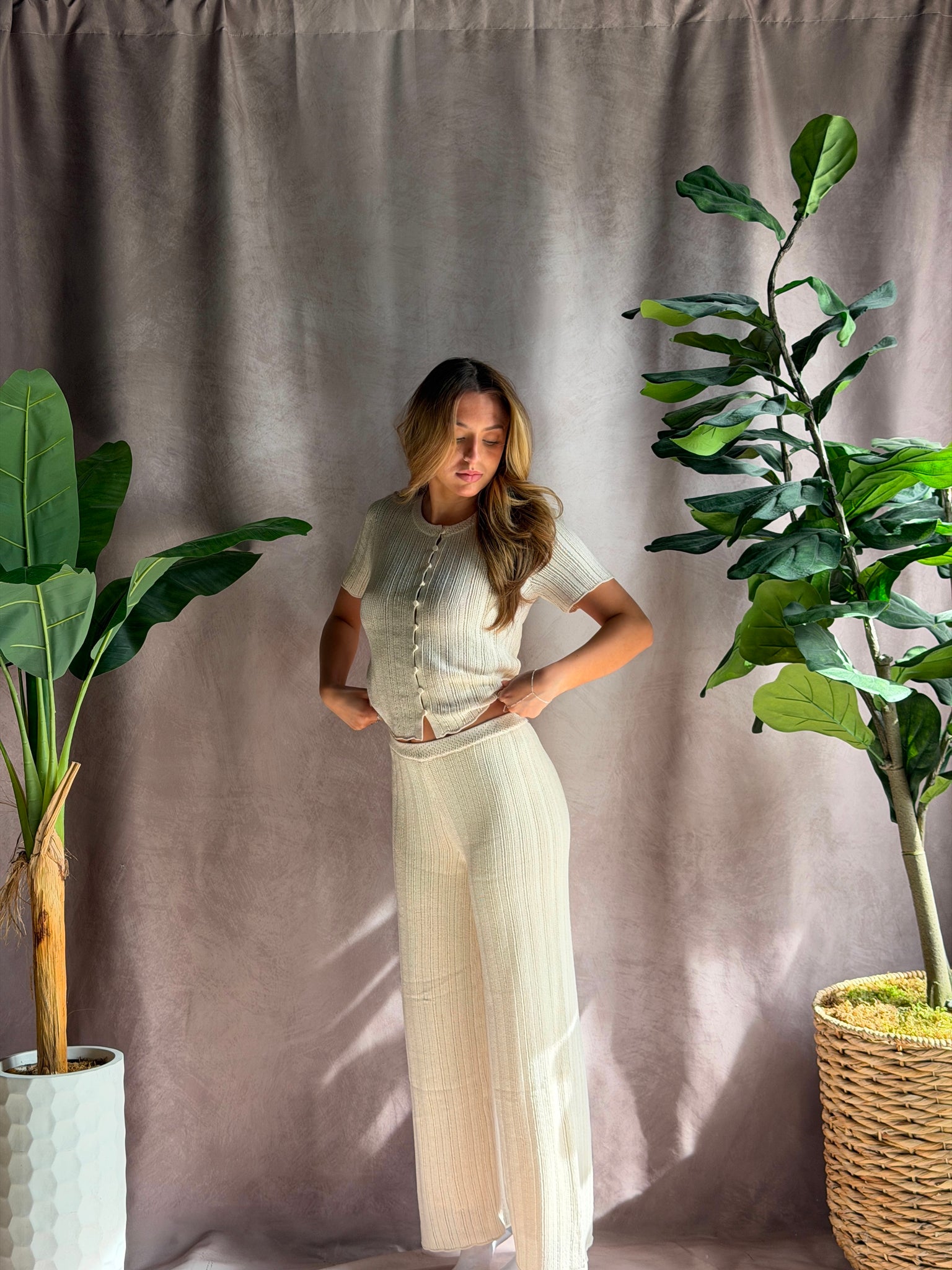 Lightweight and airy, this crochet short sleeve top features a loop button front and soft feminine texture. Easy to style with denim or pair back to the matching pant for a coastal cool moment.